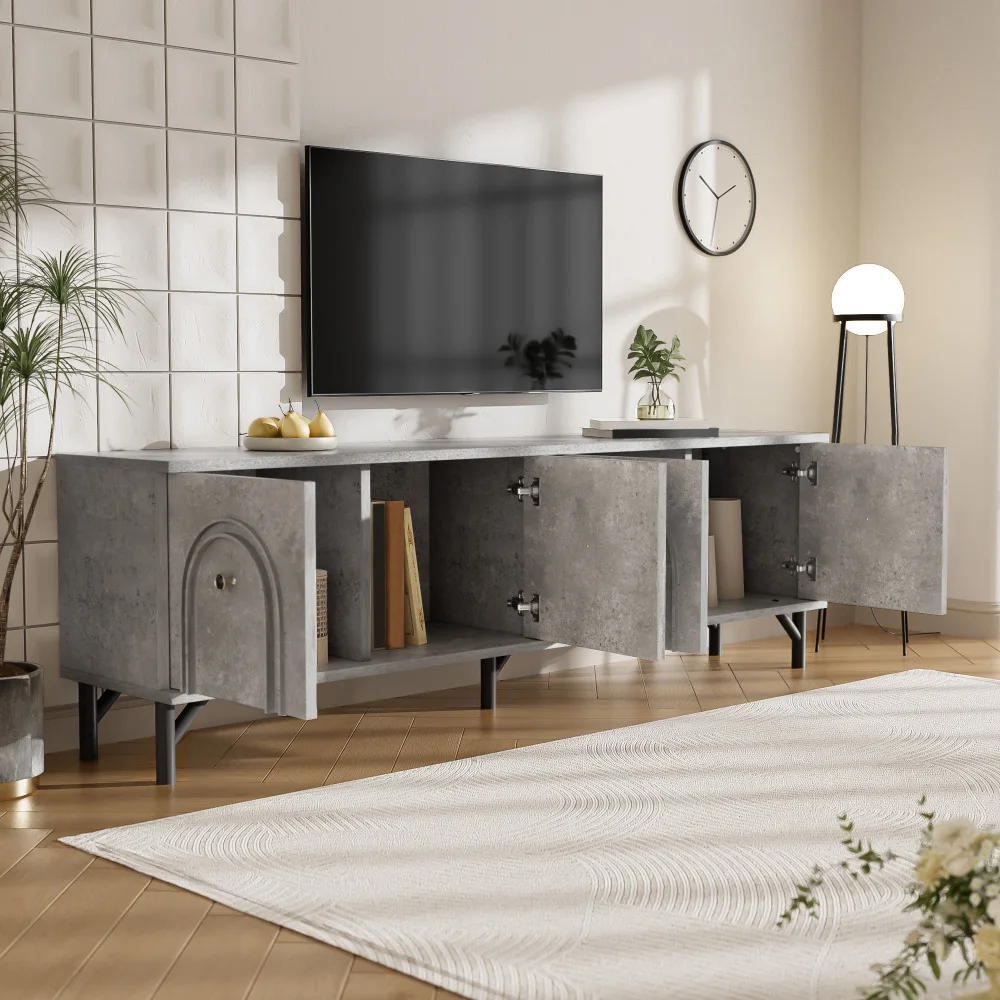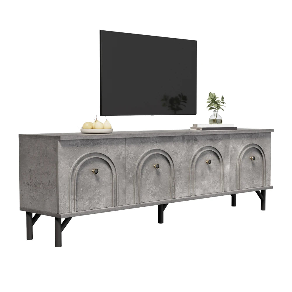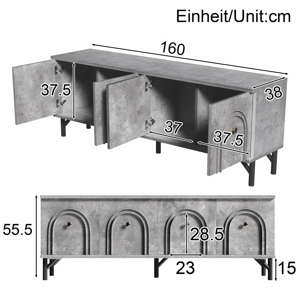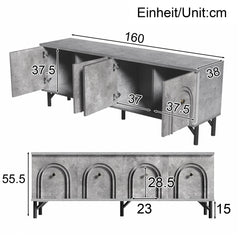 Dieses moderne graue 4-türige TV-Board vereint elegantes Design mit hoher Funktionalität und bietet eine stilvolle Lösung für Ihr Entertainment-Setup. Mit einer Breite von 160 cm, einer Tiefe von 38 cm und einer Höhe von 55,5 cm ist es ideal für Wohnzimmer und TV-Bereiche geeignet. Das herausragende Merkmal dieses TV-Schranks ist die einzigartige 3D-Bogenfront, die mit sanften Rundungen eine raffinierte Optik schafft. Die vier Türen sind mit hochwertigen Soft-Close-Scharnieren ausgestattet, die ein geräuschloses und sanftes Schließen ermöglichen. Ein praktisches Detail ist die Kabeldurchführung in der Rückwand, die eine einfache und ordentliche Kabelführung für Ihre elektronischen Geräte gewährleistet. Dieses TV-Board überzeugt durch ein schlichtes und dennoch luxuriöses Design, das sich nahtlos in verschiedene Einrichtungsstile einfügt. Es bietet nicht nur eine praktische Aufbewahrungslösung, sondern verleiht Ihrem Wohnraum auch eine stilvolle Note.