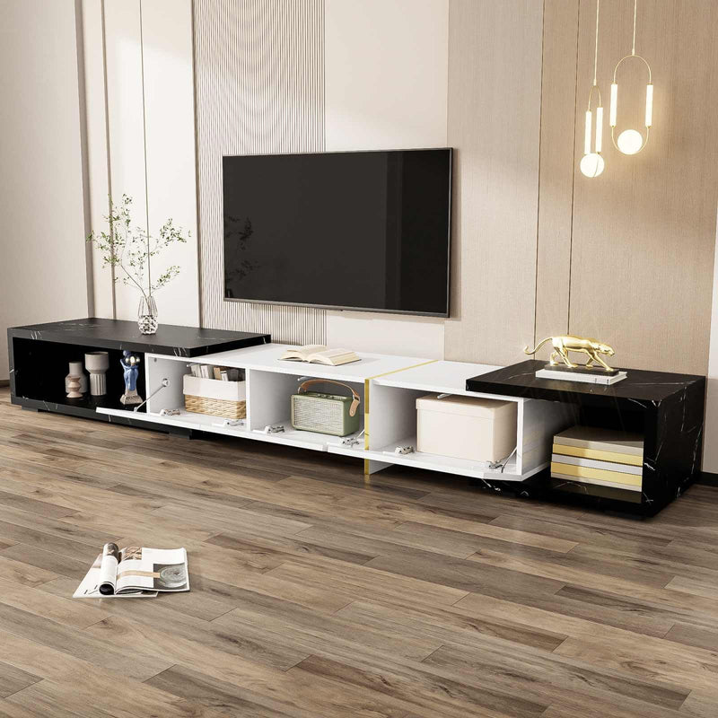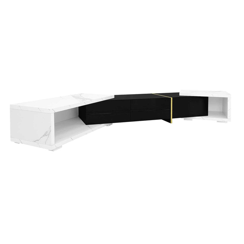 - DESIGN FLEXIBLE : ce meuble TV est conçu de manière unique pour ajuster la longueur et l'angle du meuble en fonction des préférences ou des besoins personnels, offrant ainsi une grande flexibilité. Que vous souhaitiez modifier l'angle de vision ou adapter la disposition à un nouveau décor, ce meuble TV répondra à vos besoins.