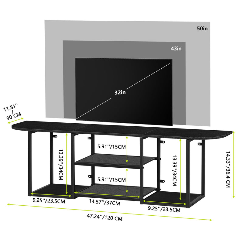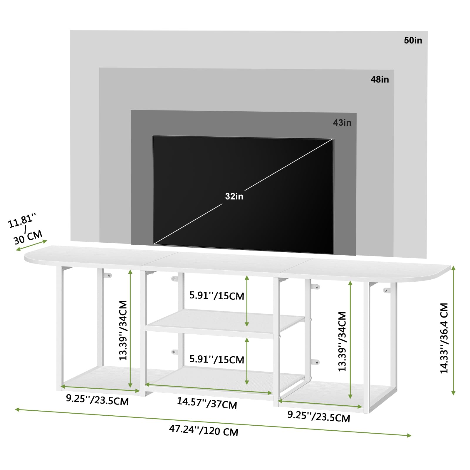 - Dimensions (L x l x H) : 120 x 30 x 36,4 cm. Les étagères ouvertes s'adaptent aux consoles de jeux, aux barres de son et à la décoration, ainsi qu'aux appareils électroniques légers et petits. Sa conception proportionnelle assure la stabilité et l'intégration parfaite dans les installations de salon standard, avec dégagement pour la ventilation et la gestion des câbles.