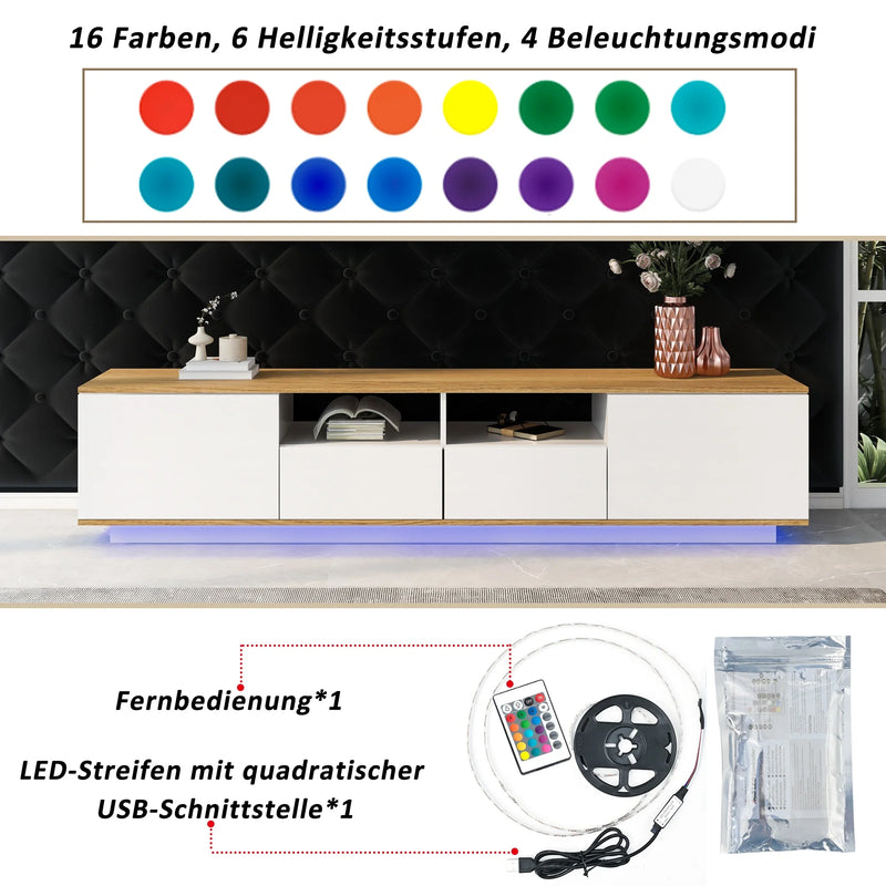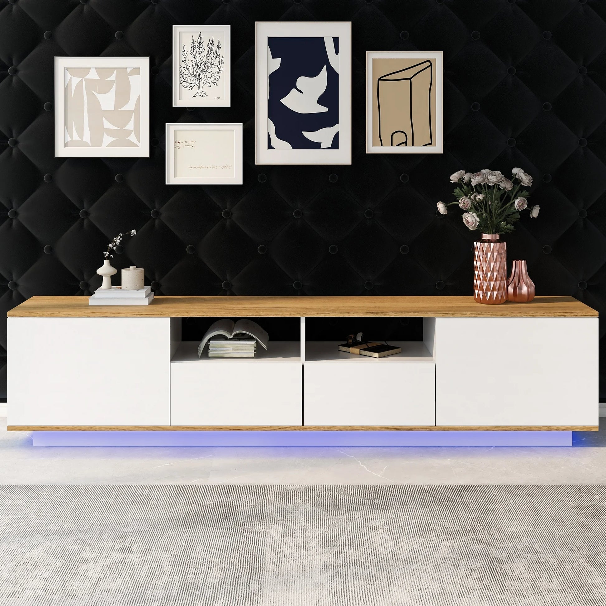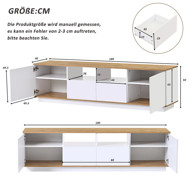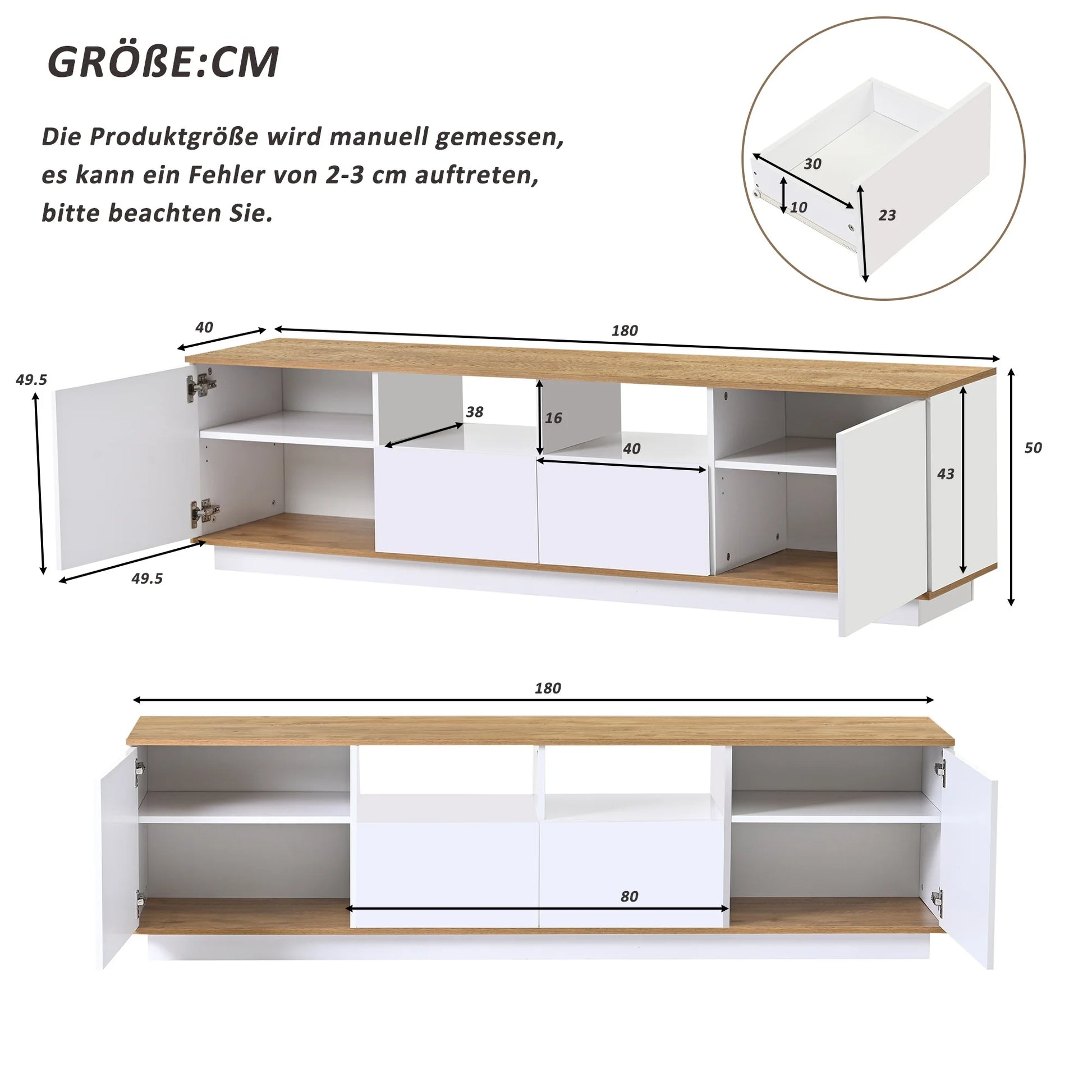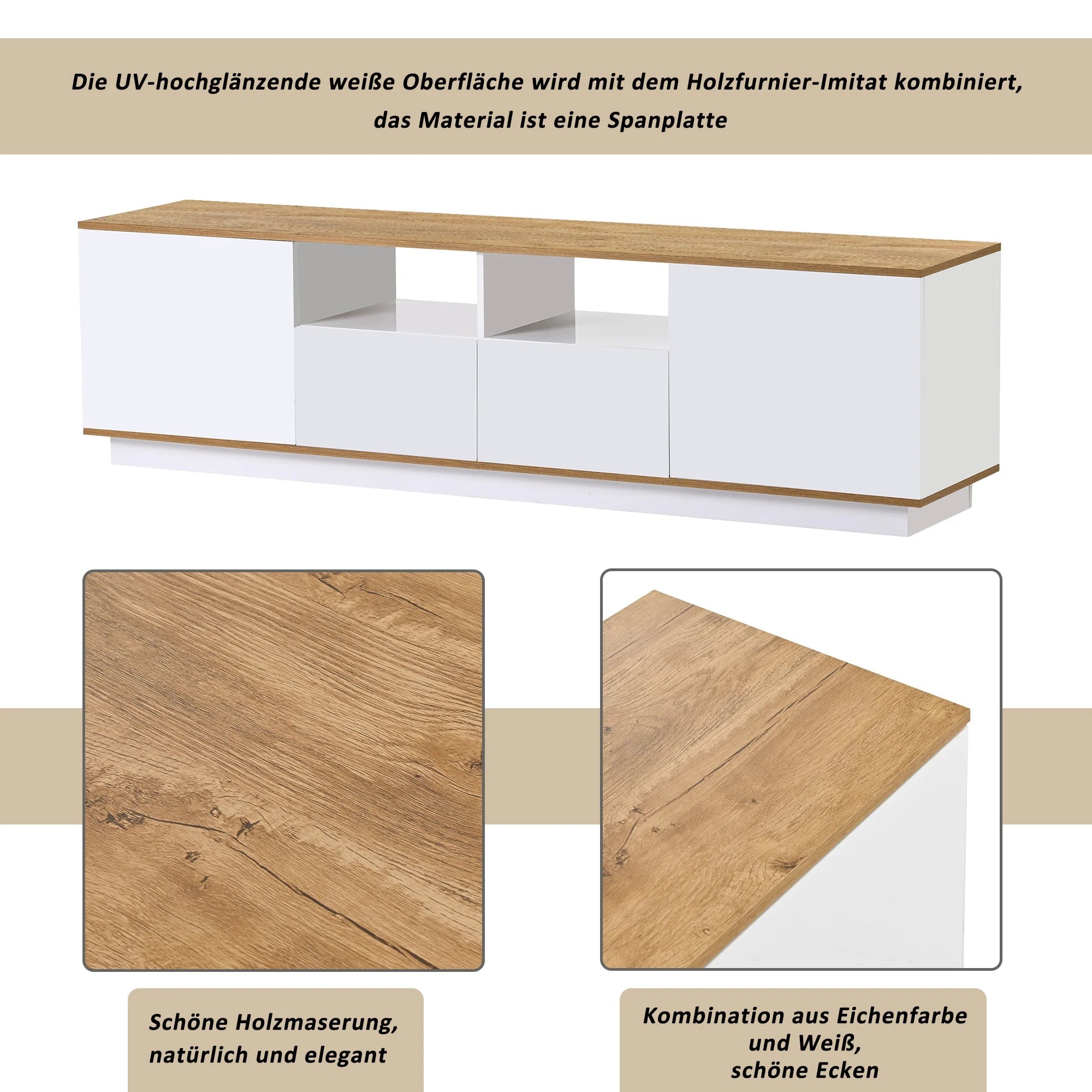 Robust construction: This TV stand features a glossy white wardrobe and a working plate in solid wood color, which is not only safe and environmentally friendly, but also has a good load-bearing capacity on the desk. It is made of class E1 chipboard for a long life. Plenty of storage space: This 80-inch TV stand has two cabinets, 2 drawers and 2 open shelves where DVDs, video game systems, cable boxing, books, magazines and other daily necessities can be freely placed to blankets your storage needs.