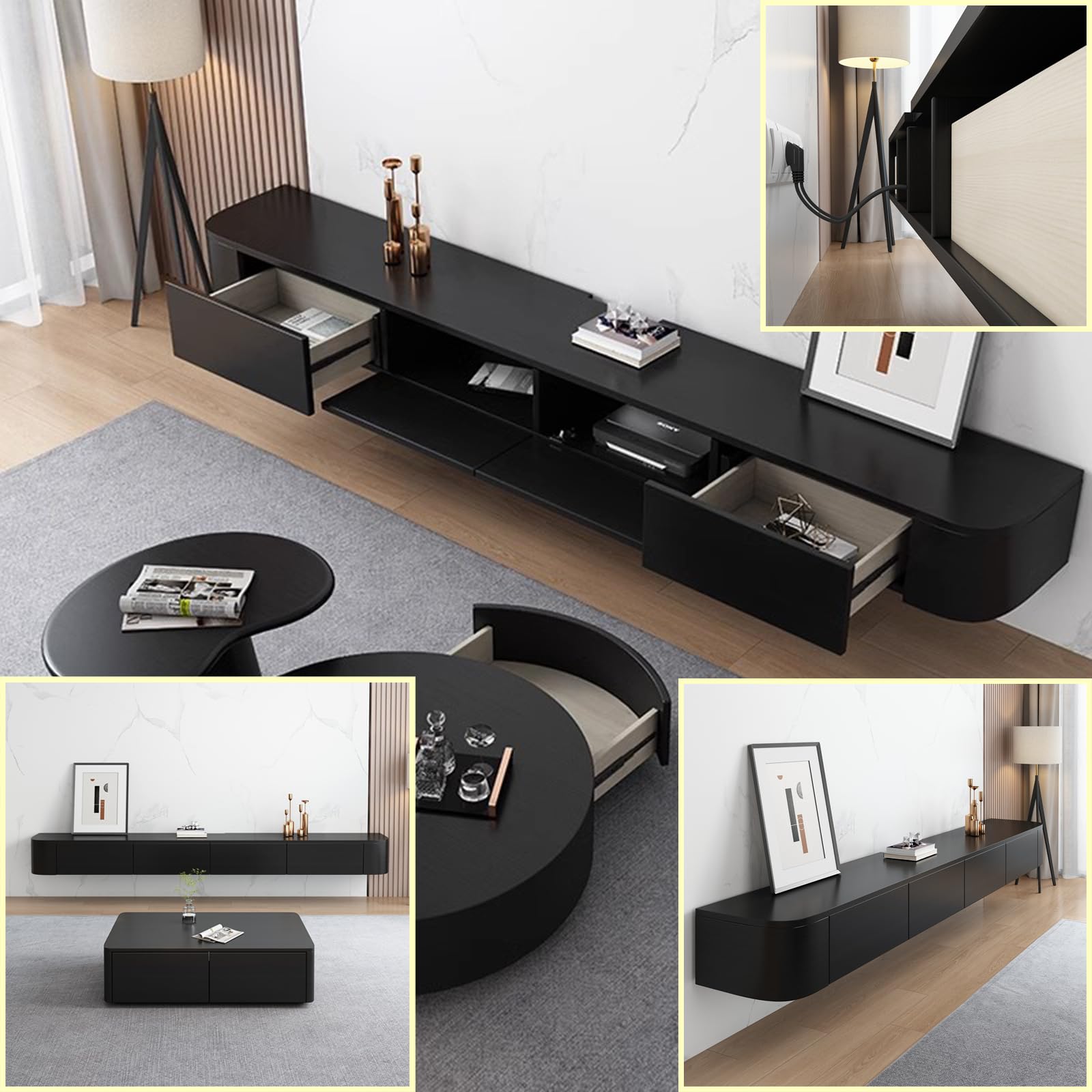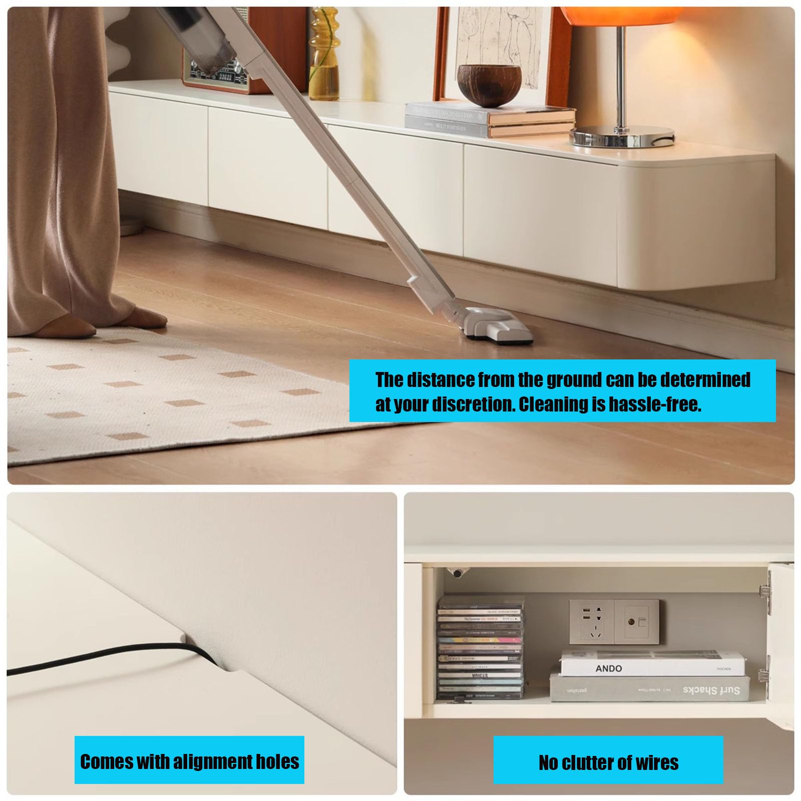 - Support TV suspendu à installer comme vous le souhaitez : vous pouvez choisir la hauteur selon vos besoins, prévoyez un espace libre en dessous pour un nettoyage facile.