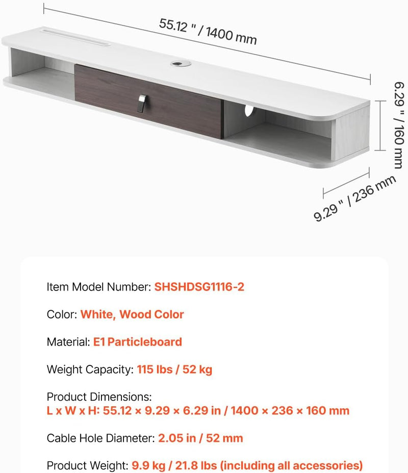 - Robuste et durable : Fabriqué en panneaux de particules de qualité E1 avec une finition en mélamine, ce meuble TV flottant est conçu pour durer. Il peut supporter jusqu'à 52 kg, ce qui le rend idéal pour votre téléviseur et autres appareils. Robuste et durable, il préservera l'aspect impeccable de votre installation pendant des années
