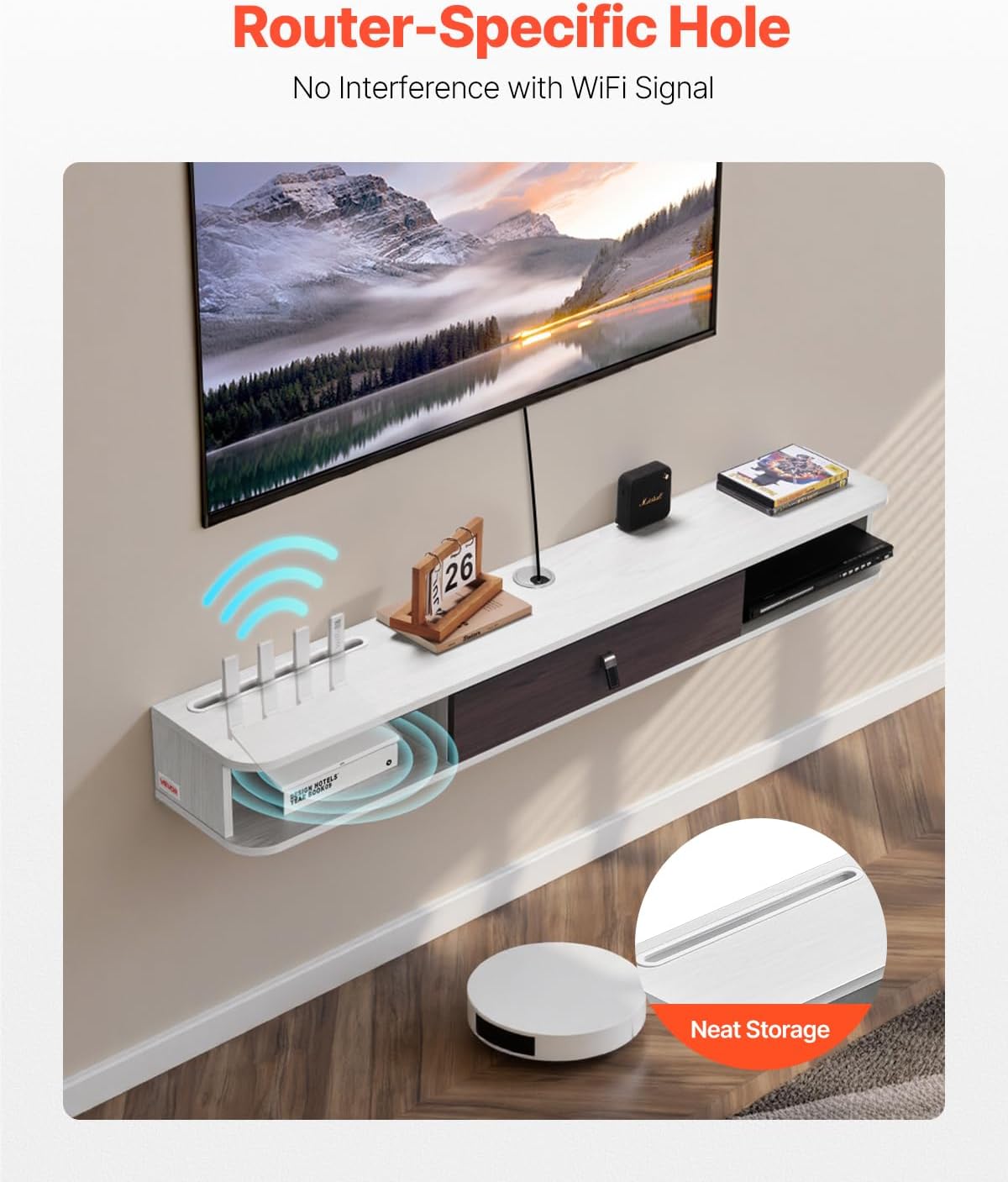 - Rangement organisé : Gardez chaque chose à sa place grâce au trou dédié au routeur, idéal pour ranger vos appareils tout en assurant un signal Wi-Fi puissant. Cet espace de rangement multifonctionnel peut accueillir livres, routeurs, décodeurs et bien plus encore, vous permettant ainsi de créer un espace ordonné et épuré