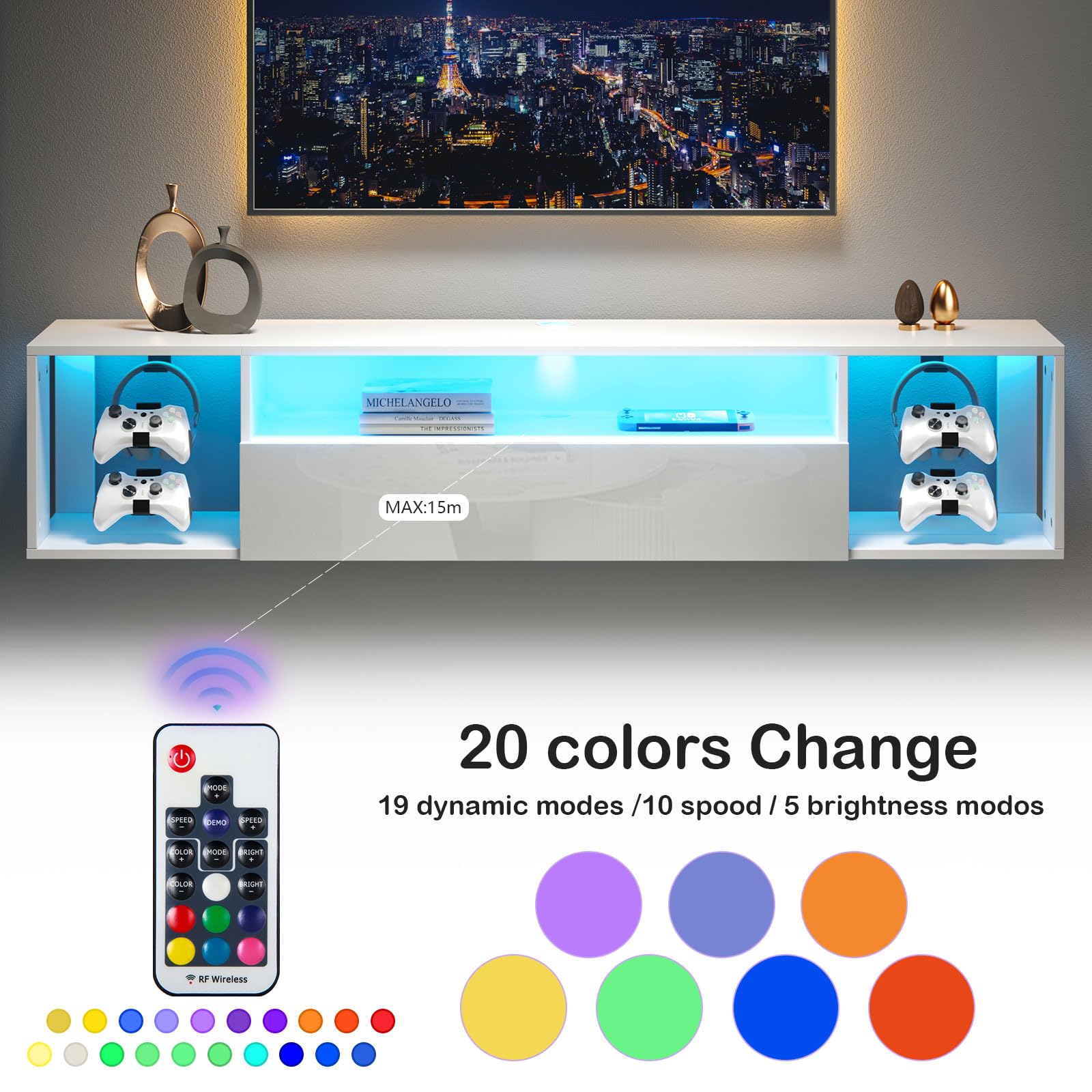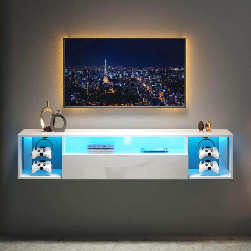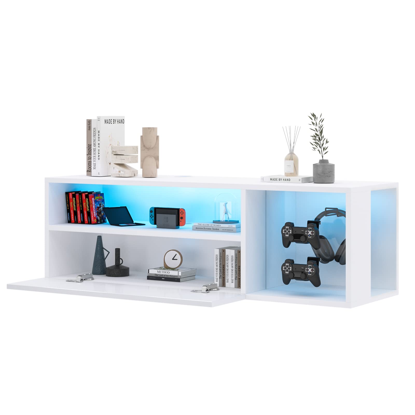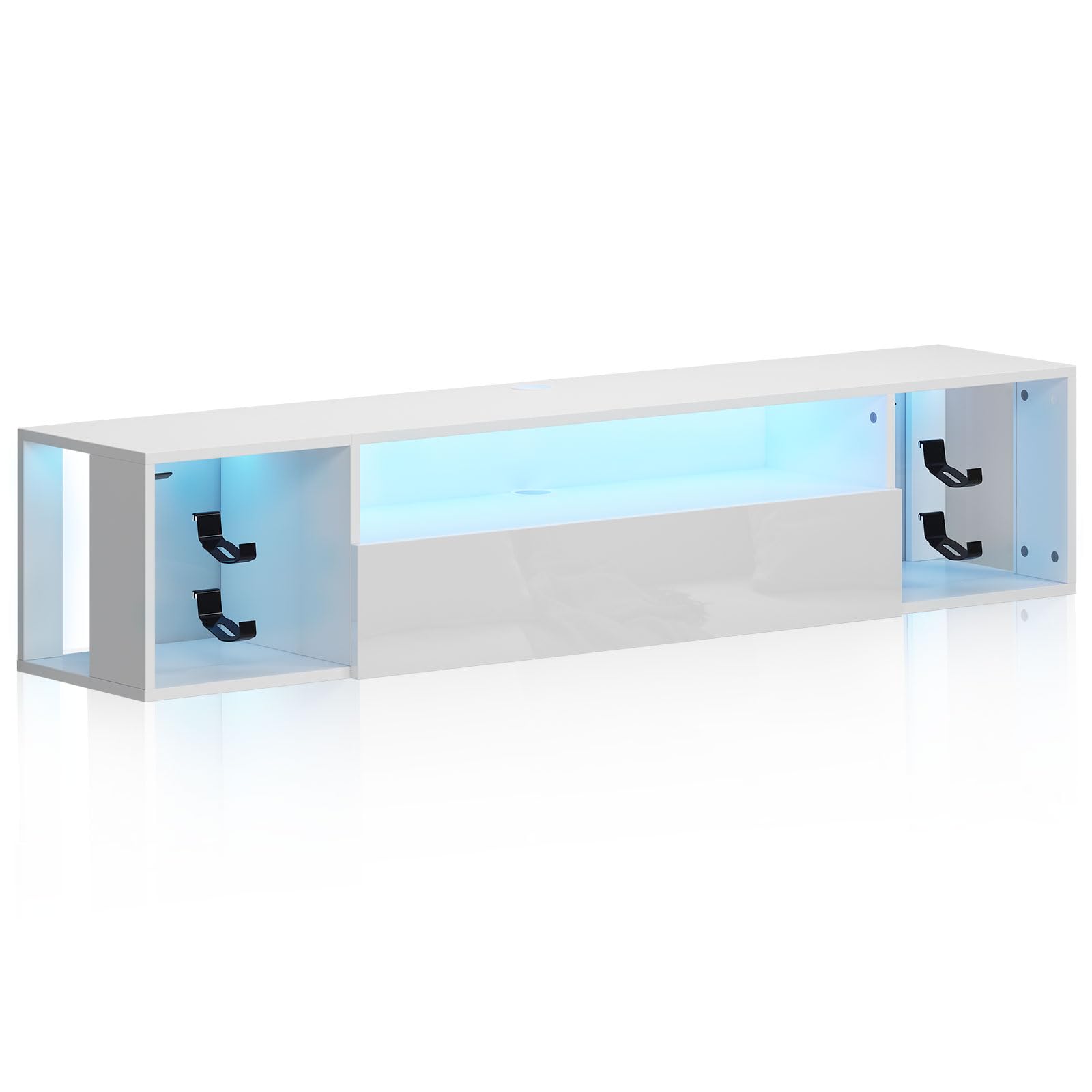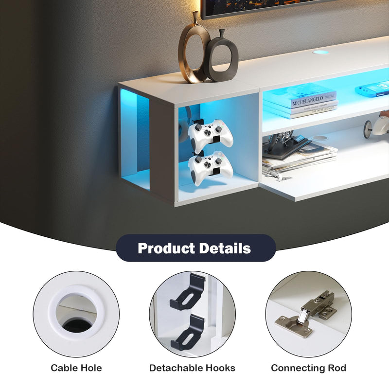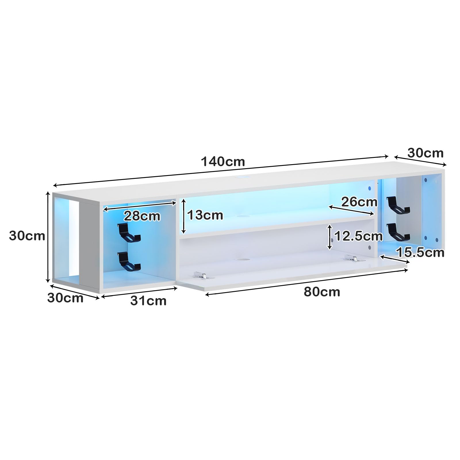 - 🔹 Meuble TV mural robuste et durable – Fabriqué en panneaux de particules, ce meuble TV suspendu est à la fois solide et résistant. Les portes abattantes sont dotées d'une finition UV ultra-brillante, offrant un aspect élégant et une protection supplémentaire contre l'usure.