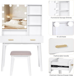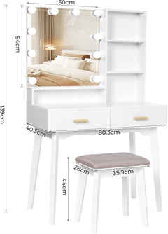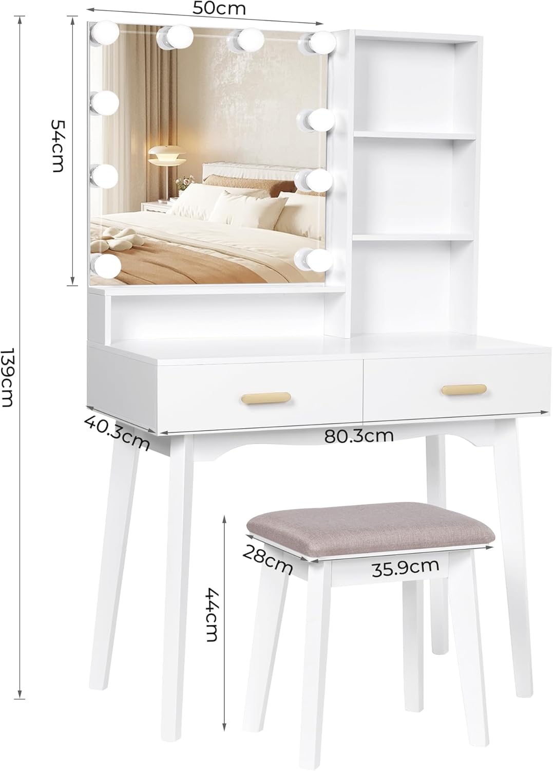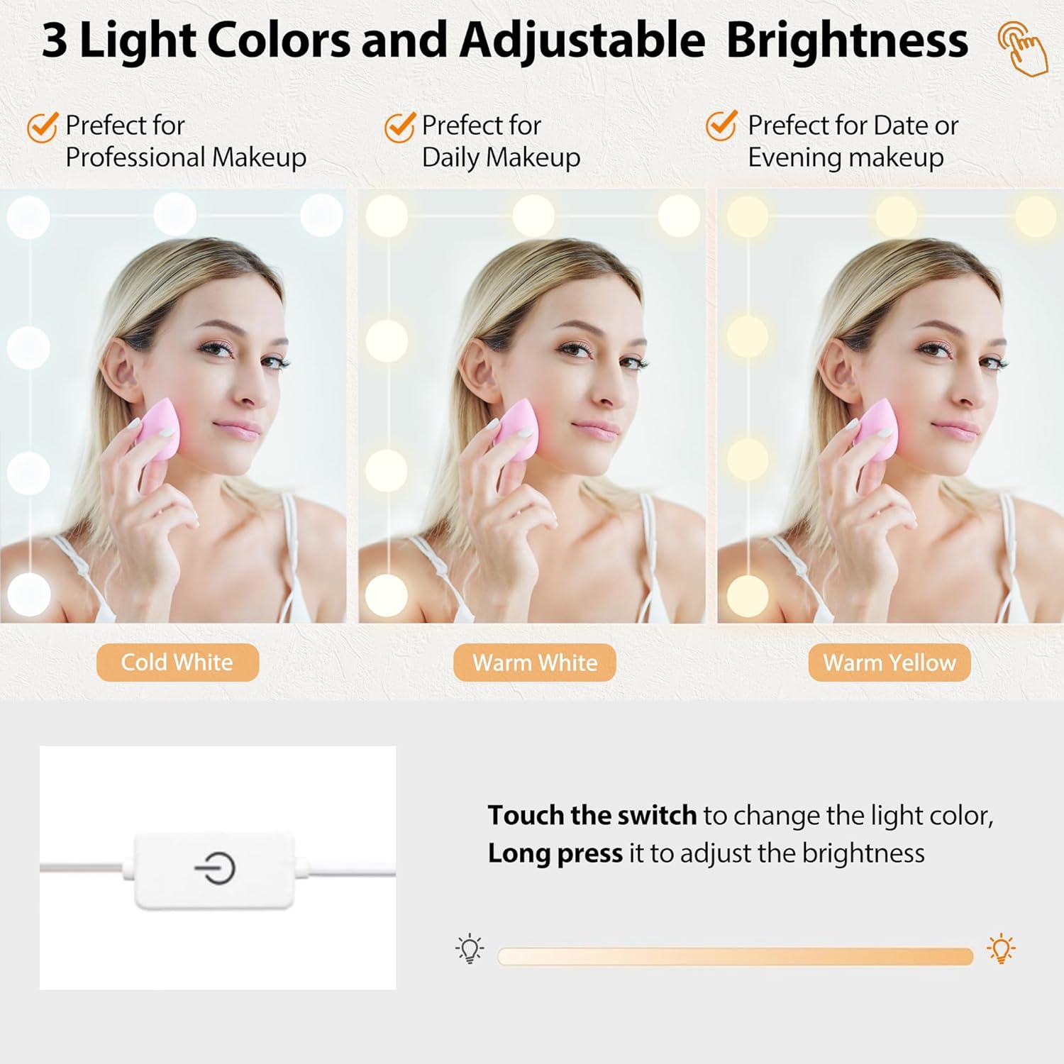 - 【3 modes d'éclairage & luminosité réglable】Coiffeuse avec Miroir et Tabouret dispose d'un grand miroir LED avec 3 modes de couleur (chaud, naturel et froid), plus sûrs que les ampoules normales. Vous pouvez changer le mode de couleur en appuyant sur l'interrupteur tactile ou régler la luminosité en appuyant longuement sur l'interrupteur tactile