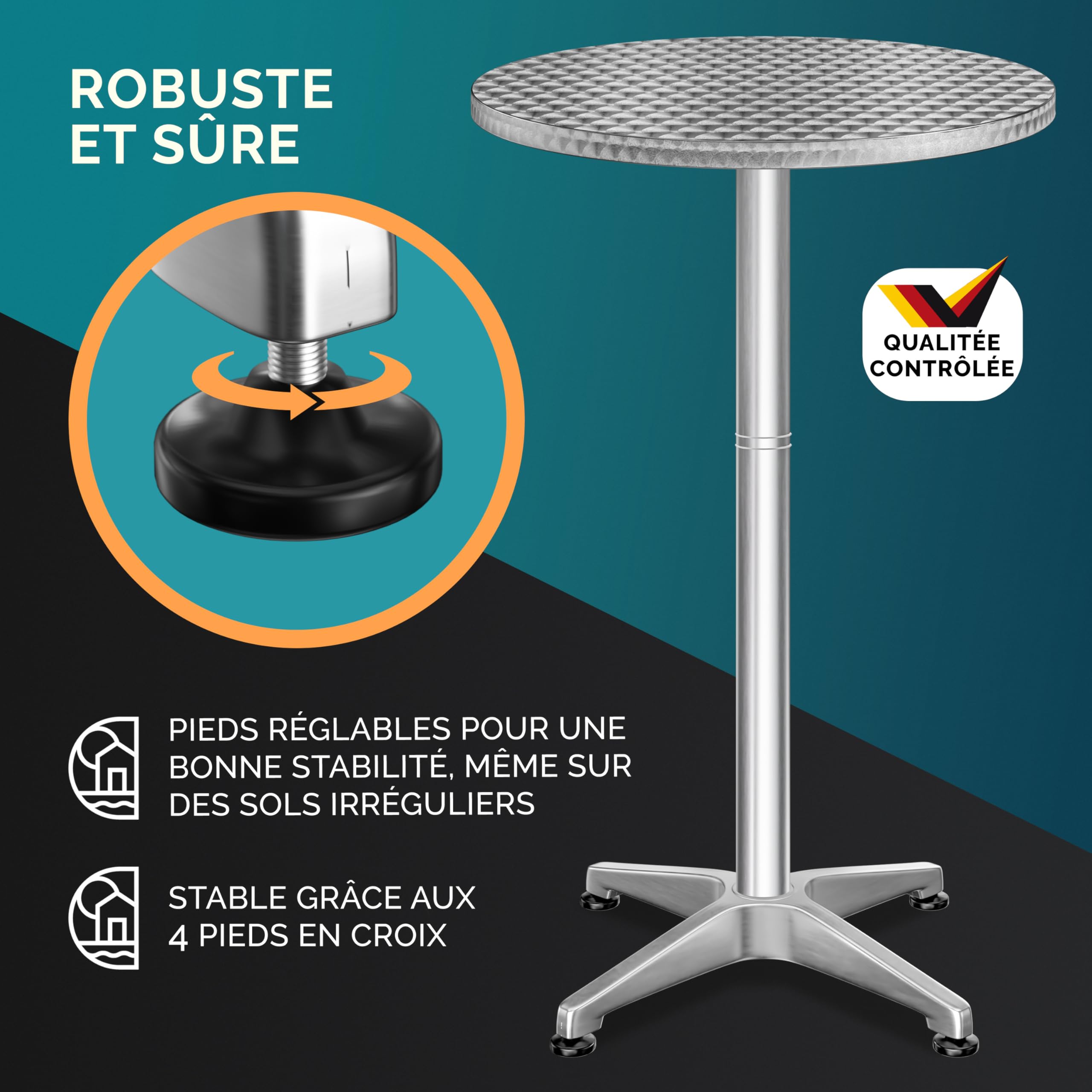- STABLE ET SOLIDE : La table de cocktail est très stable grâce à ses pieds en croix et à son vérin à gaz en acier de 6 cm. Les vis de réglage aux 4 pieds offrent une grande stabilité sur des sols irréguliers.