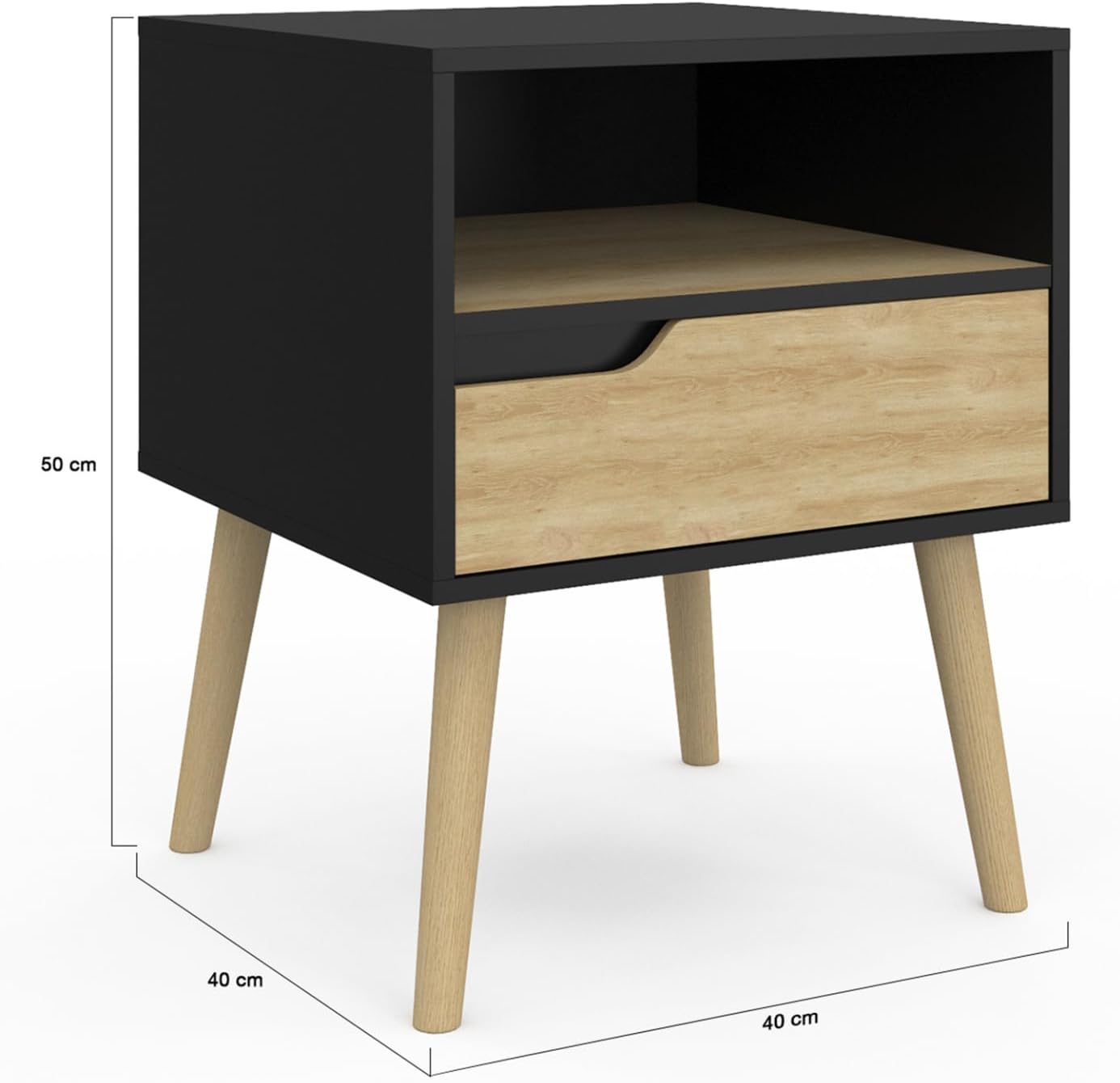 Vous souhaitez ajouter une touche nordique à votre chambre à coucher ? Craquez pour ce lot de 2 tables de chevet HELSINKI scandinave au coloris noir et hêtre. Dotées chacune d'un grand tiroir fermé et d'une niche, vous pourrez y ranger toutes vos affaires personnelles, pour une chambre dégagée et zen en toutes circonstances. Pratiques et déco, rangez-y votre montre, livre de chevet, réveil, pilulier, produits de nuit, sans avoir à vous relever. La dimension du plateau est idéale pour recevoir une lampe de chevet ou d'appoint.Multifonctions, elles pourront aussi faire office de meuble d'appoint dans un salon pour y disposer vos objets de déco, petites plantes vertes.Leur design noir et leur encoche arrondie, confèrent aux chevets un look tendance et élégant. Leurs grands pieds en bois fuselés de 22.5 cm de hauteur garantissent quant à eux stabilité et robustesse dans le temps. Alors n'attendez plus ! Apportez une touche scandinave et chaleureuse à votre chambre à coucher, tout en optimisant votre espace de rangement avec ce lot de 2 tables de chevet HELSINKI. Dimensions du lot de 2 tables de chevet HELSINKIDimensions globales : Longueur 40 cm x largeur 40 cm x Hauteur 50 cmHauteur des pieds : 22.5 cmLargeur des pieds : 4 cmDimensions façade tiroir : L. 36 x H. 11 cm Dimensions intérieures tiroir : L. 32 x l. 29 x H. 4.5 cmDimensions intérieures niche : L. 36.5 x l. 38 x H. 11.5 cmMatériaux : panneaux de particules 12 mm Coloris : noir / boisÀ monter soi-mêmeRetrouvez l'ensemble de nos tables de chevet sur notre boutique en ligne !Retrouvez également l'intégralité de notre collection scandinave.