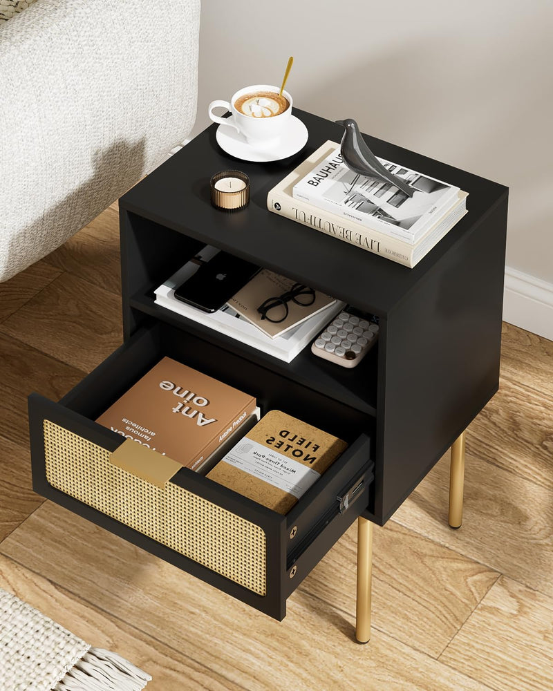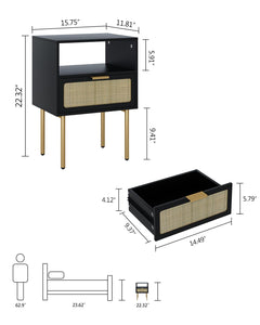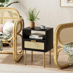 Table a chevet en rotin noir avec tiroir cadre doré