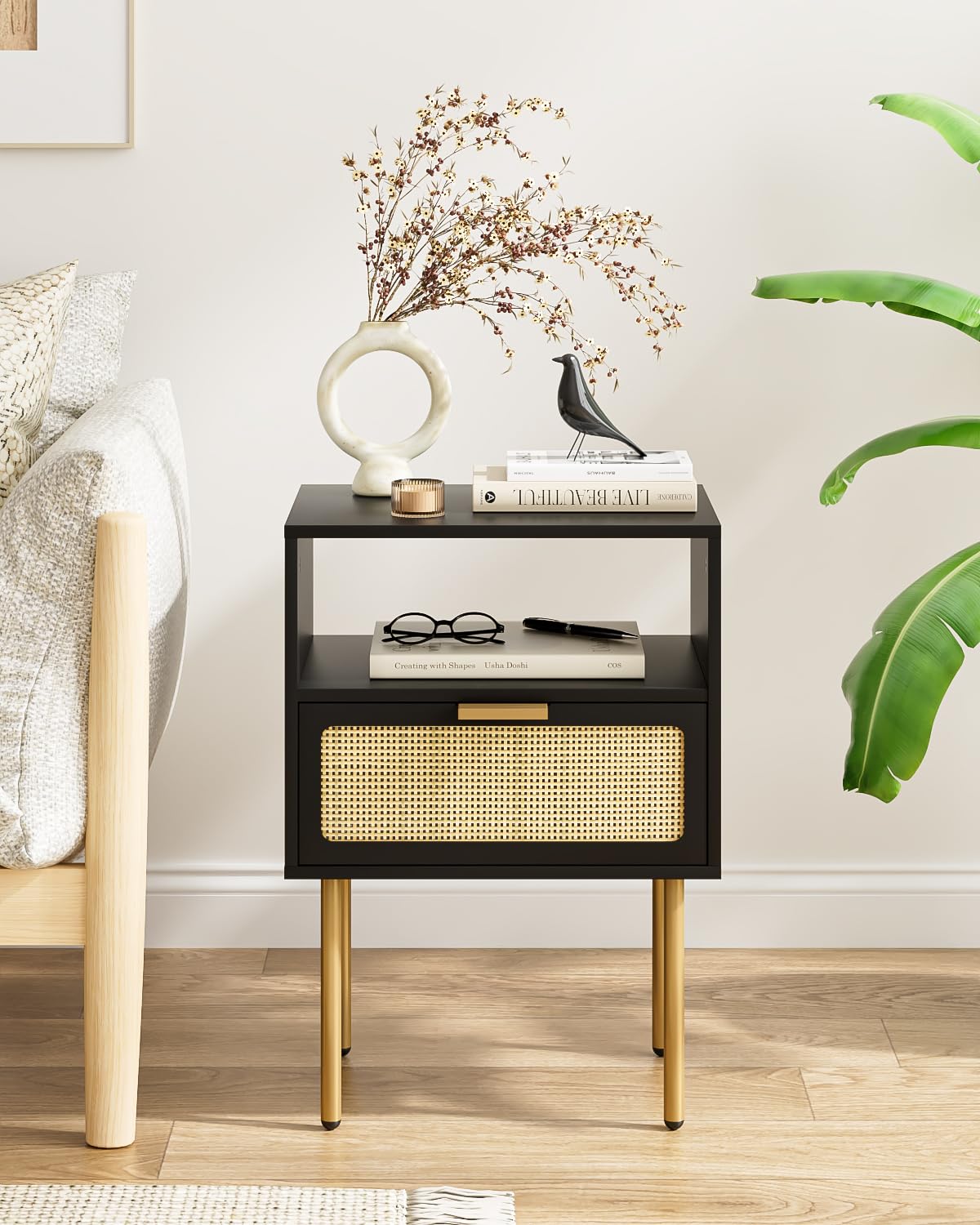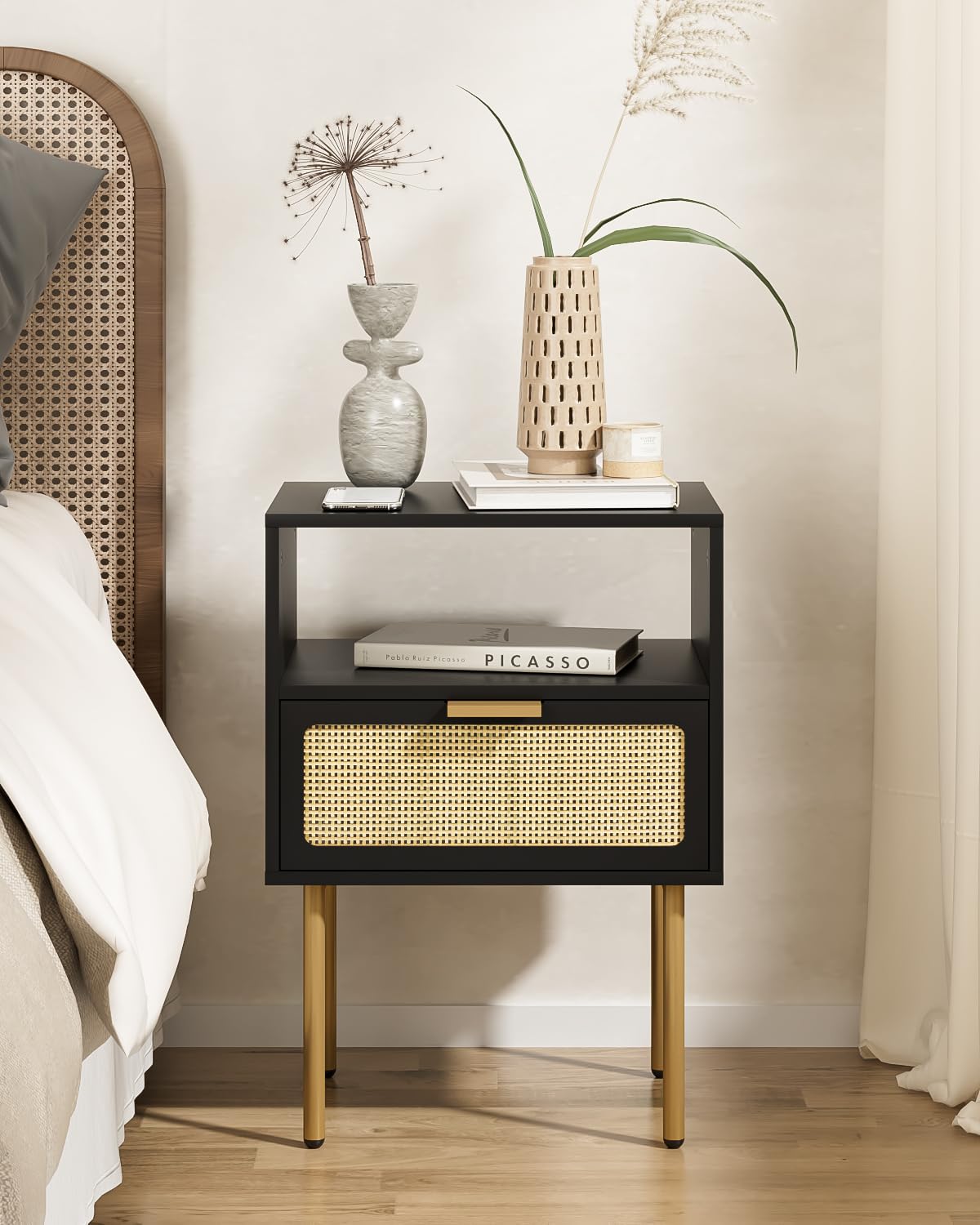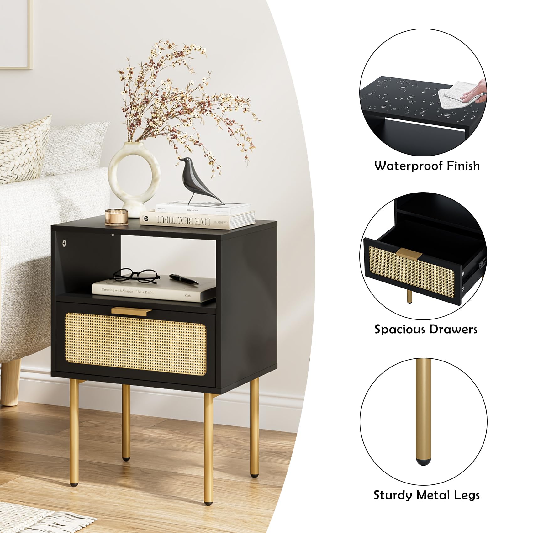 - Design simple et moderne : la combinaison classique du noir et de l'or mat donne à cette table de chevet en rotin une mode moderne. Elle est adaptée à différents styles d'intérieur. Elle peut également être utilisée comme table d'appoint ou table d'appoint dans toute la maison et ajouter de l'élégance à la vie domestique.