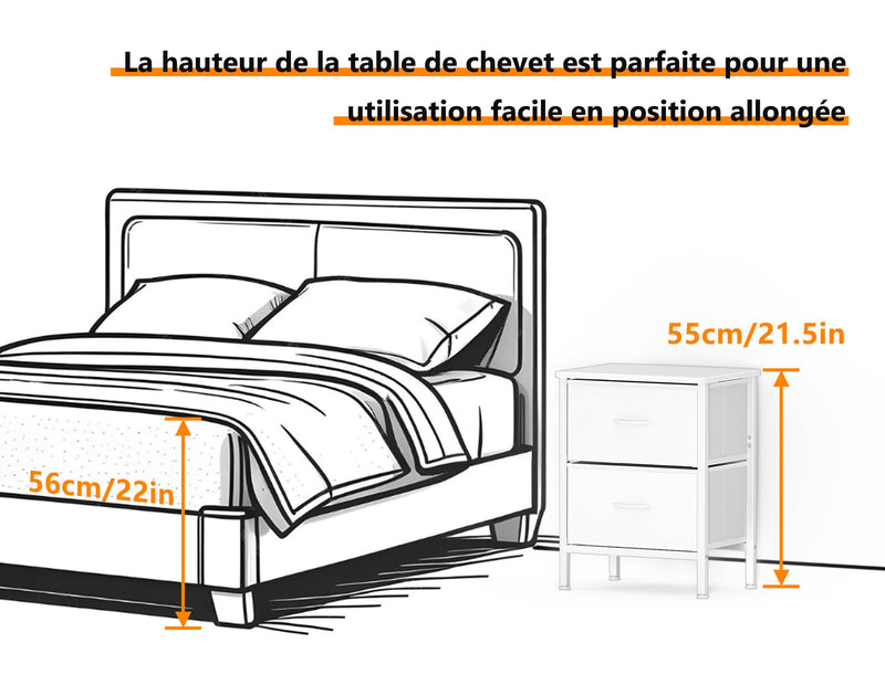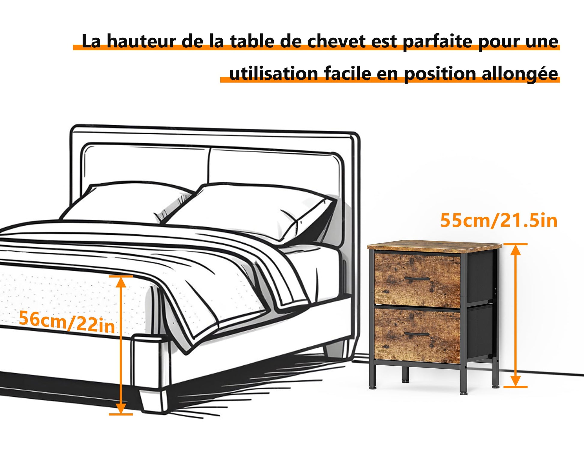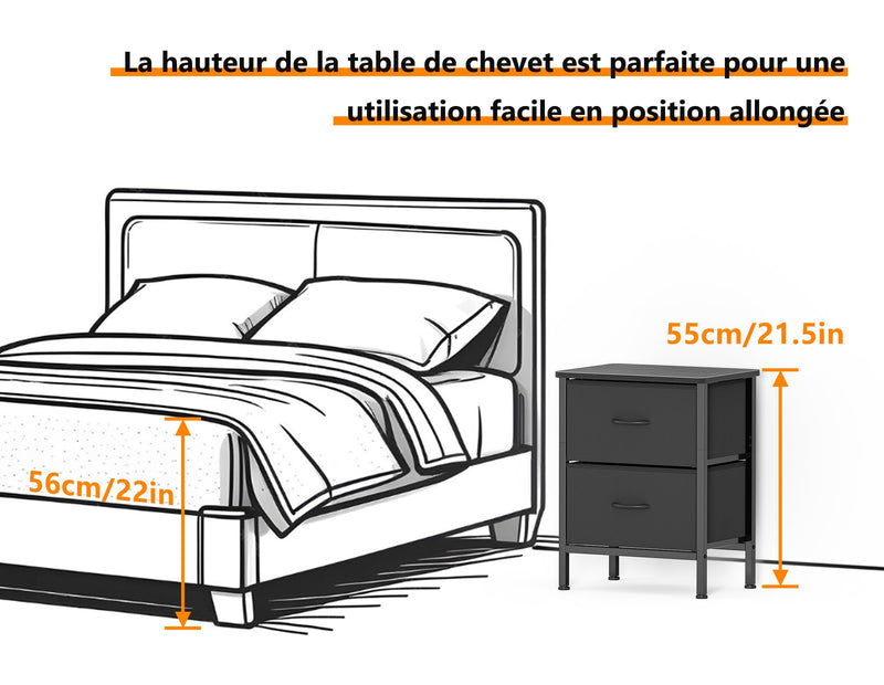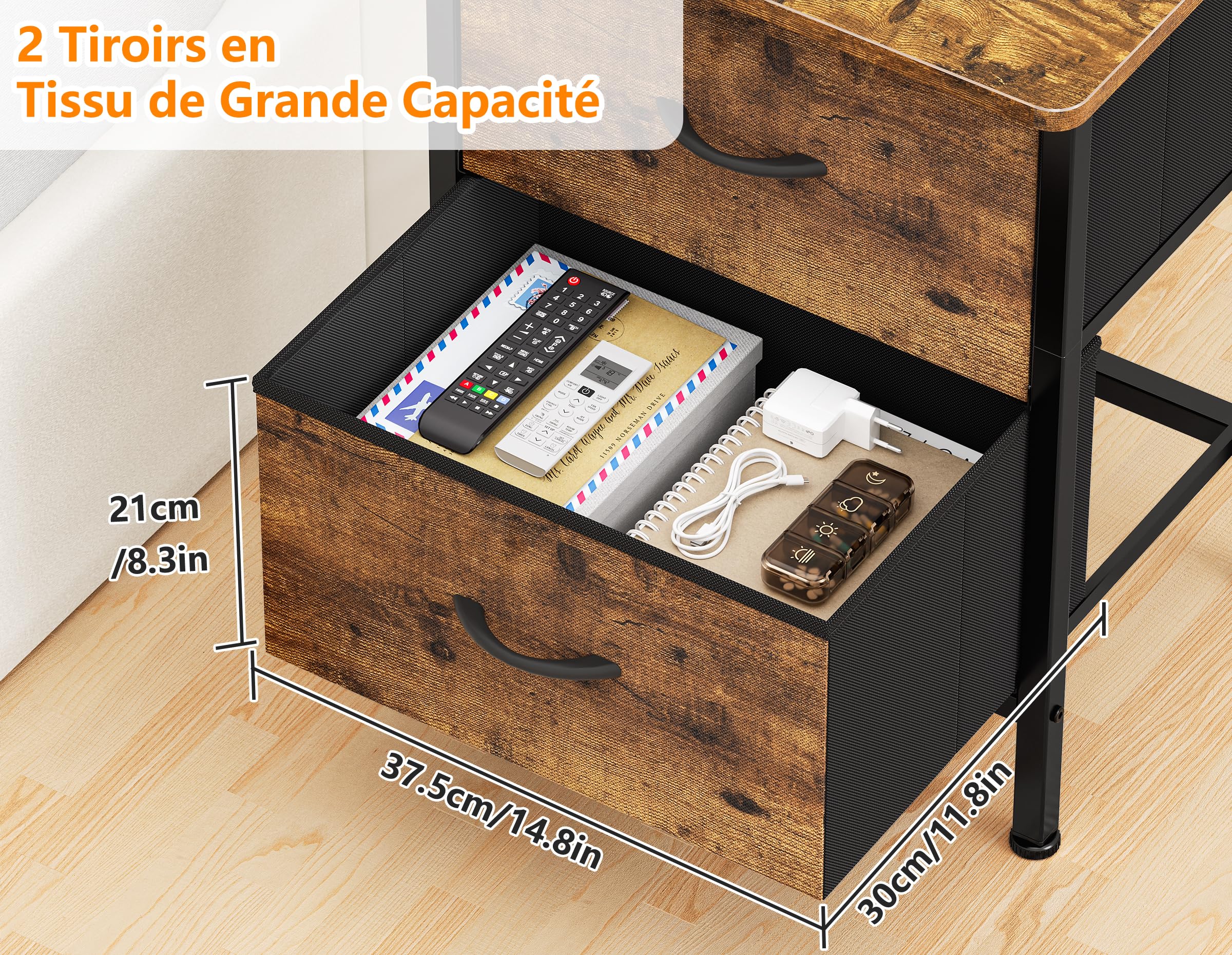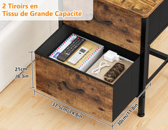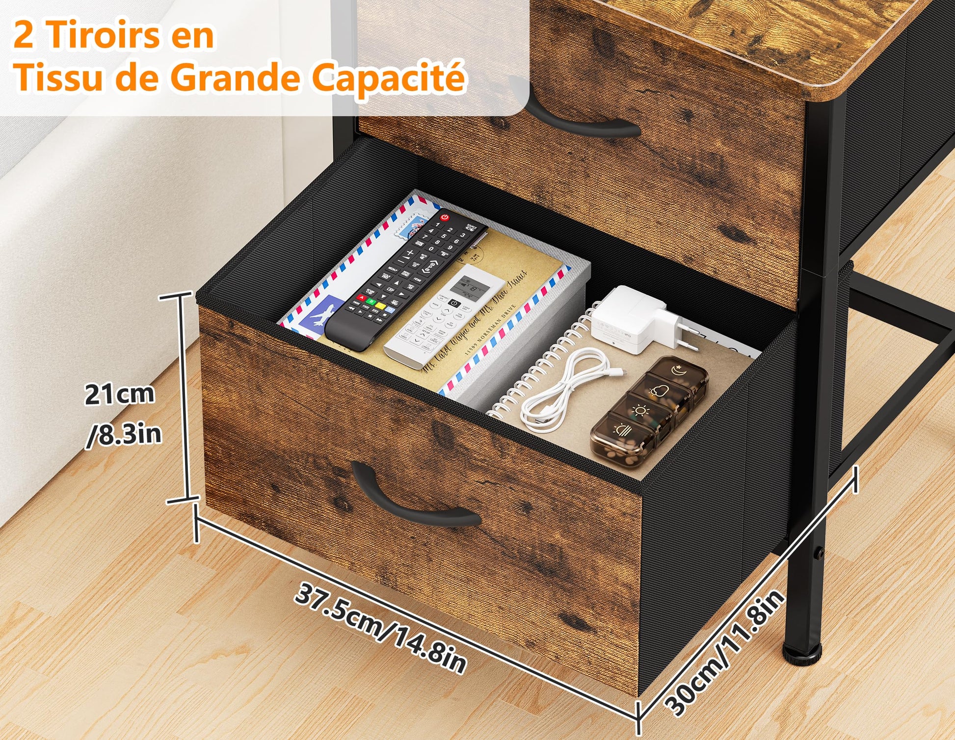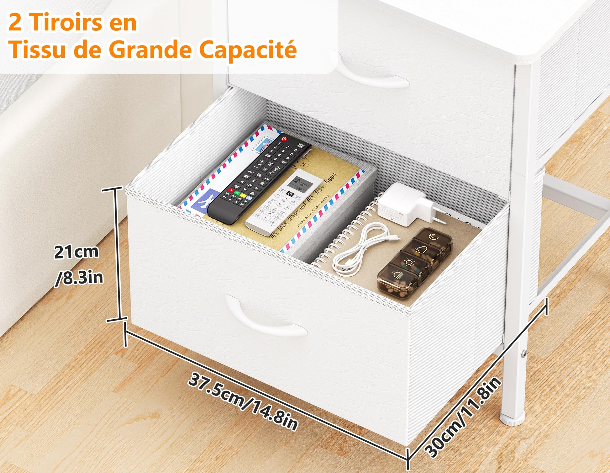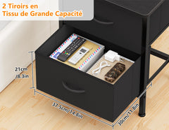 - 【Grand espace de rangement】Cette table de chevet dispose de deux tiroirs en tissu spacieux (37,5 x 27 x 21 cm chacun). Ils accueillent sans effort télécommandes, chargeurs, jouets et couvertures, pour une chambre toujours organisée et épurée.