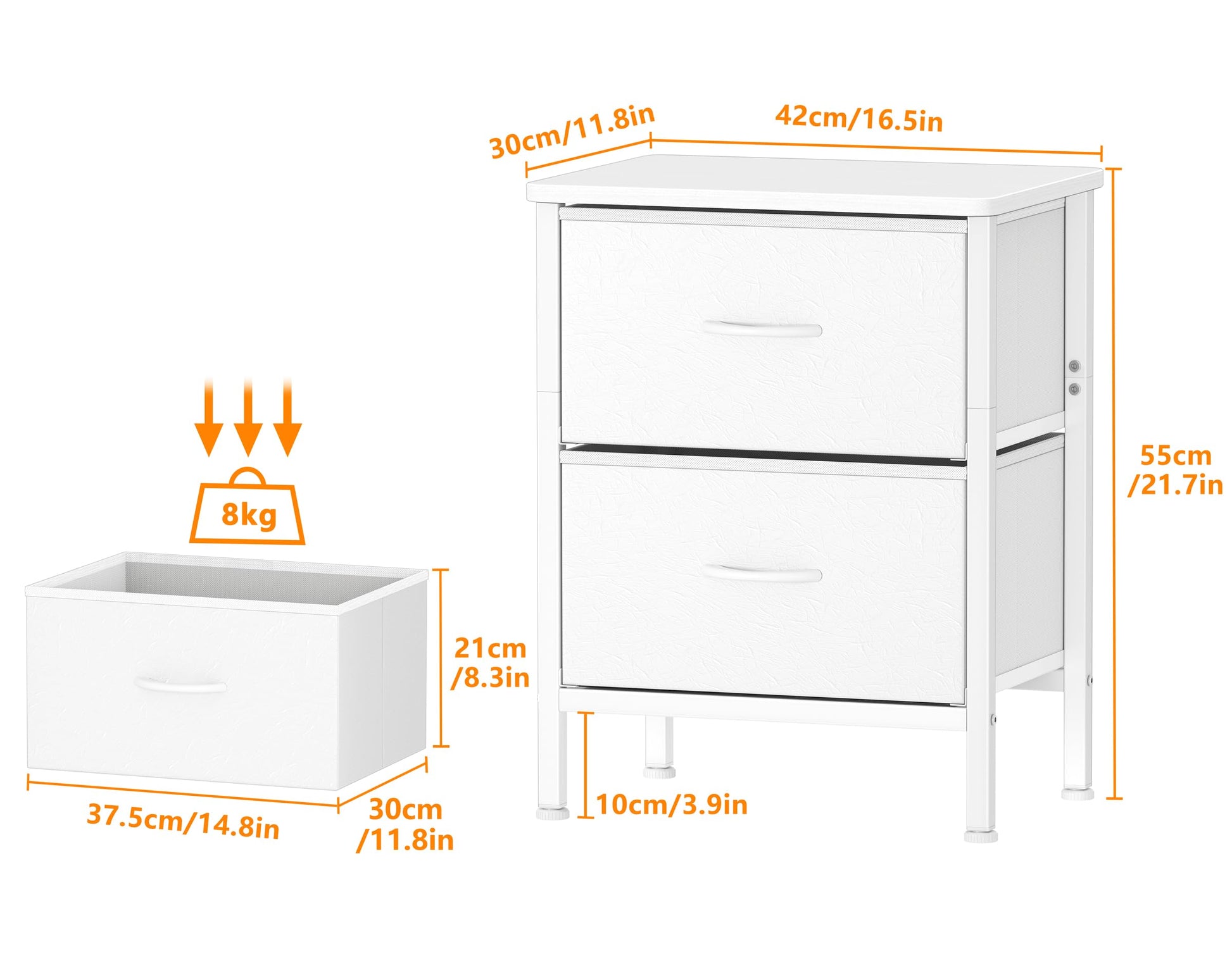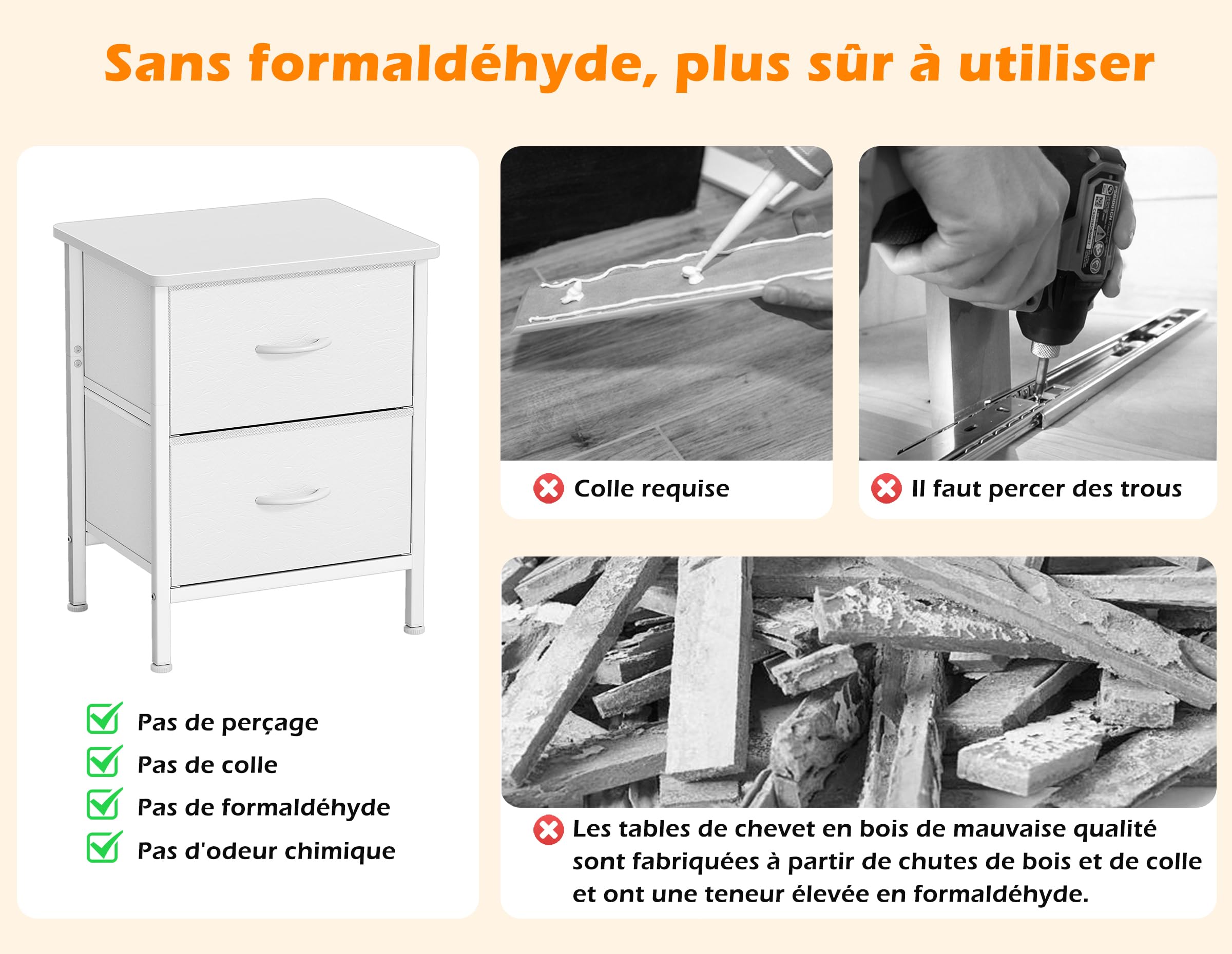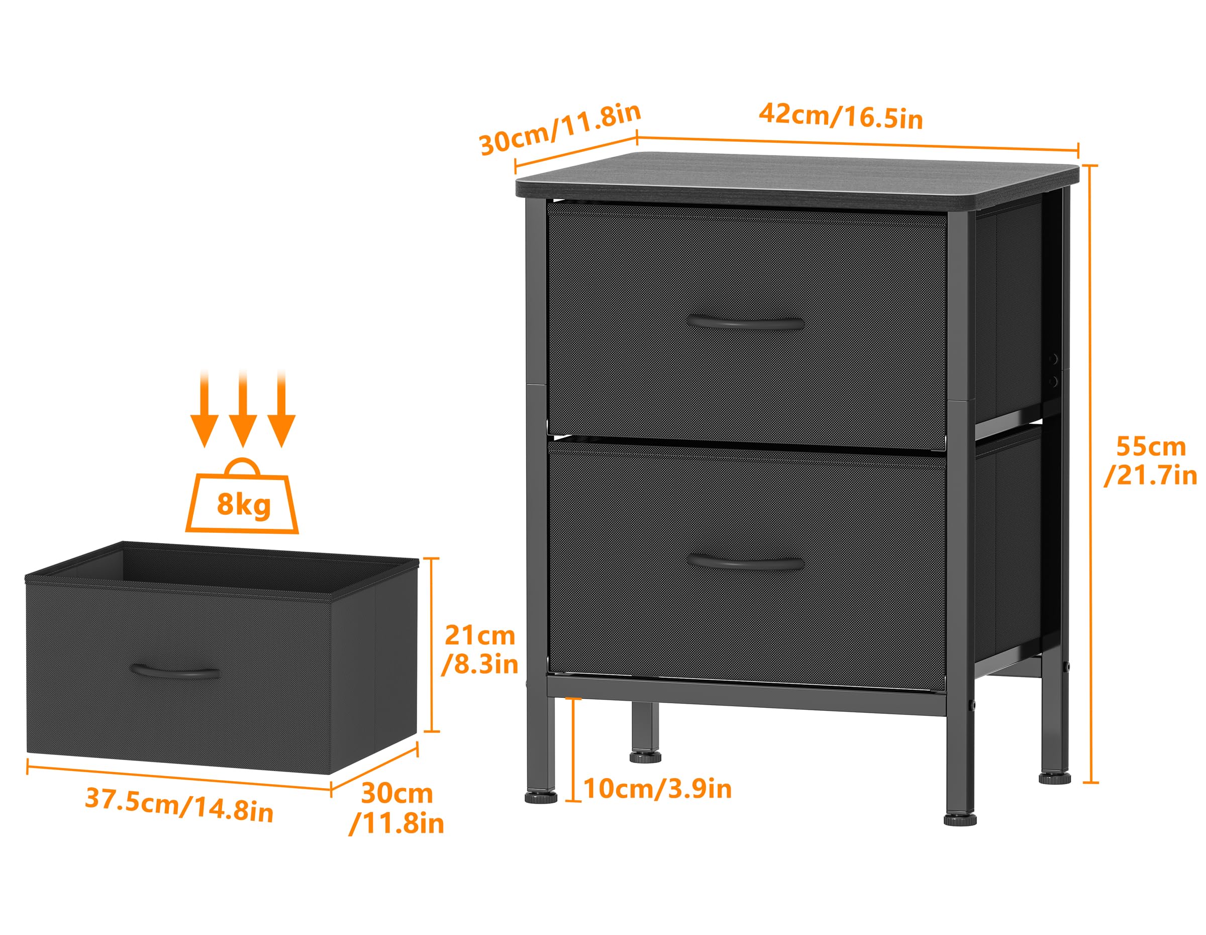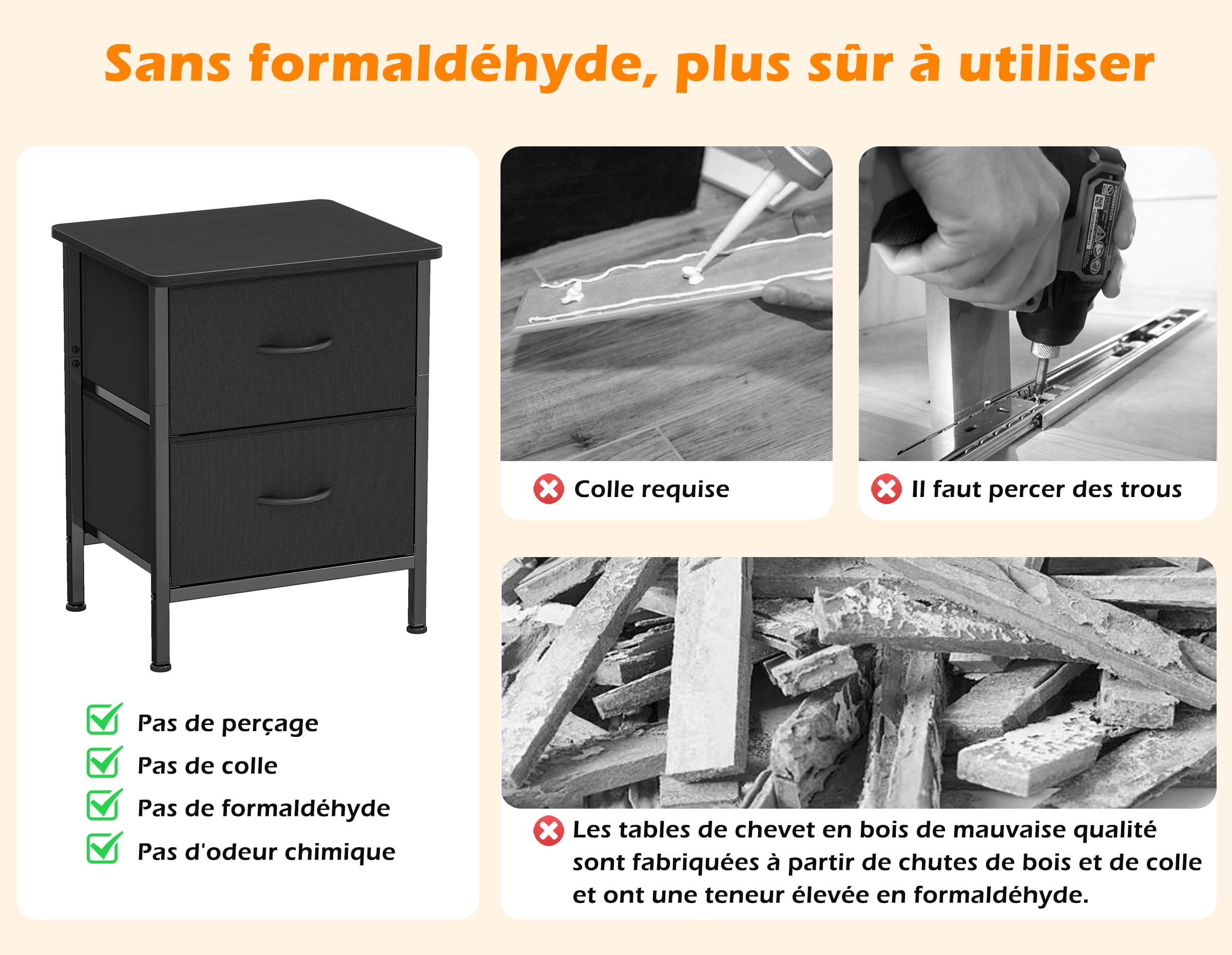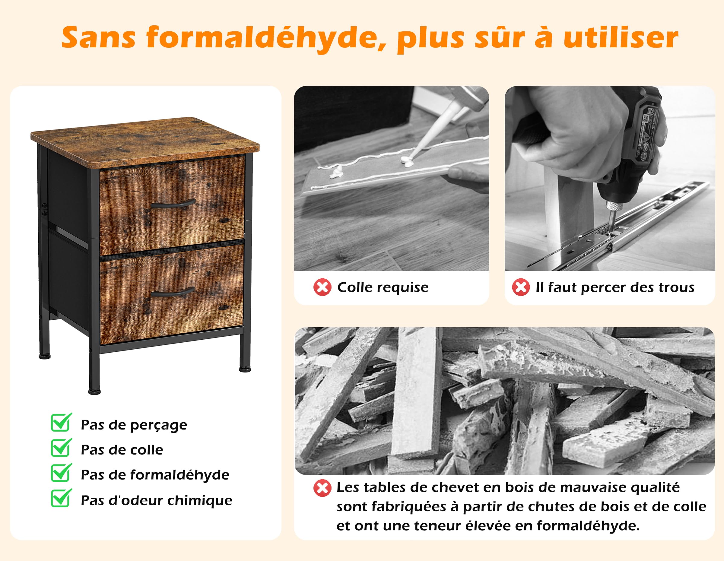 - 【Grand espace de rangement】Cette table de chevet dispose de deux tiroirs en tissu spacieux (37,5 x 27 x 21 cm chacun). Ils accueillent sans effort télécommandes, chargeurs, jouets et couvertures, pour une chambre toujours organisée et épurée.
