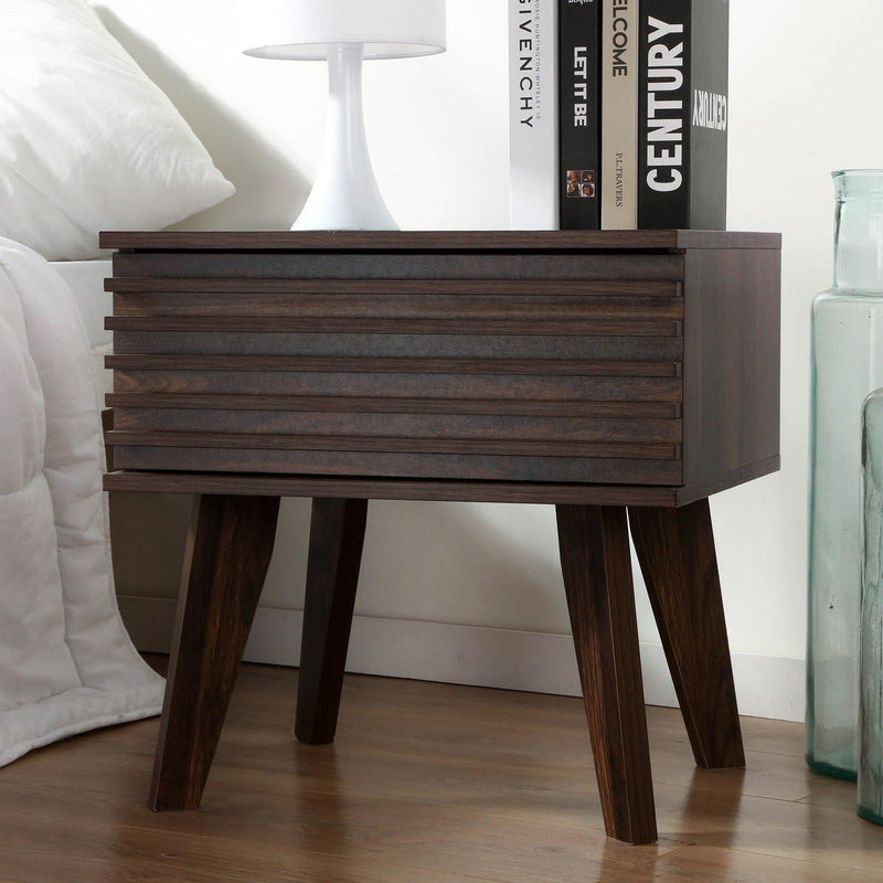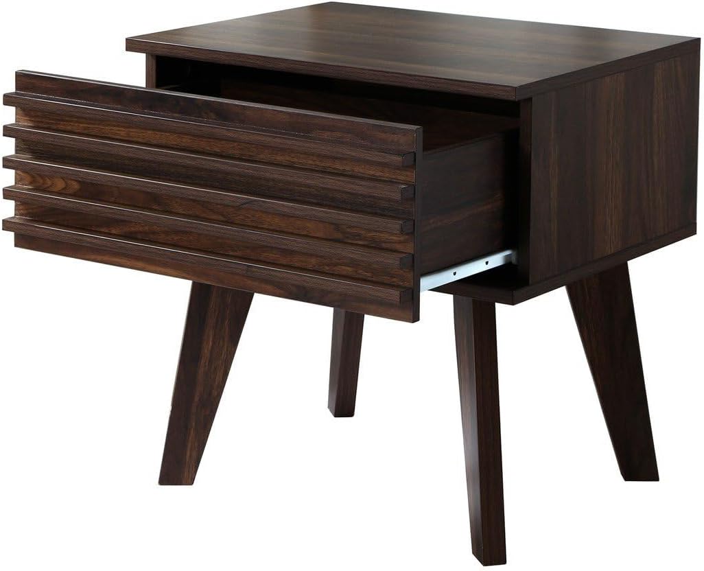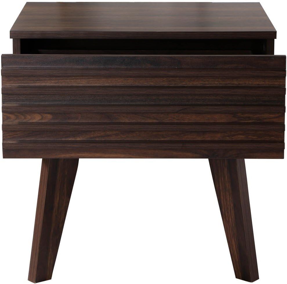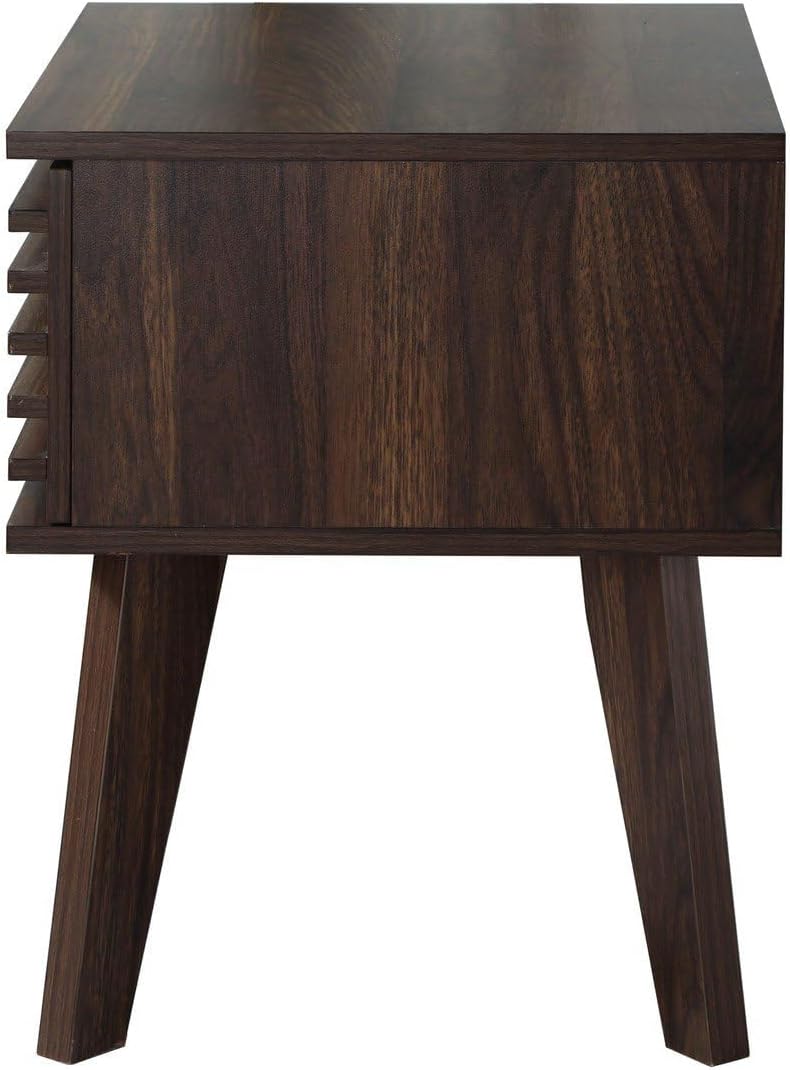 - MATÉRIAUX ROBUSTES : Cette table de nuit, avec son décor en bois noyer foncé rainuré, est conçue en panneaux de particules de 15 mm d'épaisseur pour plus de solidité. Le tiroir est équipé de coulisses en métal à galet pour un fonctionnement fluide.