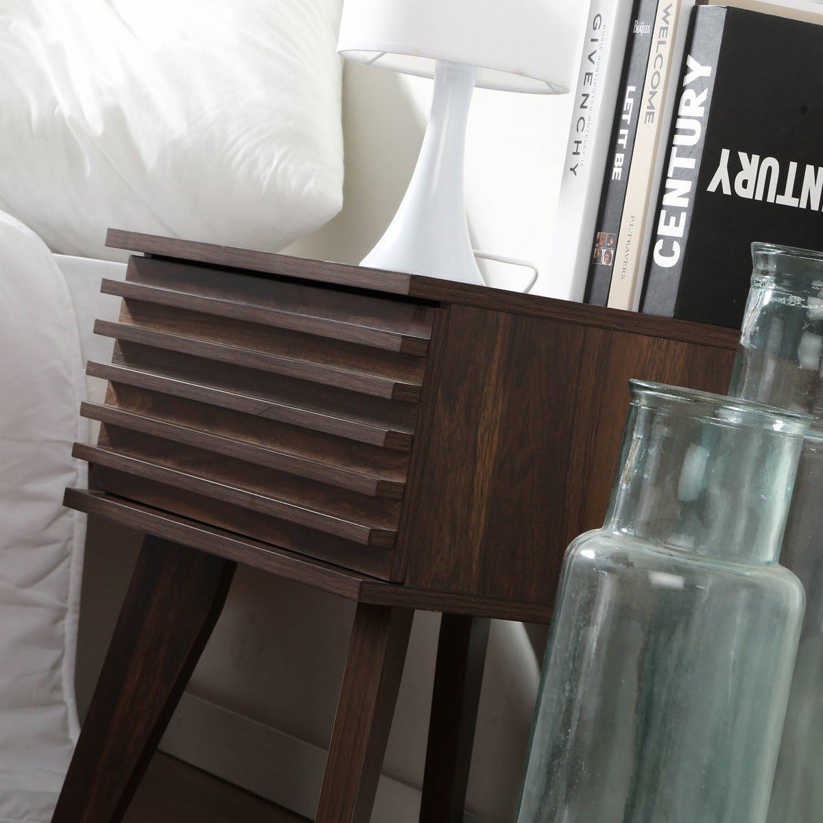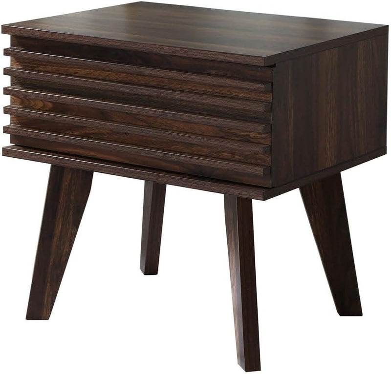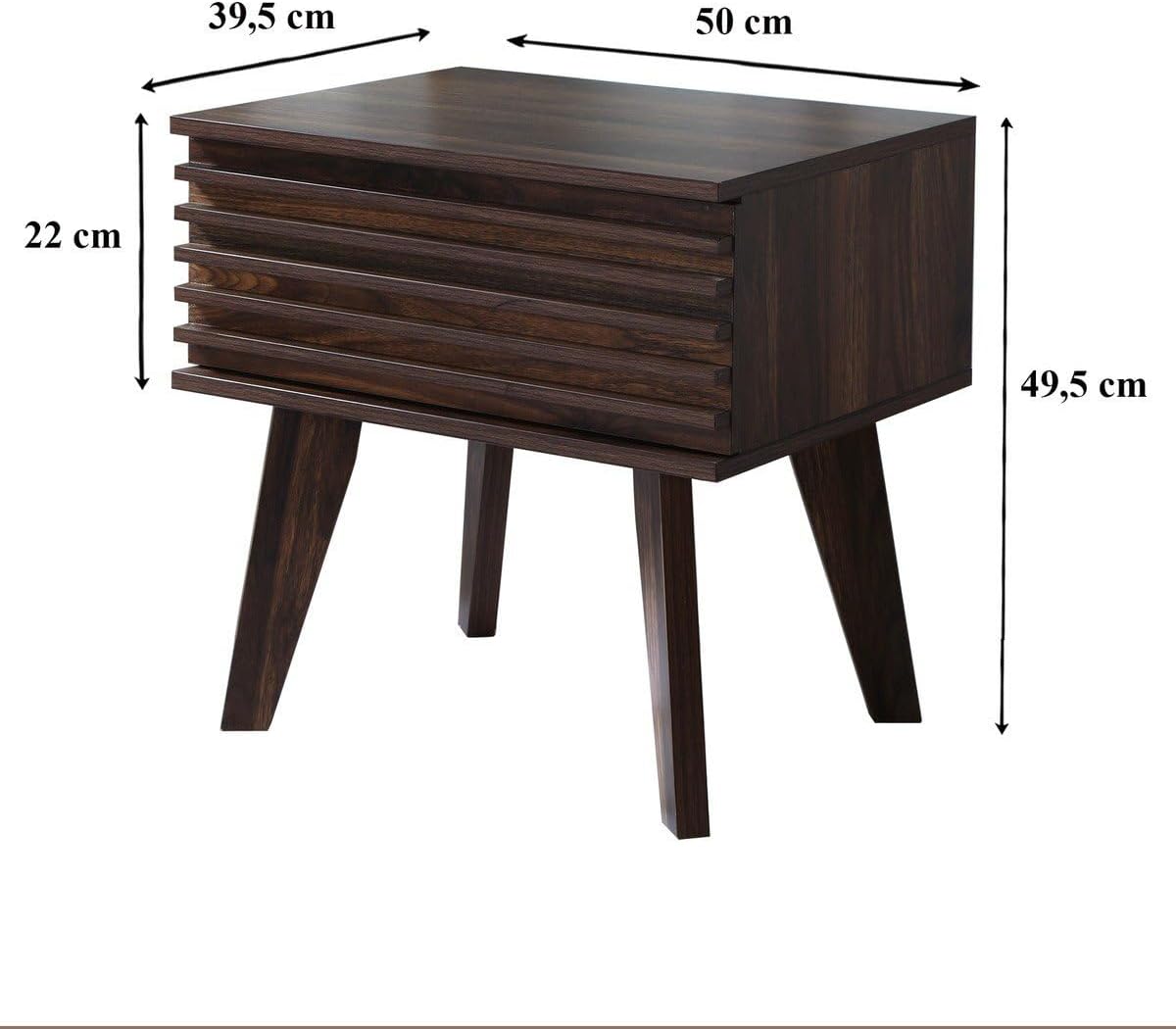 - MATÉRIAUX ROBUSTES : Cette table de nuit, avec son décor en bois noyer foncé rainuré, est conçue en panneaux de particules de 15 mm d'épaisseur pour plus de solidité. Le tiroir est équipé de coulisses en métal à galet pour un fonctionnement fluide.