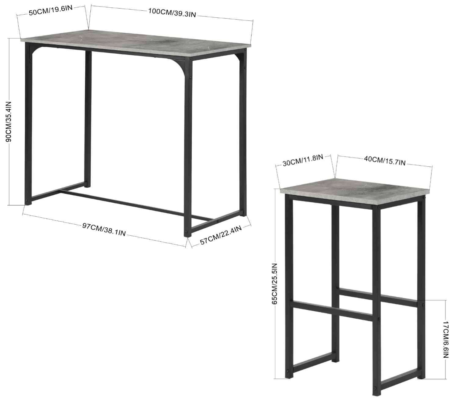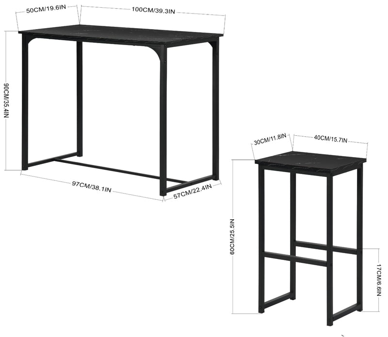 - Dimensions : table de bar : L 100 x P 50 x H 90 cm, tabouret de bar : L 30 x P 40 x H 65 cm. La table peut supporter 60 kg et la chaise 120 kg.