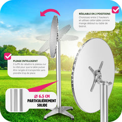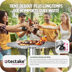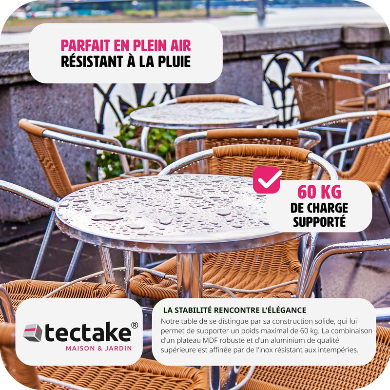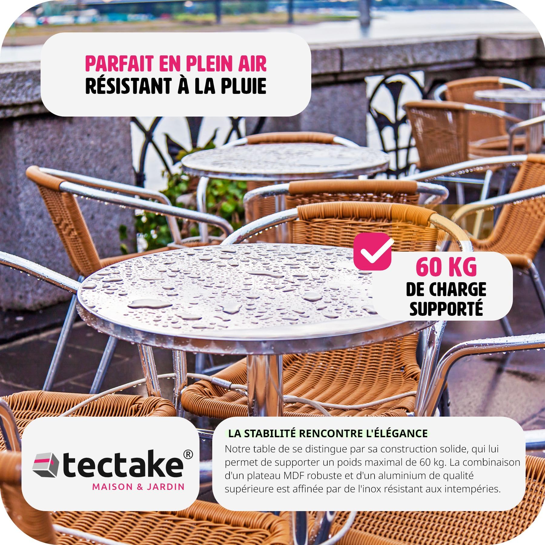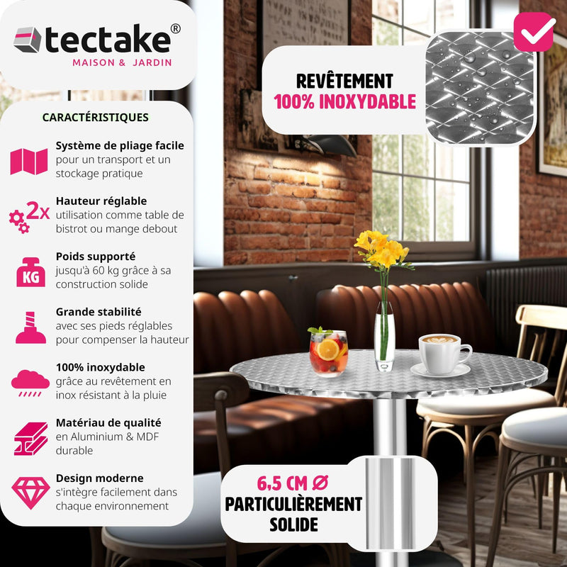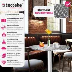 Cette belle table de bistrot de tectake trouvera sa place en toute occasion, que ce soit lors de garden-partys, de fêtes d’entreprise, de mariages ou d’autres évènements. Au besoin, cette structure pratique passe en un tour de main du mode table haute au mode table normale. Le montage est simple et rapide. Après usage, il suffit d’essuyer la surface hydrofuge avec un chiffon humide. L’armature robuste en aluminium léger et les pieds réglables en hauteur font de la table de bistrot pliable de tectake l’accessoire idéal pour une utilisation en extérieur.