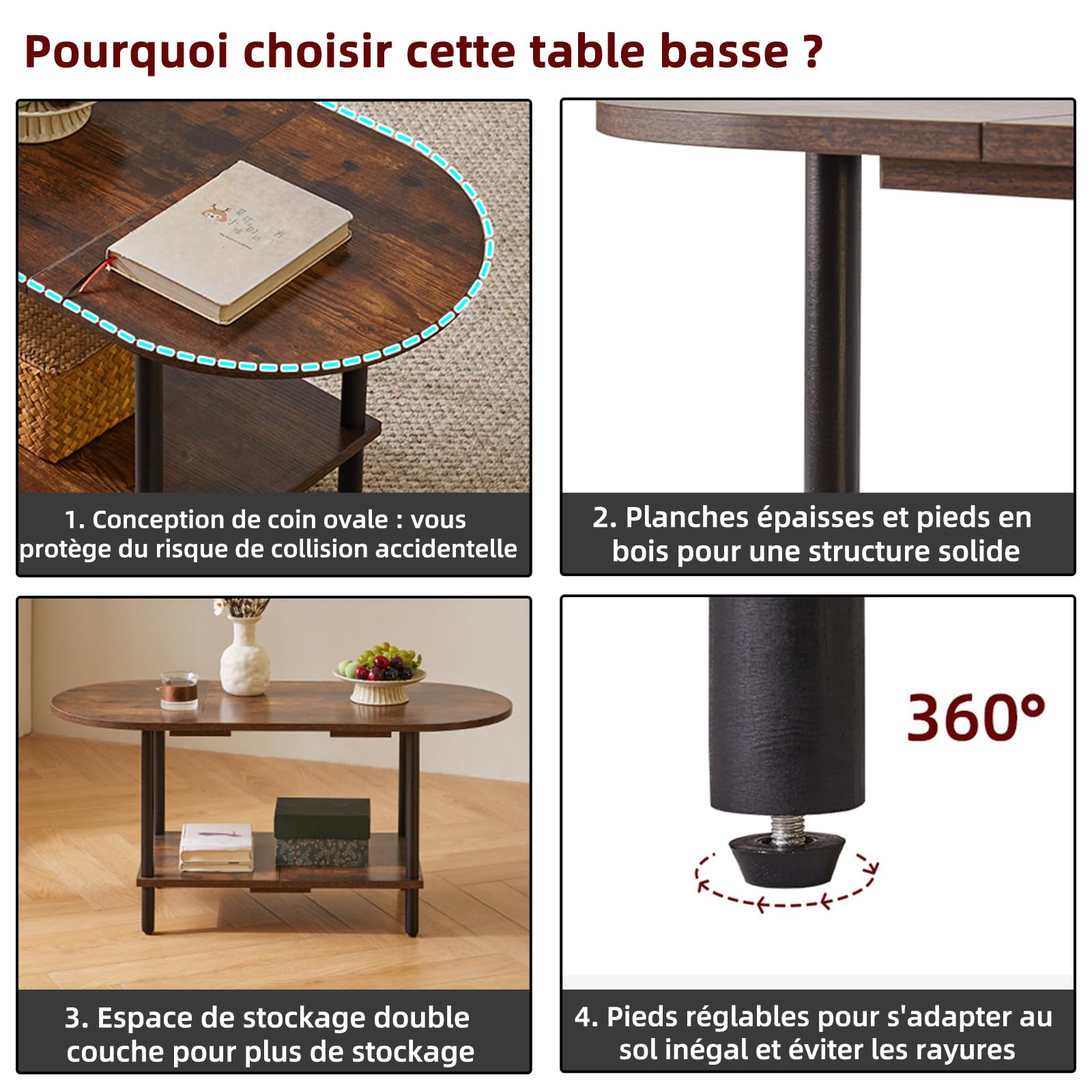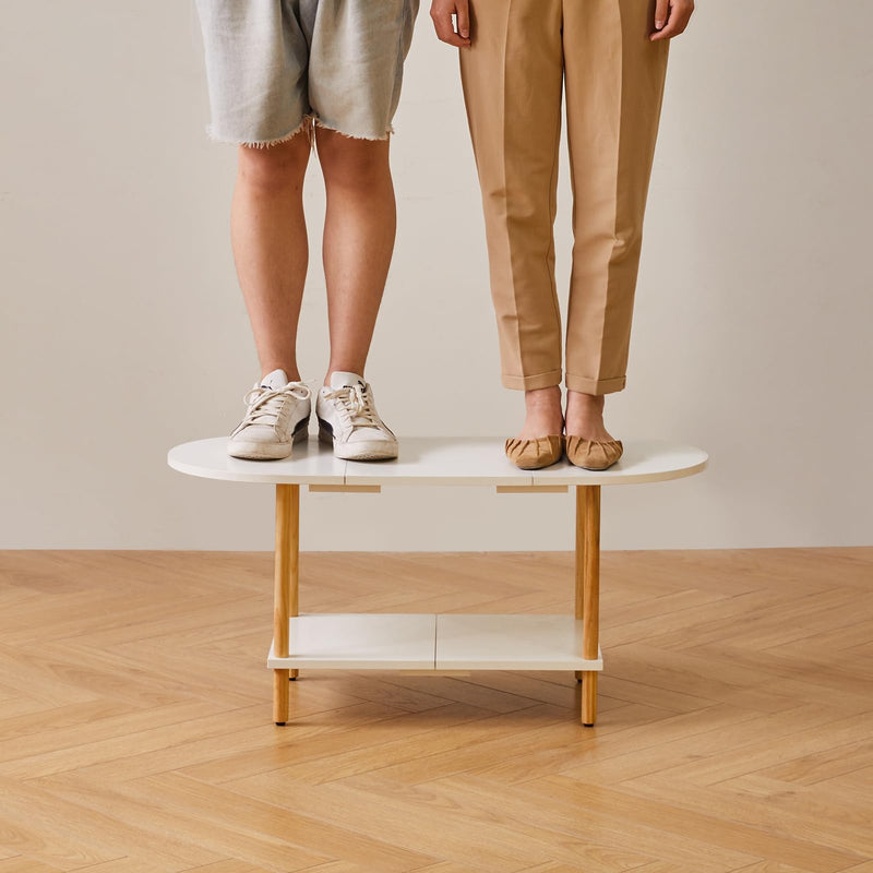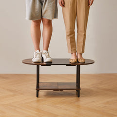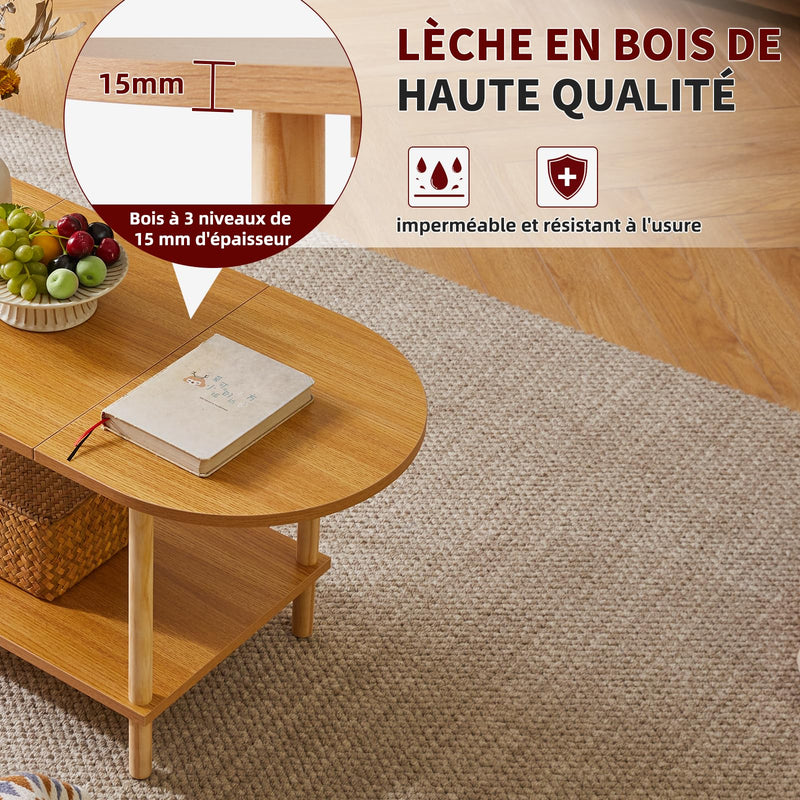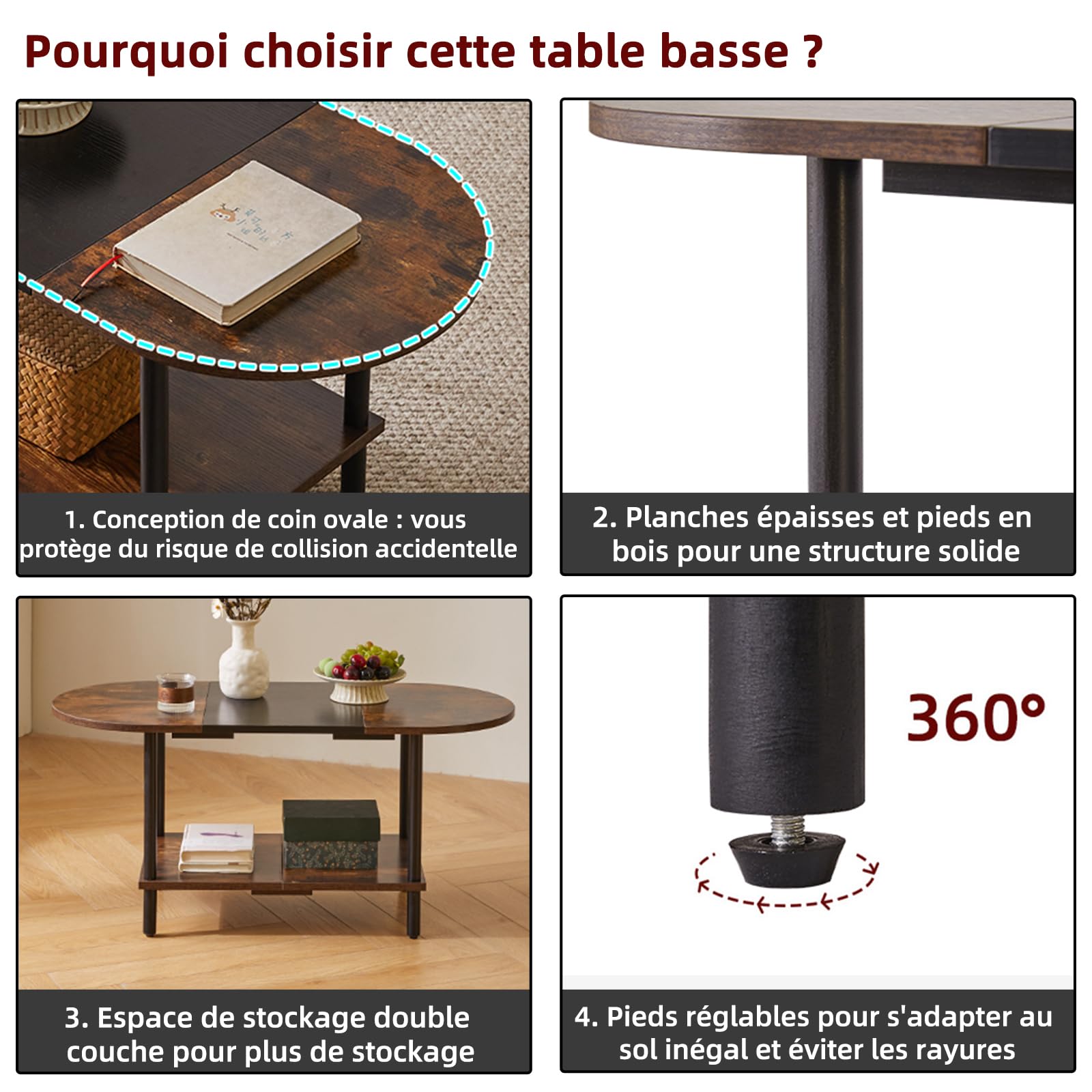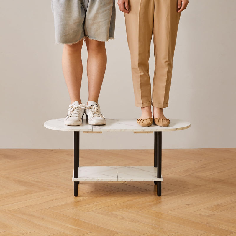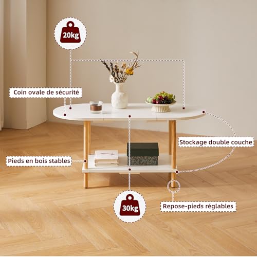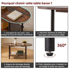 - 1.Conception unique : le dessus de cette table basse adopte un design ovale, qui peut non seulement être parfaitement intégré au canapé. Les bords arrondis protègent également votre famille des rayures accidentelles. Le fond est carrément conçu pour stabiliser la table et augmenter l'espace de rangement, la rendant plus pratique.