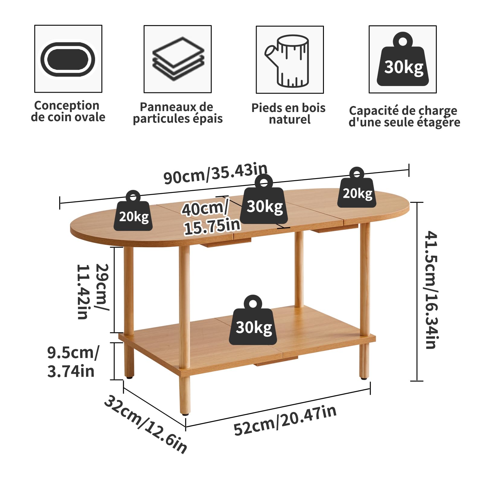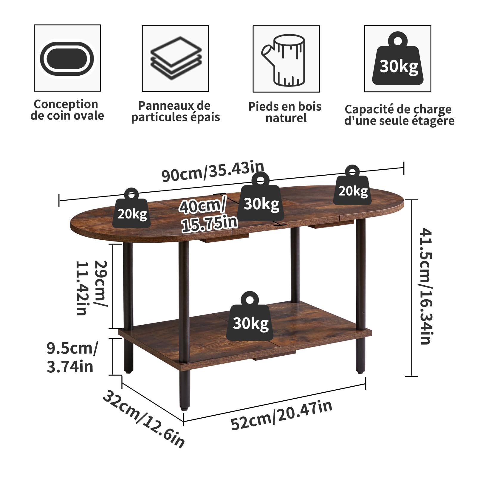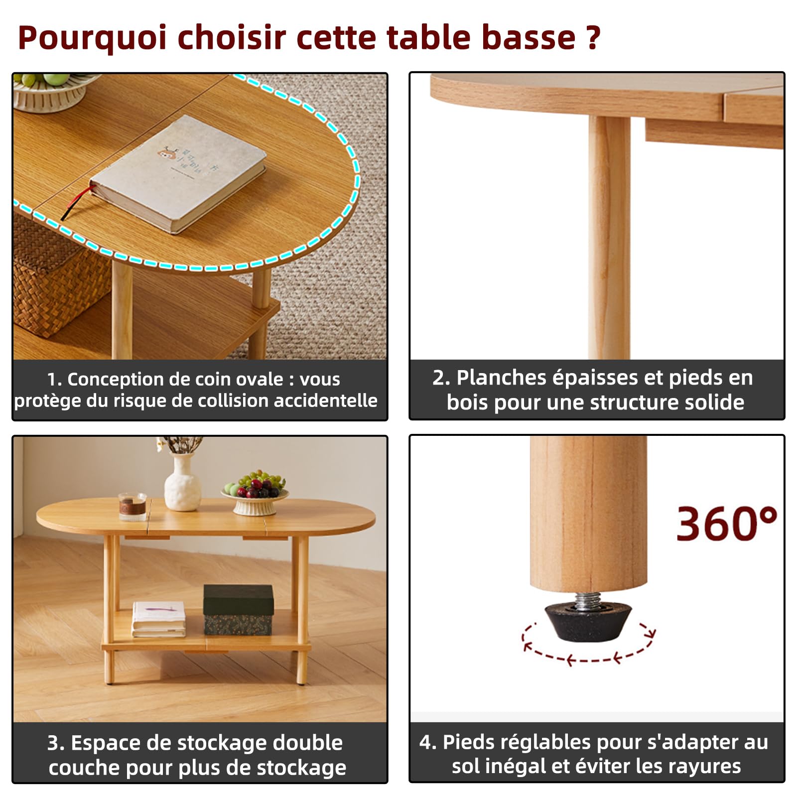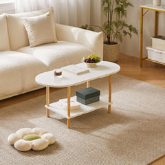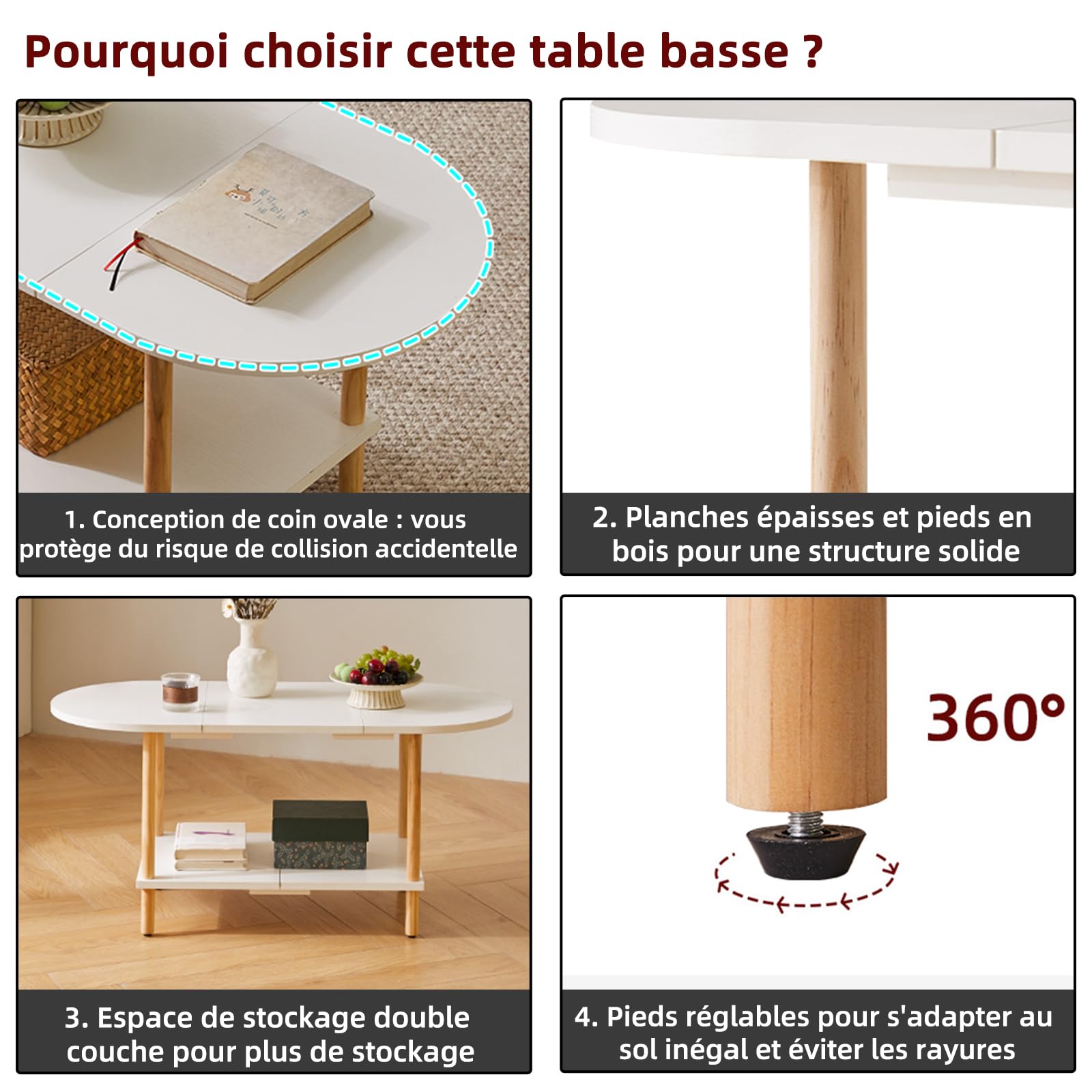 - 1.Conception unique : le dessus de cette table basse adopte un design ovale, qui peut non seulement être parfaitement intégré au canapé. Les bords arrondis protègent également votre famille des rayures accidentelles. Le fond est carrément conçu pour stabiliser la table et augmenter l'espace de rangement, la rendant plus pratique.