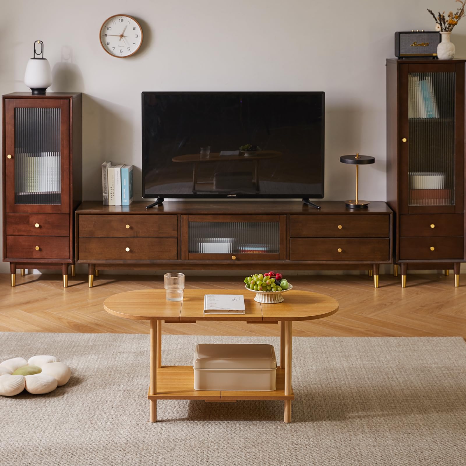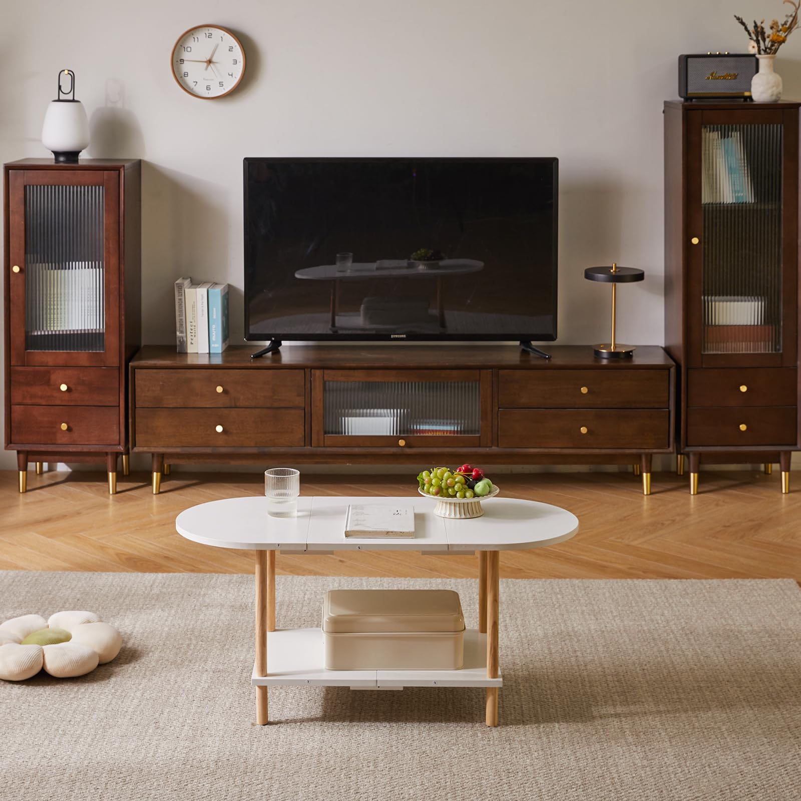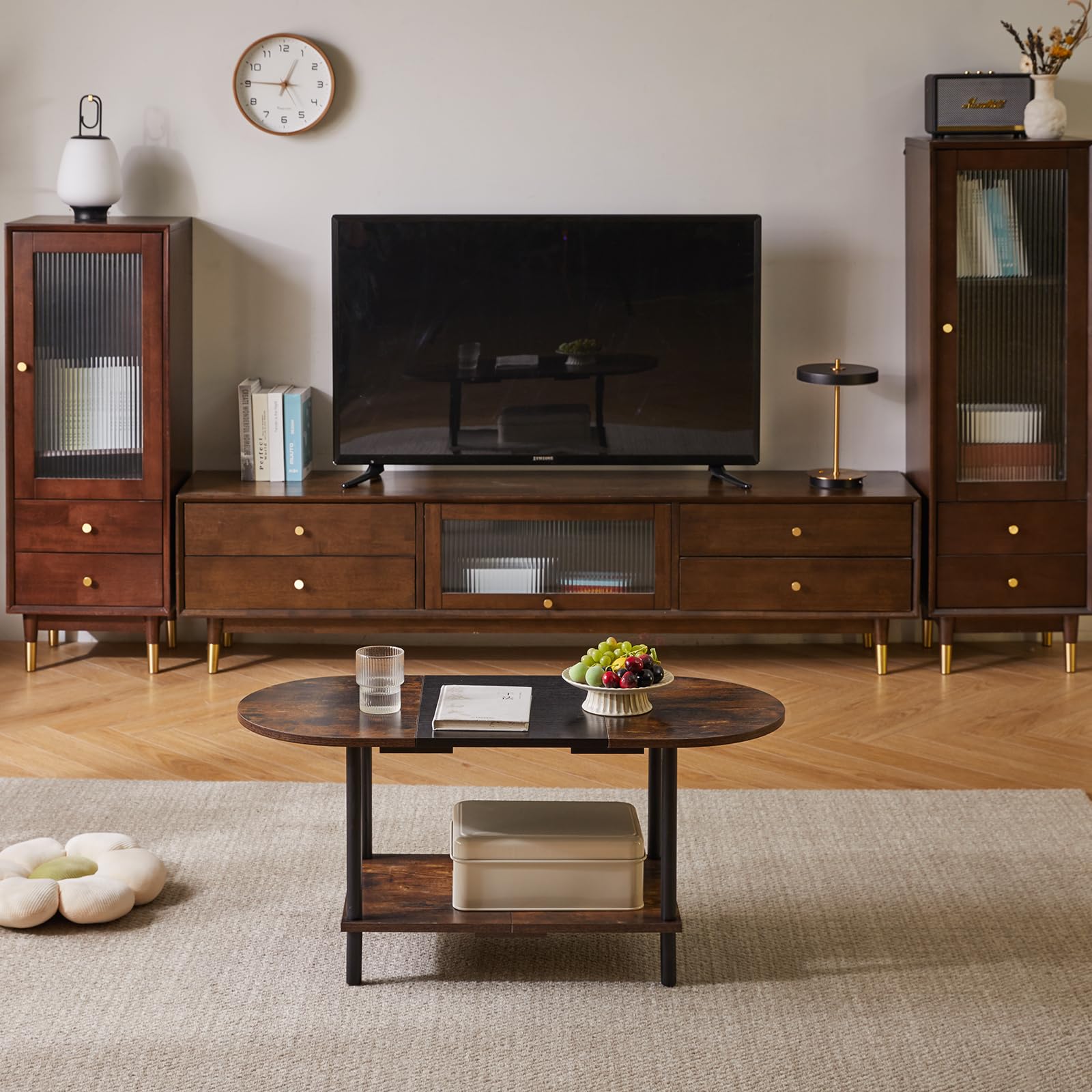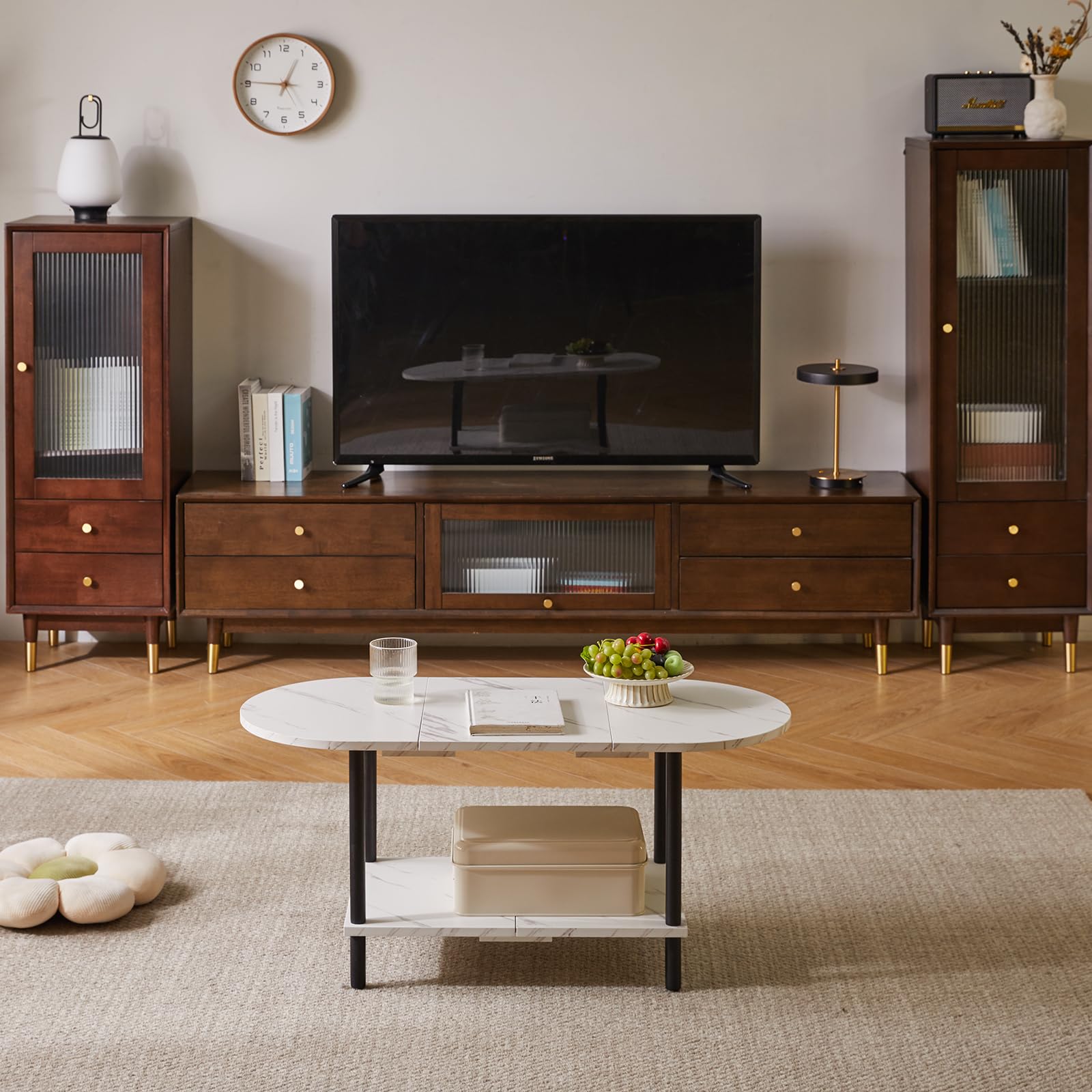 - 1.Conception unique : le dessus de cette table basse adopte un design ovale, qui peut non seulement être parfaitement intégré au canapé. Les bords arrondis protègent également votre famille des rayures accidentelles. Le fond est carrément conçu pour stabiliser la table et augmenter l'espace de rangement, la rendant plus pratique.