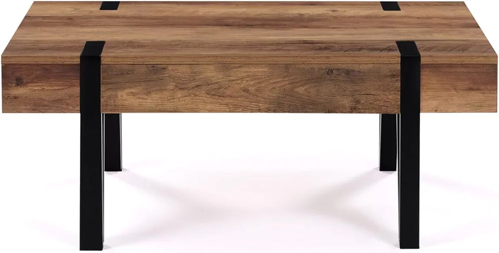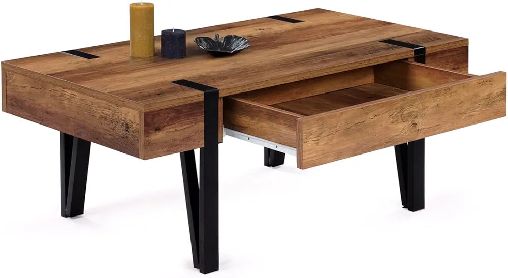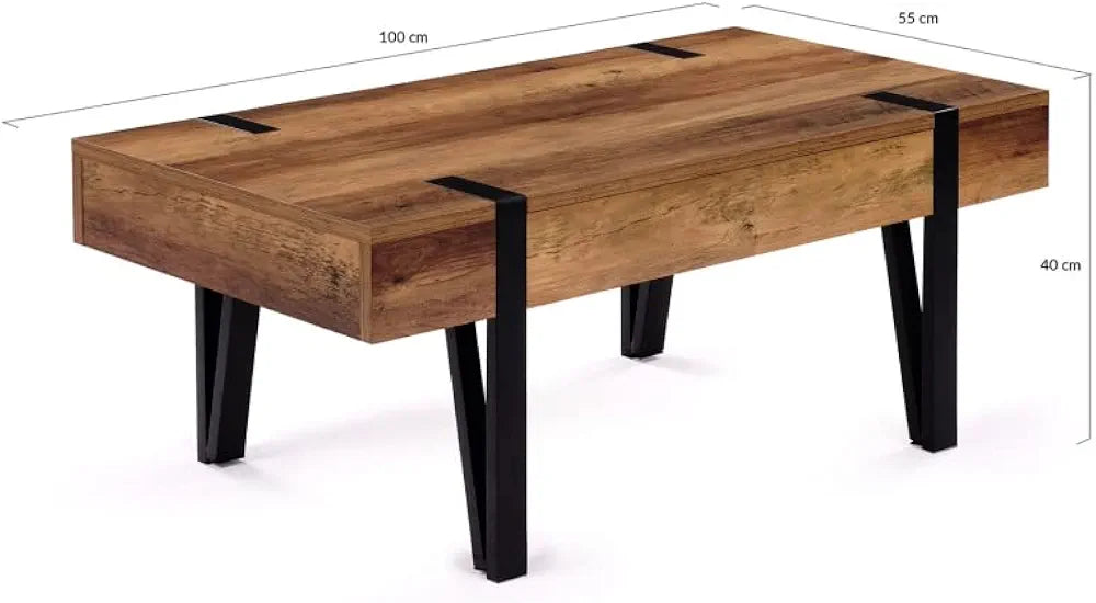 Si vous cherchez une table basse tendance et pratique pour votre salon, la table basse AUSTRIA avec tiroir est faite pour vous !Son coloris bois effet vieilli et ses pieds larges style épingle en métal noir lui offrent un design original qui sera du meilleur effet dans votre intérieur !Adaptable à toutes les situations, avec ses dimensions généreuses et compactes à la fois, elle est idéale pour organiser un apéritif entre amis, prendre un repas ou une collation devant la télévision ou encore aménager un coin bureau improvisé à hauteur de votre canapé. Fonctionnelle, elle offre également une solution de rangement fermé grâce au tiroir situé sous le plateau. Rangez vos revues et télécommandes à l'abri de la poussière et gardez un espace libre et net pour poser vos plateaux télé !Avec son aspect massif et ses coloris élégants, cette table basse en bois au style industriel apportera du cachet à votre intérieur. La structure de cette jolie table de salon, en métal (1,5 x 1,5 cm) et MDF (épaisseur 1,8 cm), lui assure stabilité et robustesse pour un usage au quotidien !Sublimez votre intérieur avec ses matériaux bruts, ses formes simples et l'alliance du bois et du métal !Dimensions table basse de salon avec tiroir AUSTRIADimensions globales : Longueur 100 cm x largeur 55 cm x Hauteur 40 cmHauteur totale du caisson : 12 cmDimensions intérieures du tiroir : L. 49,5 x l. 33,5 x H. 7 cmFaçade du tiroir : L. 60 x H. 9,7 cmDimensions des pieds : 4 x 2 cmMatériaux : MDF 1,8 cm et métal 1,5 x 1,5 cmÀ monter soi-mêmeDécouvrez également la version relevable ainsi que l'ensemble de nos tables basses sur notre boutique en ligne !