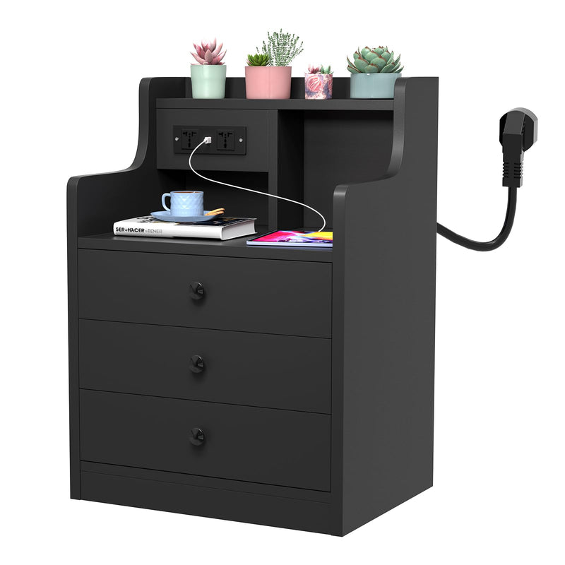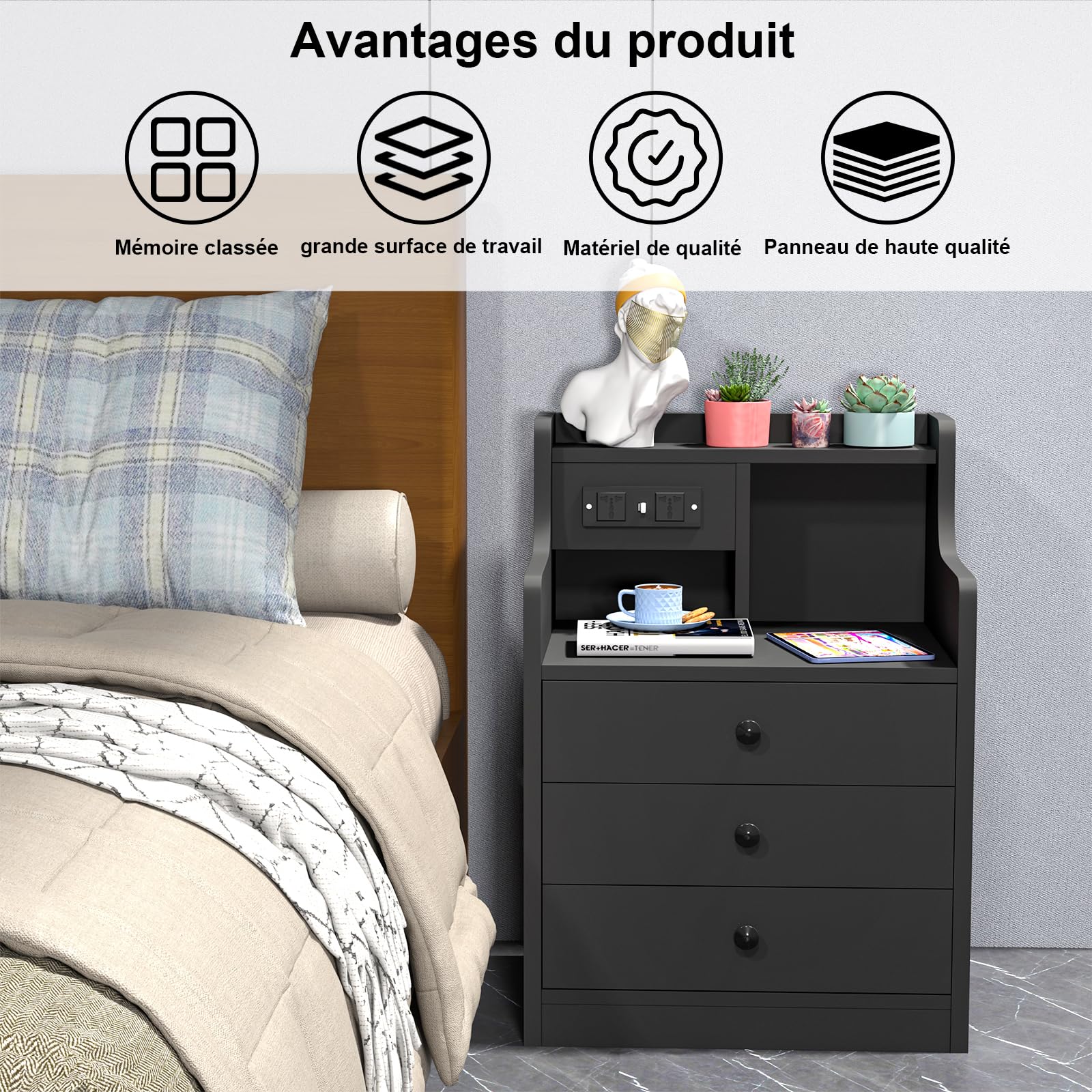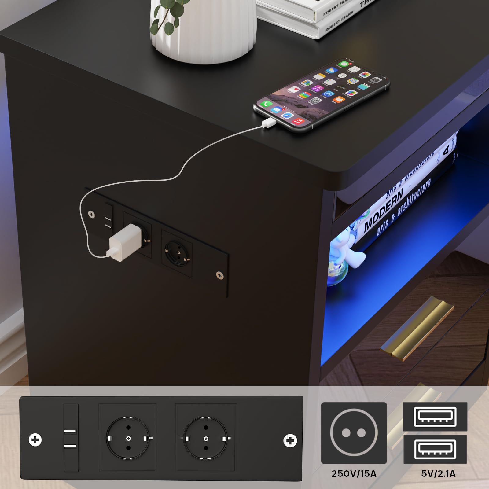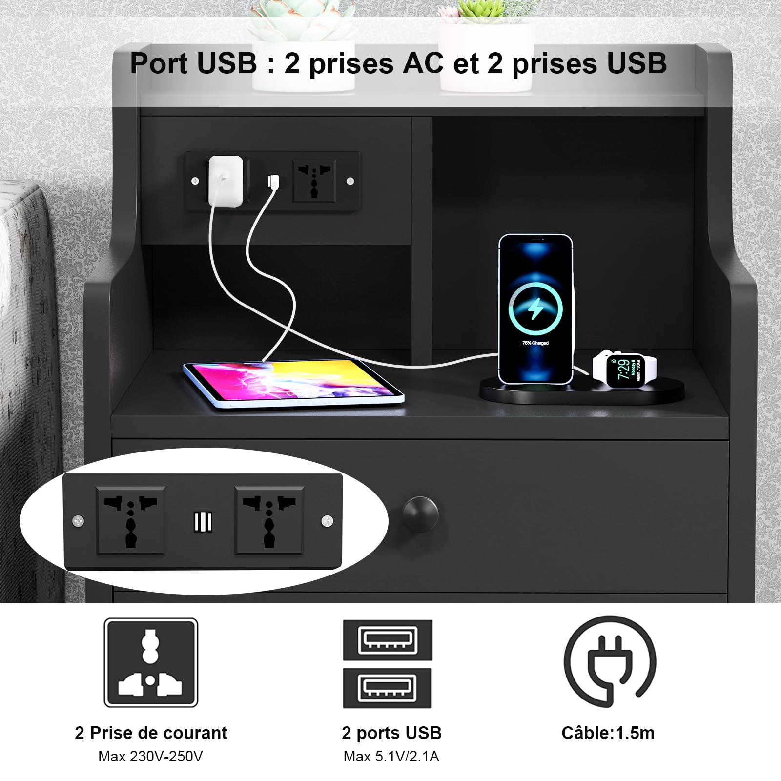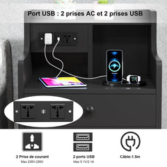 - 【AC Prise électrique】Cette table de chevet dispose de sa propre prise avec 2 connexions AC et 2 connexions USB. Cette table de nuit avec fonction de charge permet de recharger facilement les appareils mobiles tels que les téléphones portables, les tablettes, les lampes de bureau, les ordinateurs portables, les mini-ventilateurs, etc.
