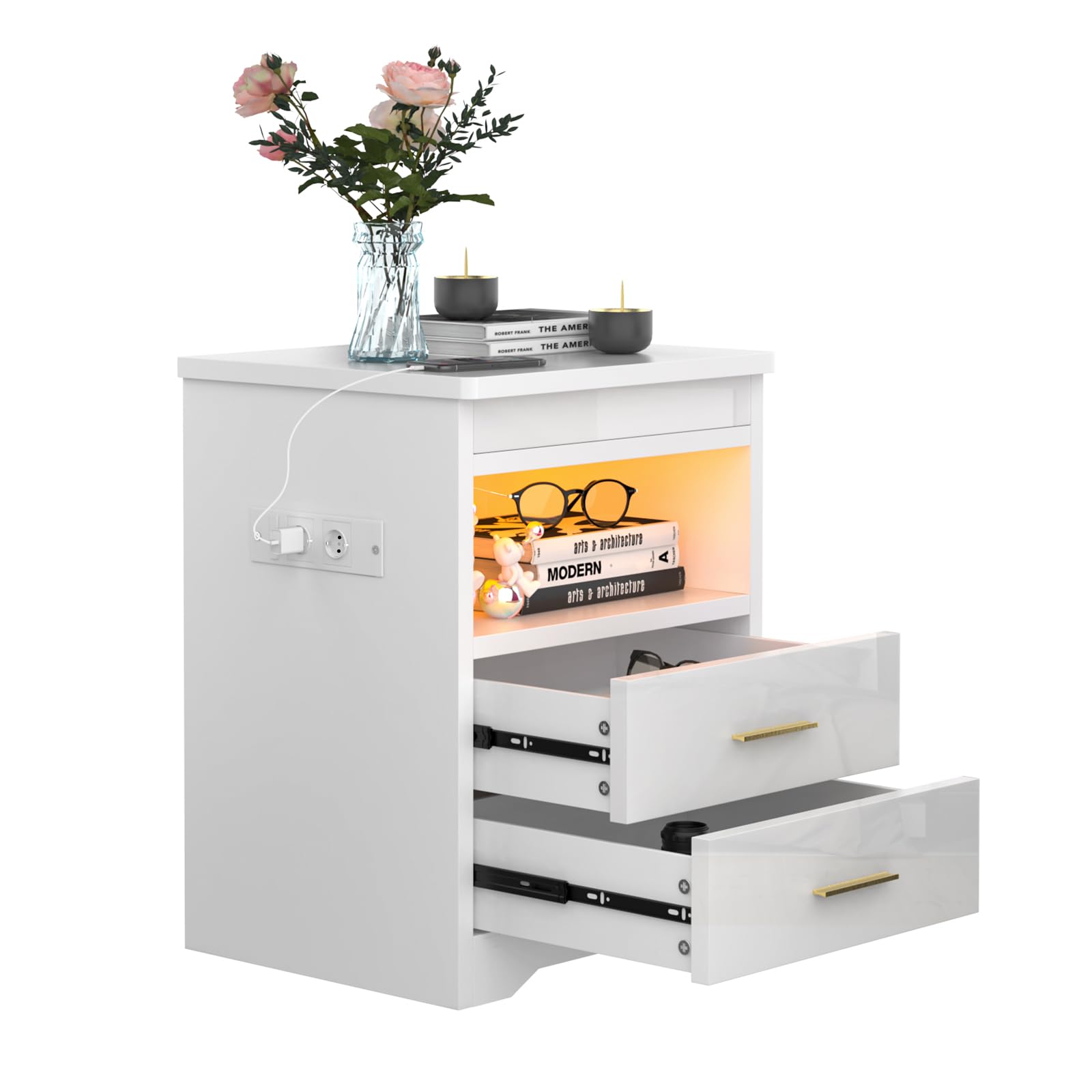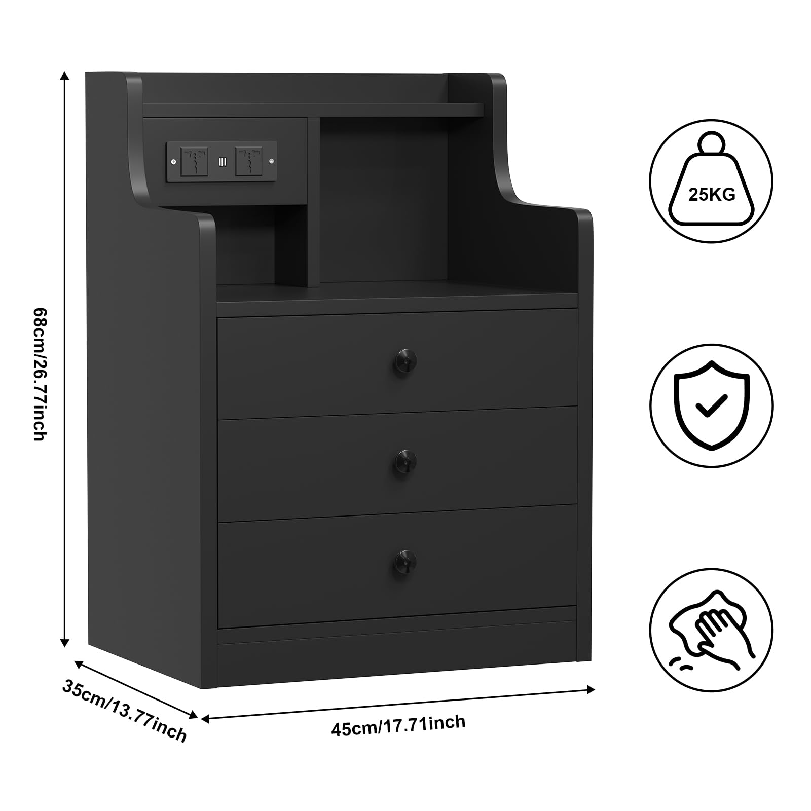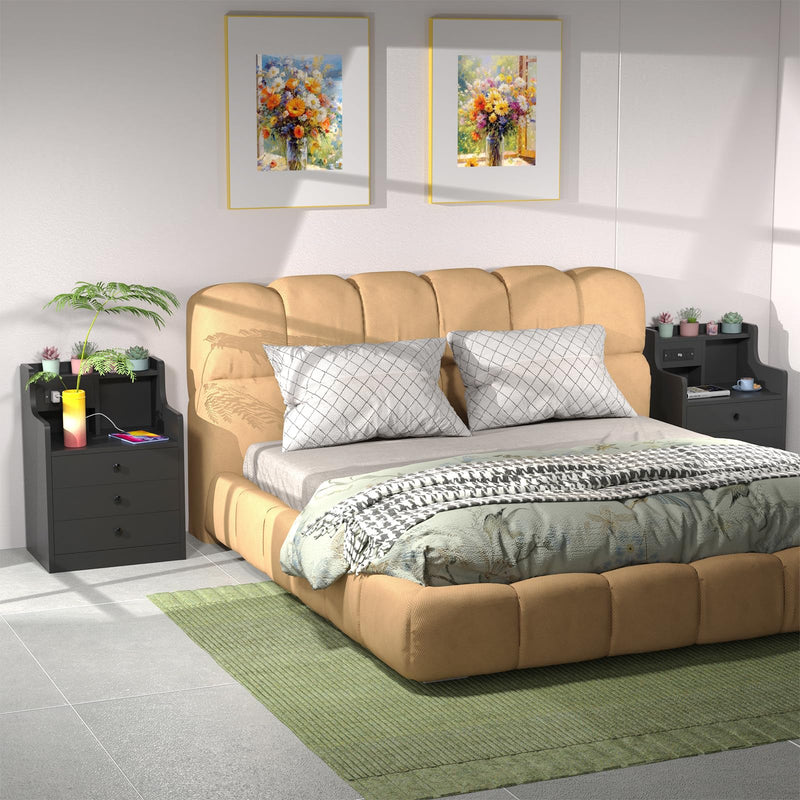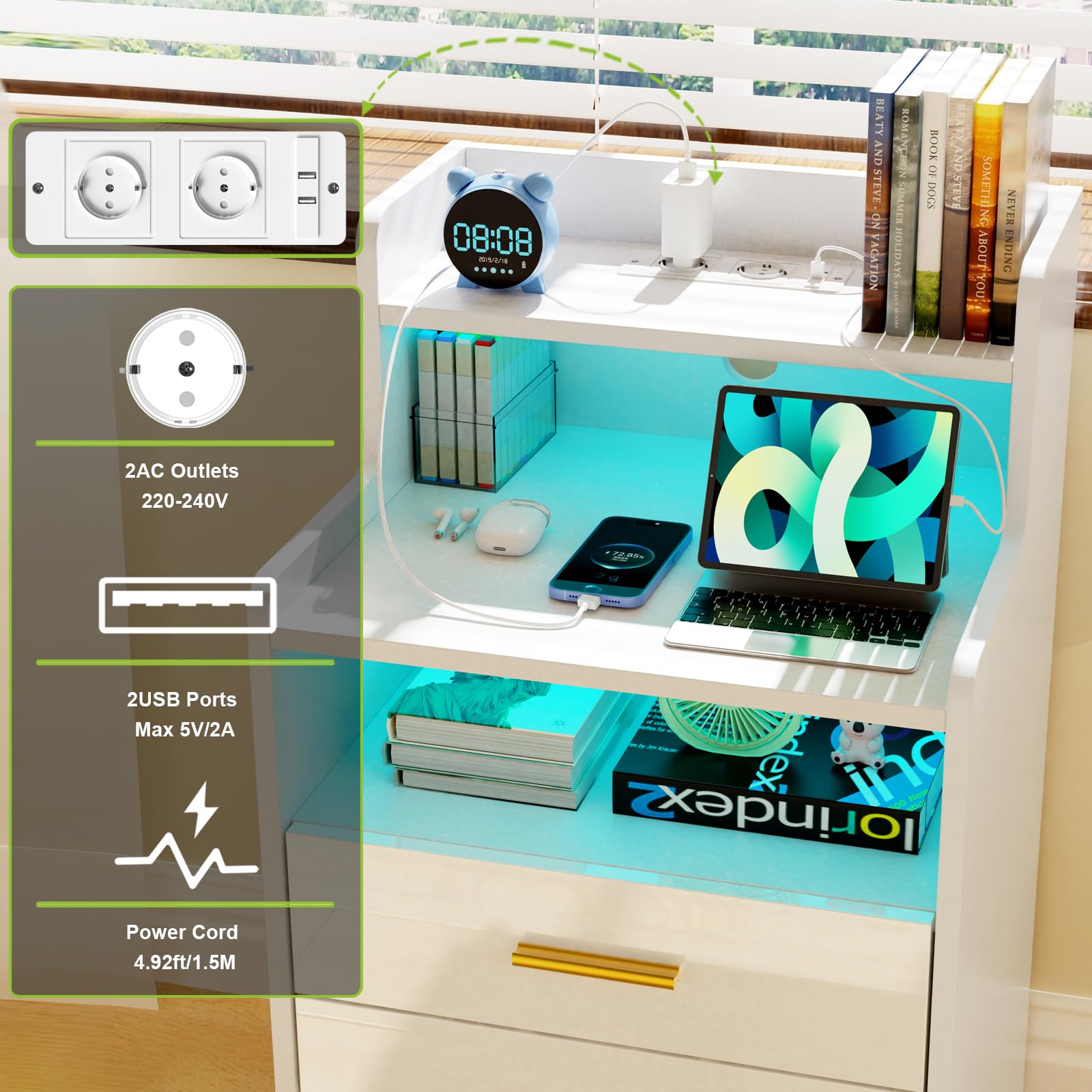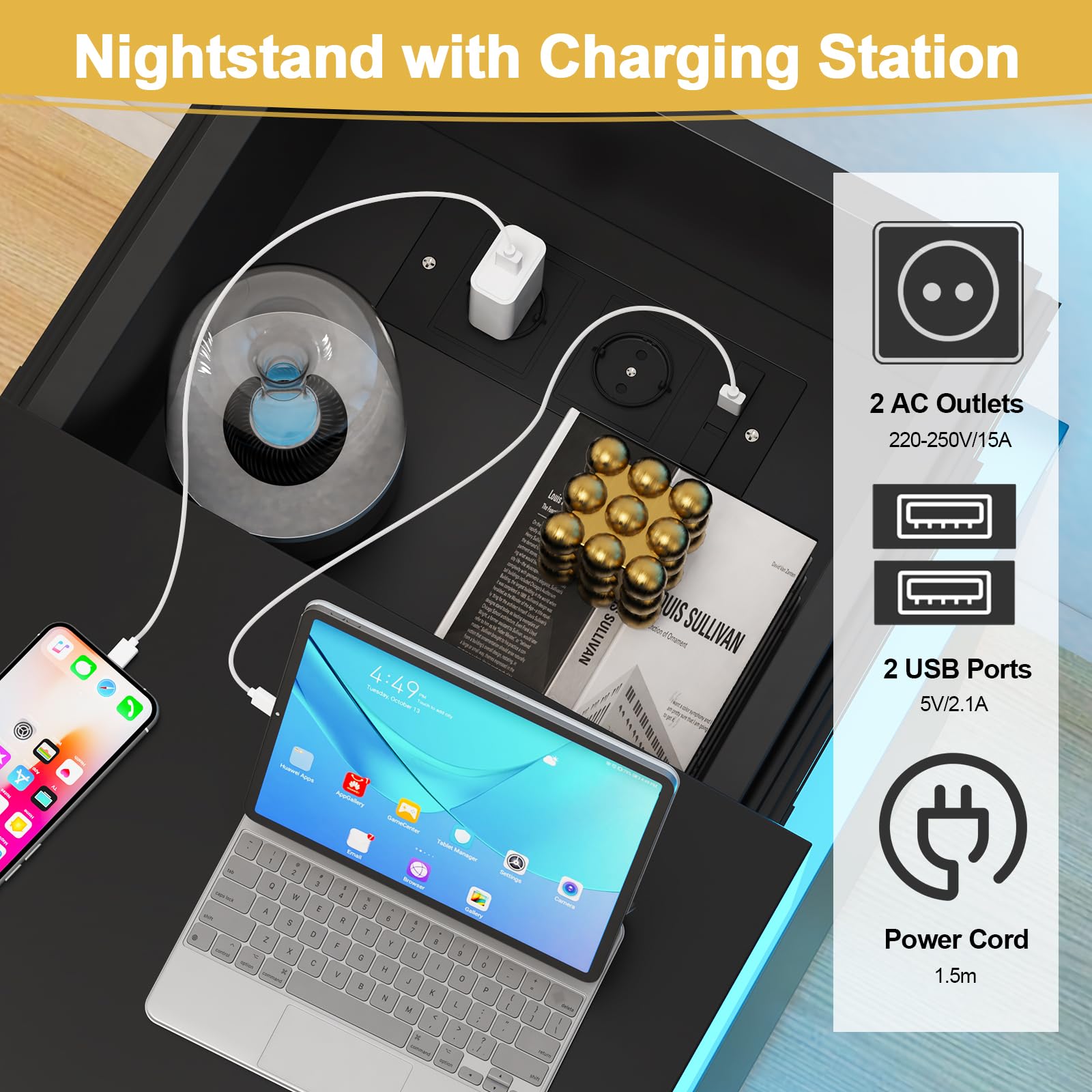 - 【AC Prise électrique】Cette table de chevet dispose de sa propre prise avec 2 connexions AC et 2 connexions USB. Cette table de nuit avec fonction de charge permet de recharger facilement les appareils mobiles tels que les téléphones portables, les tablettes, les lampes de bureau, les ordinateurs portables, les mini-ventilateurs, etc.