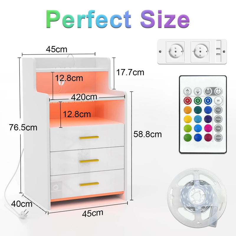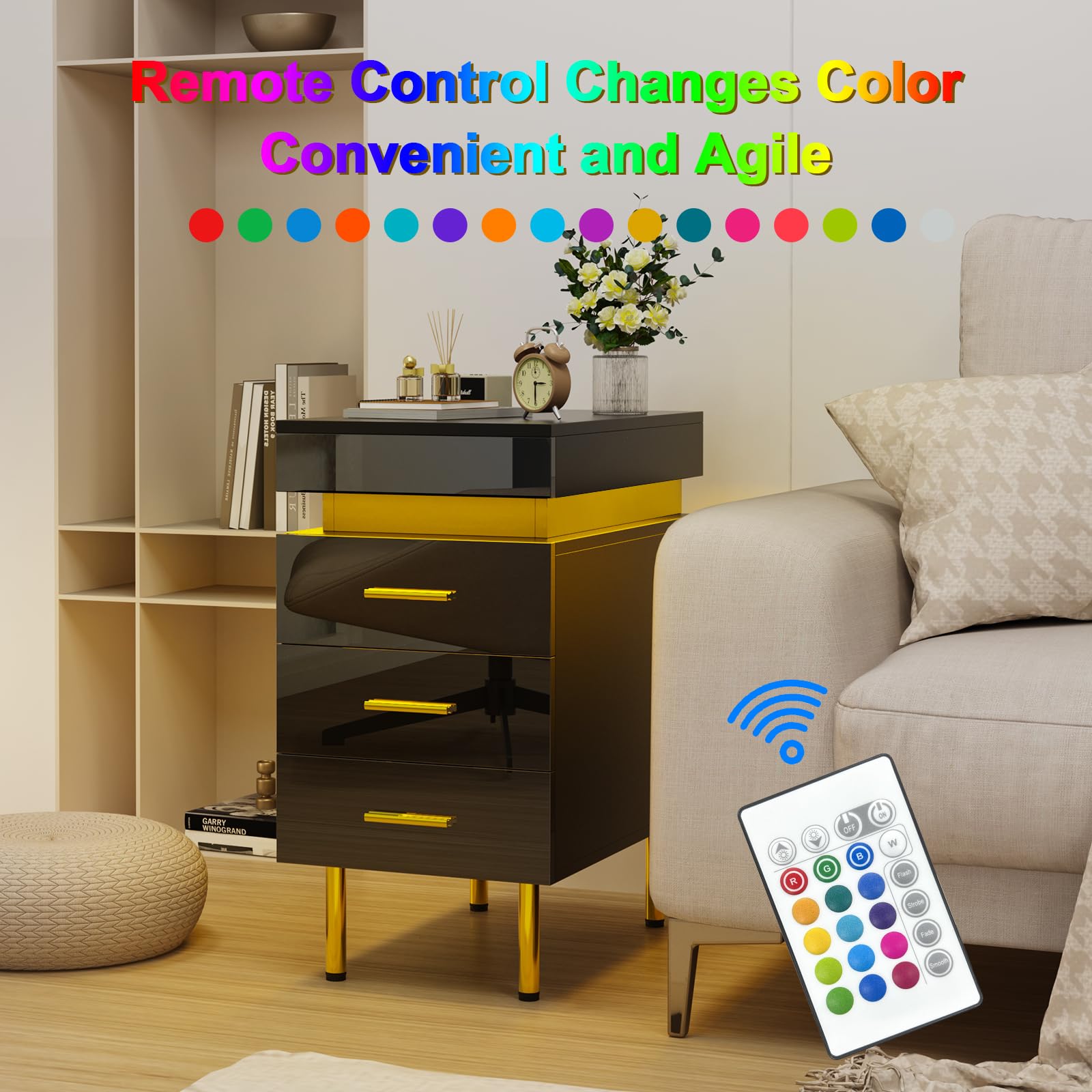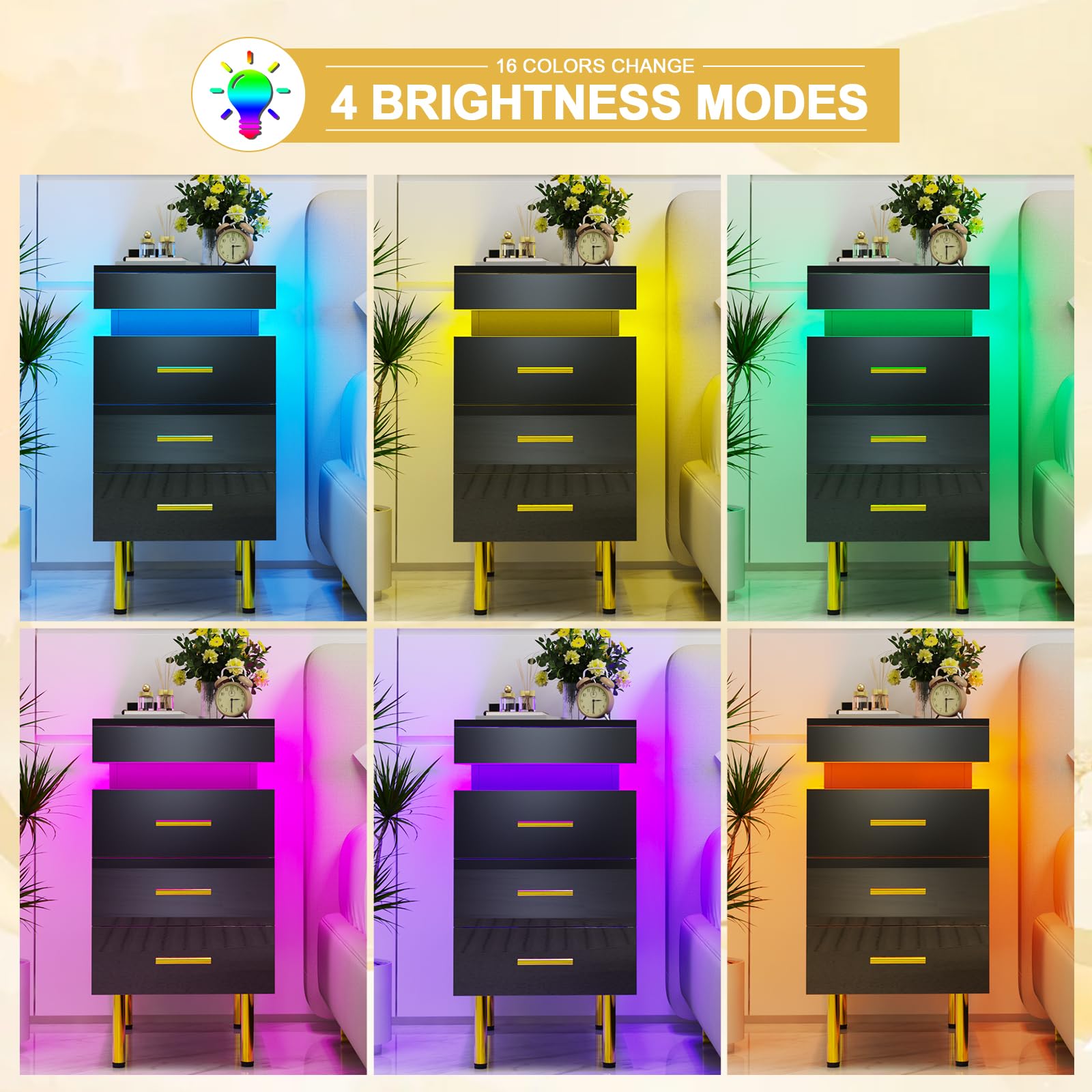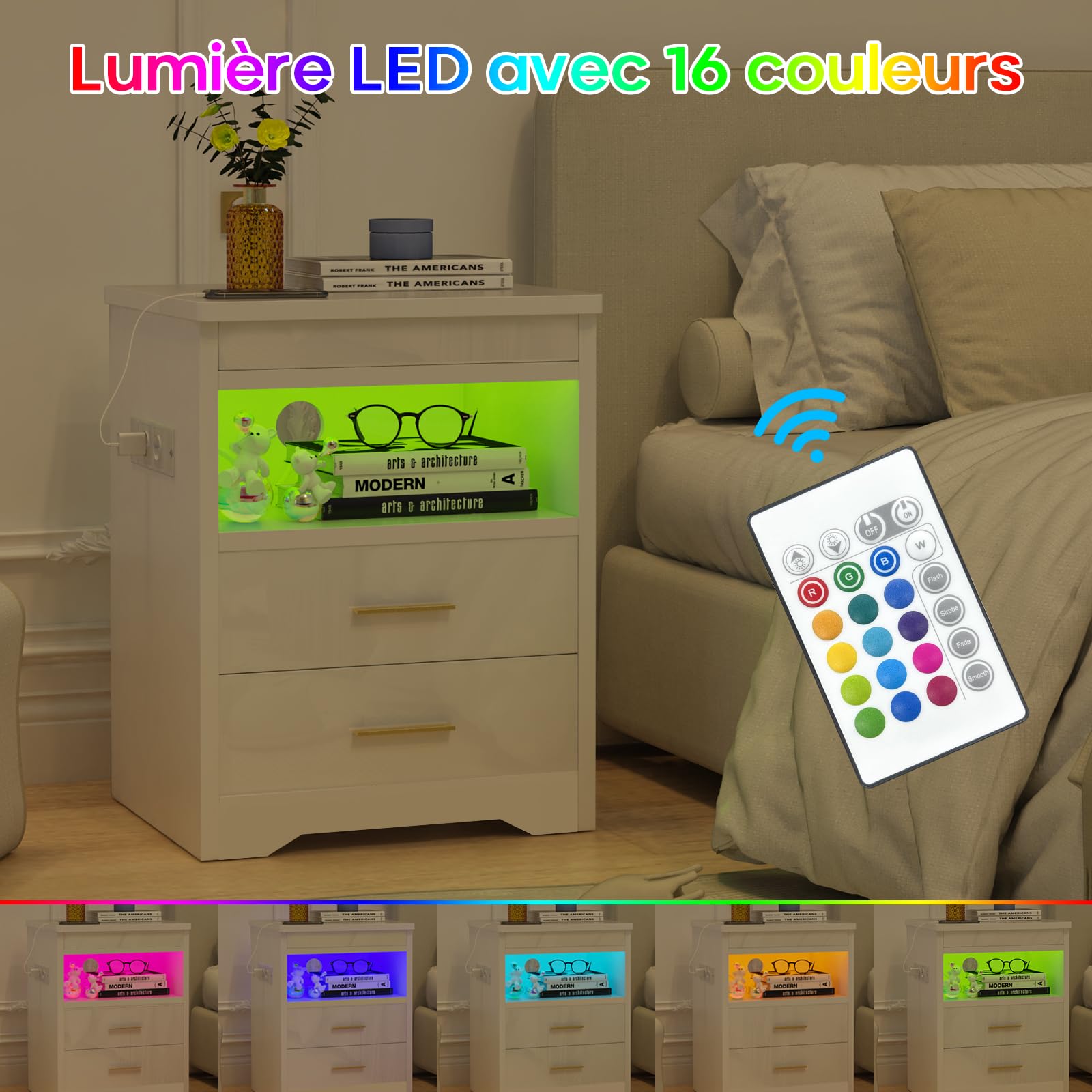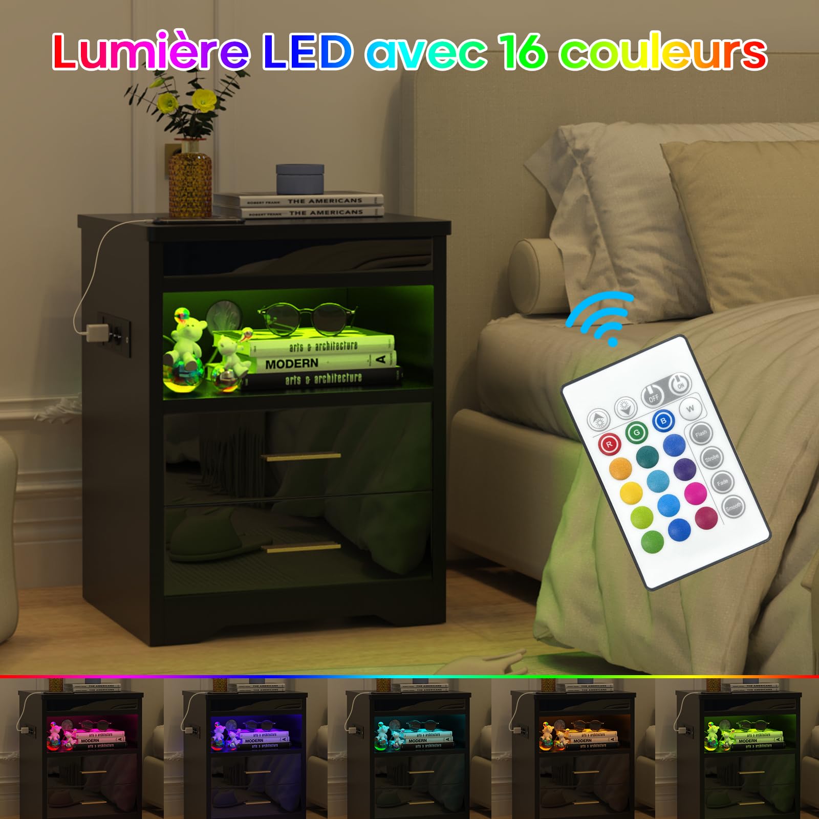 - 【Lumières LED réglables】Cette table de nuit est livrée avec des lumières LED de 16 couleurs RVB et 4 effets lumineux, vous pouvez facilement contrôler les couleurs et les modes avec la télécommande pour régler différentes lumières en fonction des différents designs de la pièce.