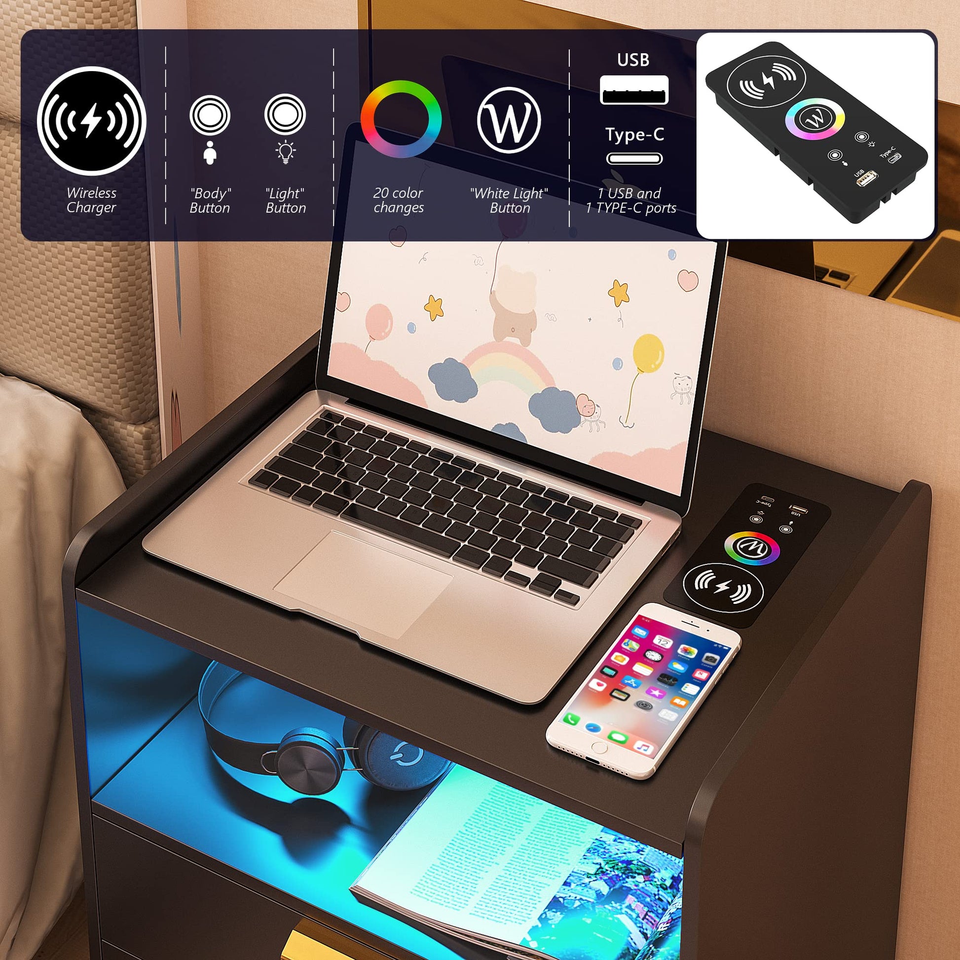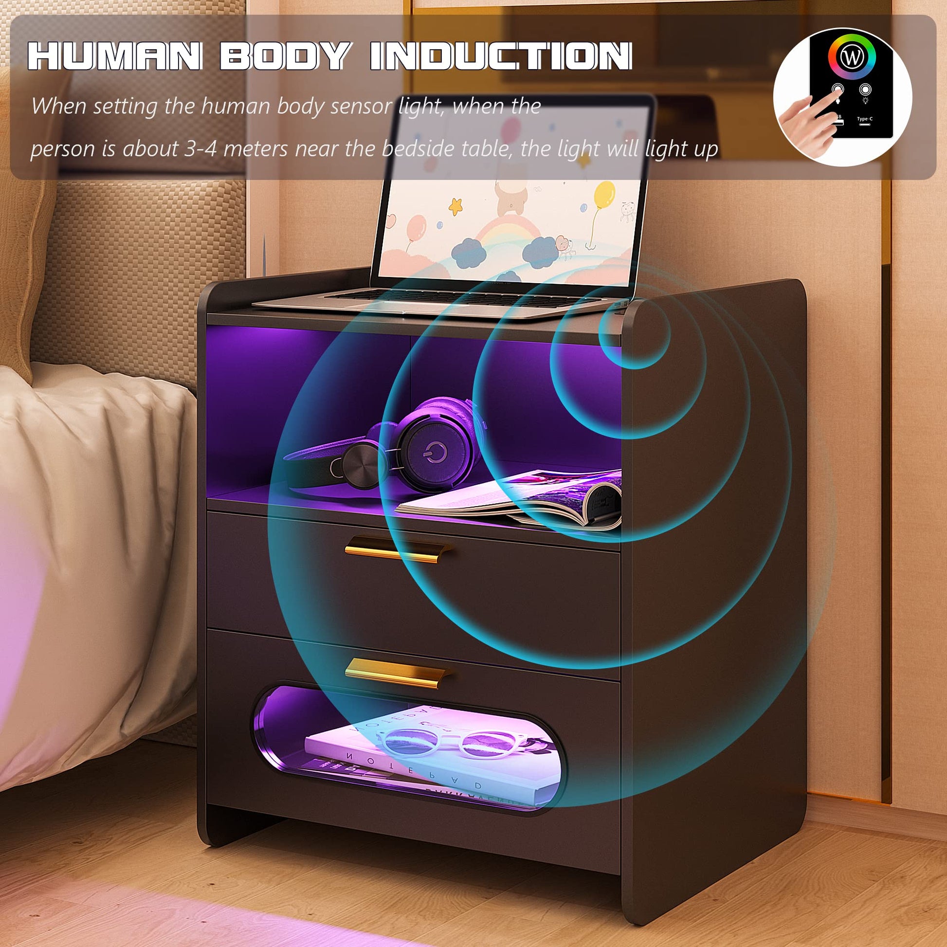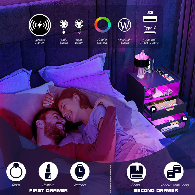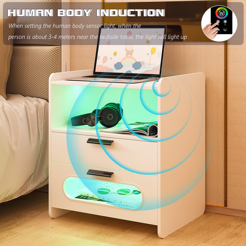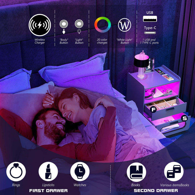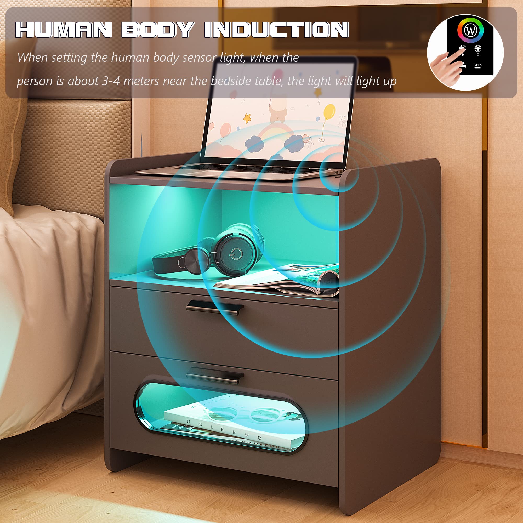 - 👍【Fonction de charge sans fil et ports USB et Type-C 】 : la table de chevet est disposée avec 1 station de charge sans fil et 1 port USB et 1 port de type C et fonction de détection du corps humain. Lorsque vous posez une table de nuit, la lumière LED s'allume automatiquement.