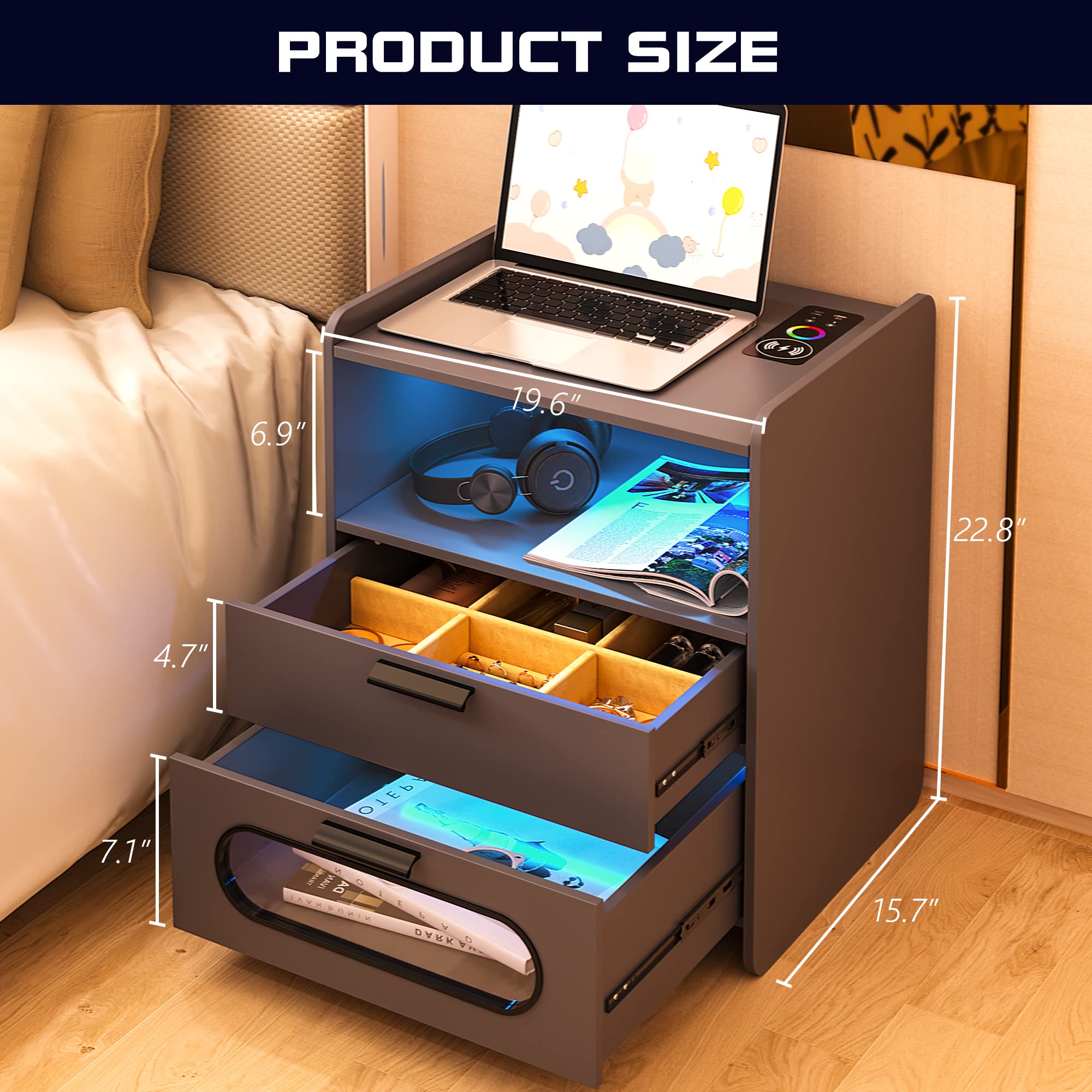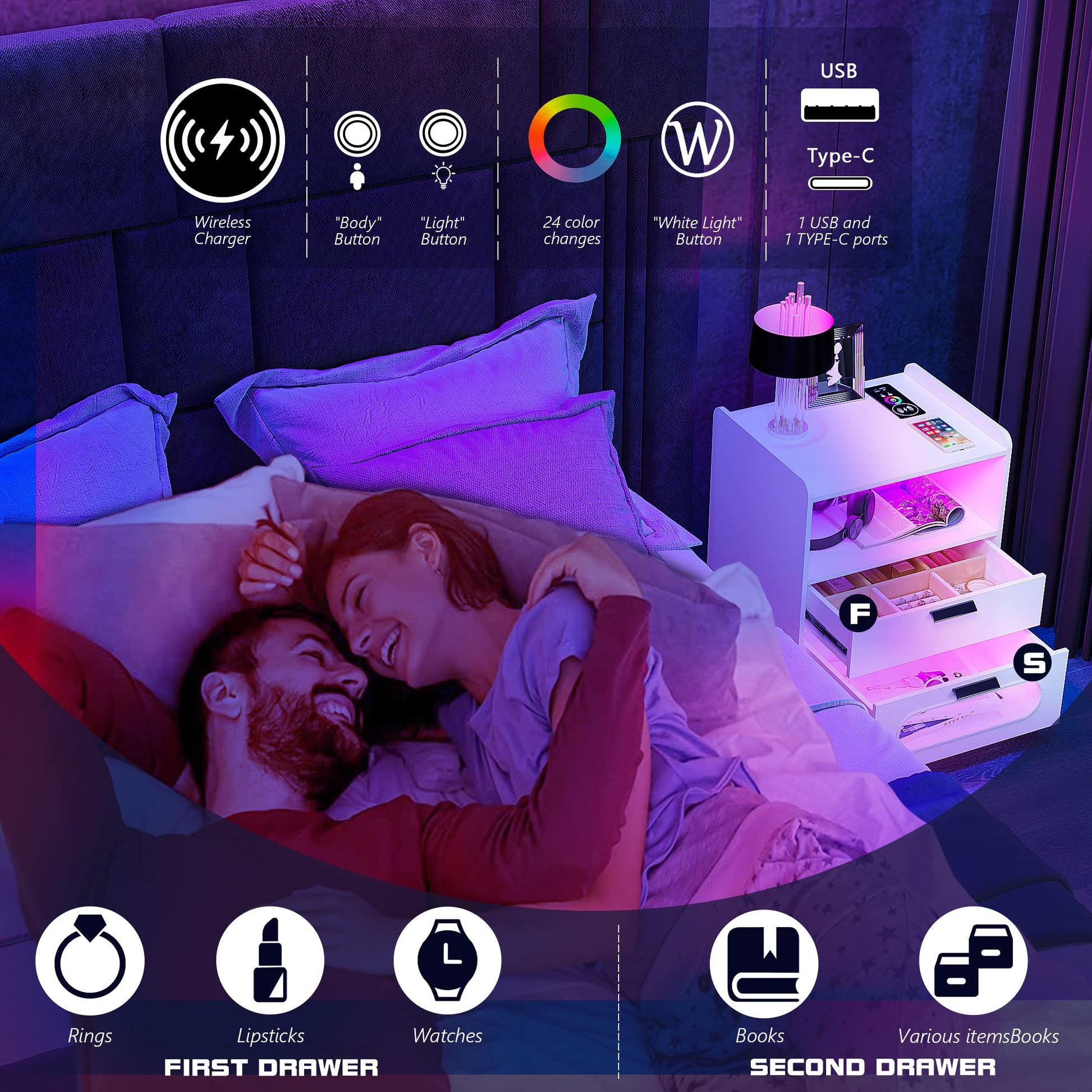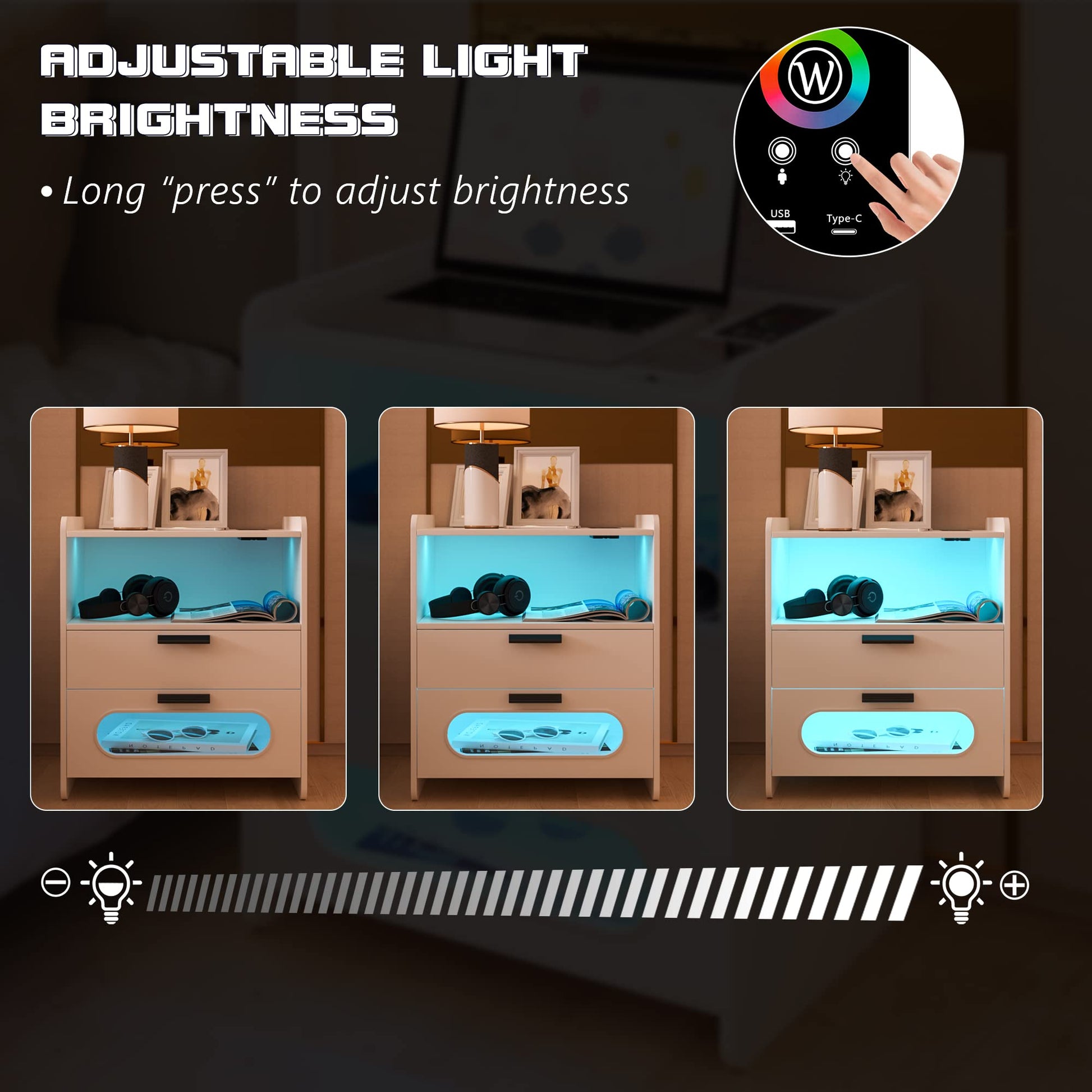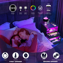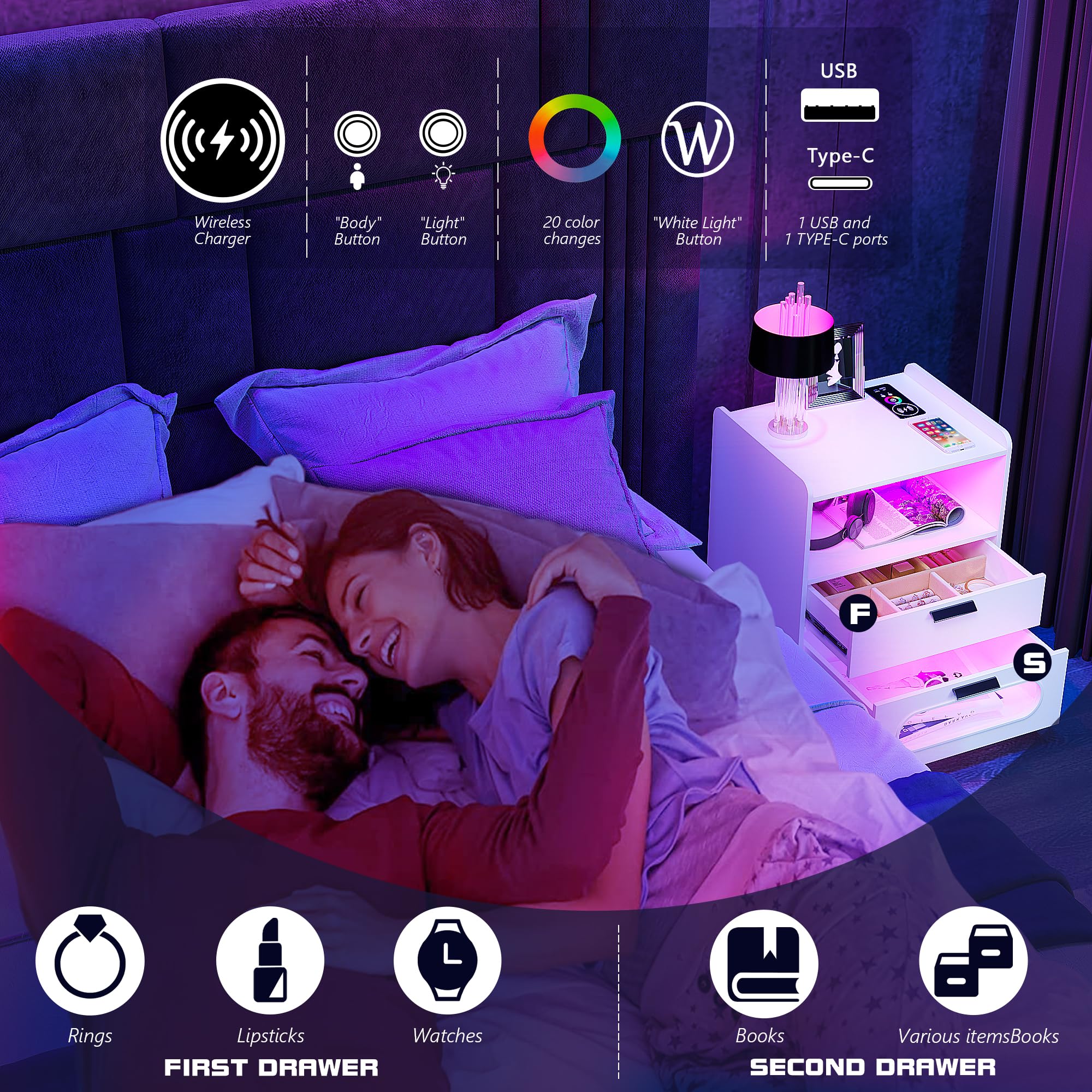 - 👍【Fonction de charge sans fil et ports USB et Type-C 】 : la table de chevet est disposée avec 1 station de charge sans fil et 1 port USB et 1 port de type C et fonction de détection du corps humain. Lorsque vous posez une table de nuit, la lumière LED s'allume automatiquement.
