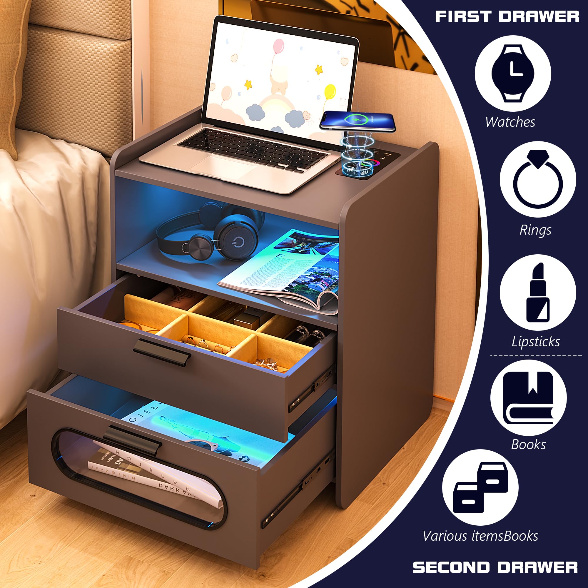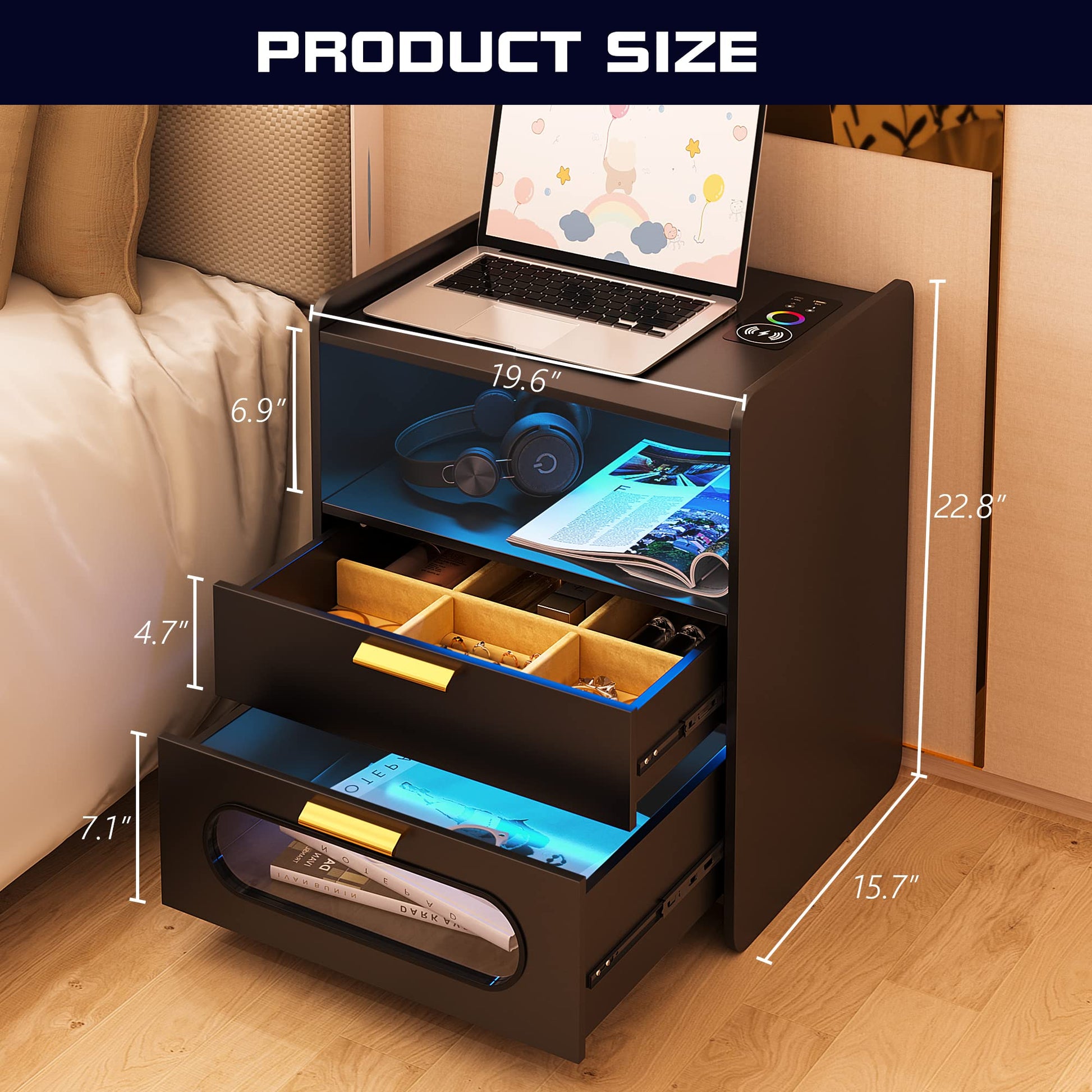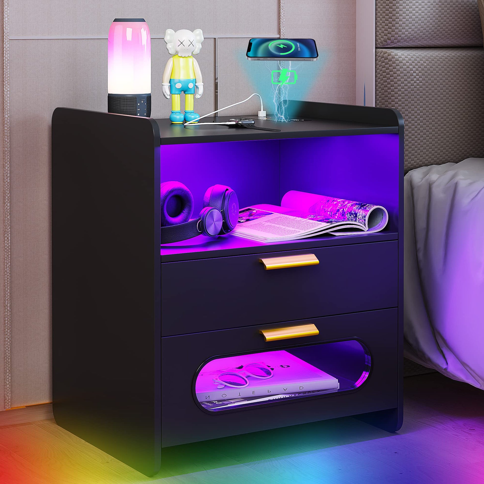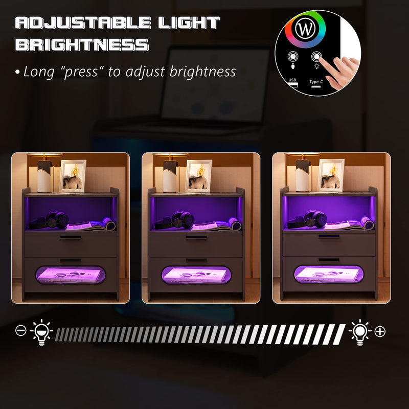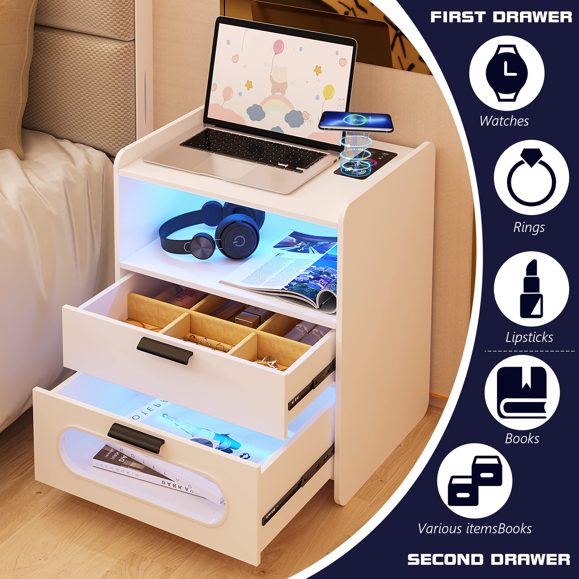 - 👍【Fonction de charge sans fil et ports USB et Type-C 】 : la table de chevet est disposée avec 1 station de charge sans fil et 1 port USB et 1 port de type C et fonction de détection du corps humain. Lorsque vous posez une table de nuit, la lumière LED s'allume automatiquement.