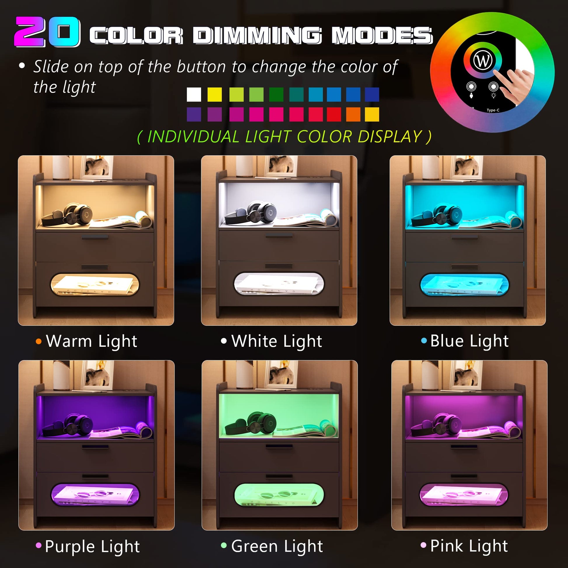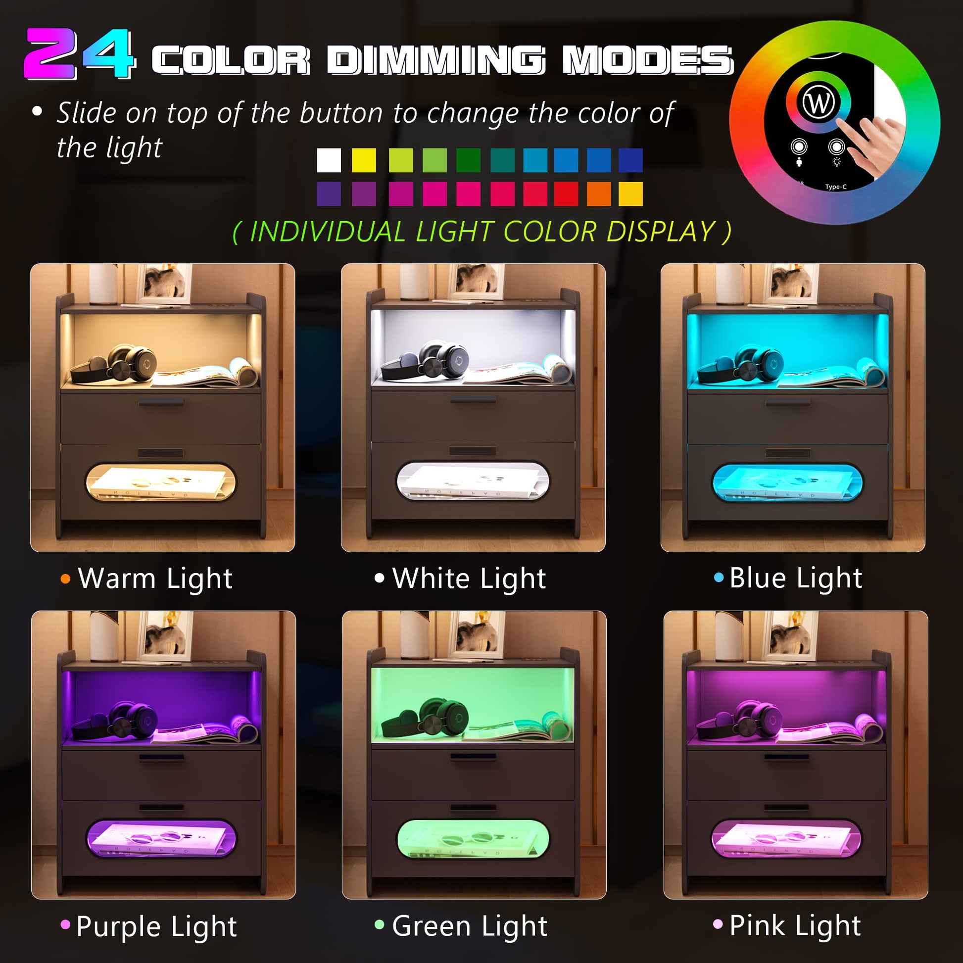 - 💡【Capteur automatique 24 couleurs de lumière à intensité variable】 : table de chevet LED avec 24 couleurs à intensité variable pour vous permettre d'ajuster la couleur de fond que vous aimez à tout moment. Le capteur de corps humain rend votre vie plus intelligente.
