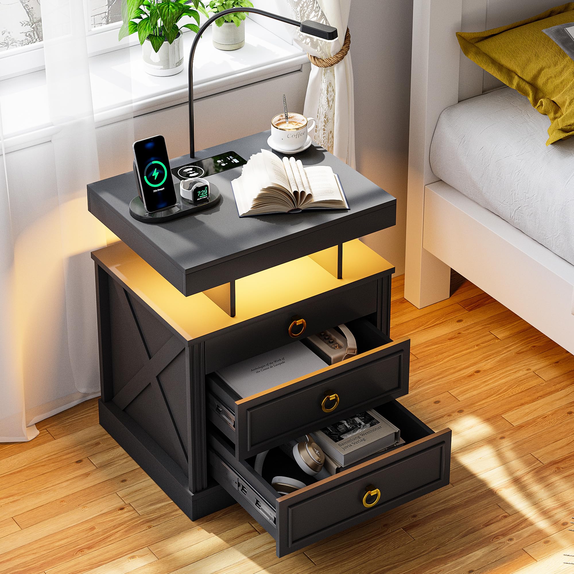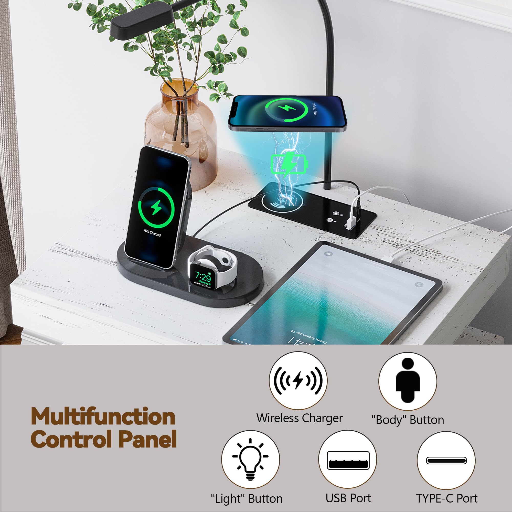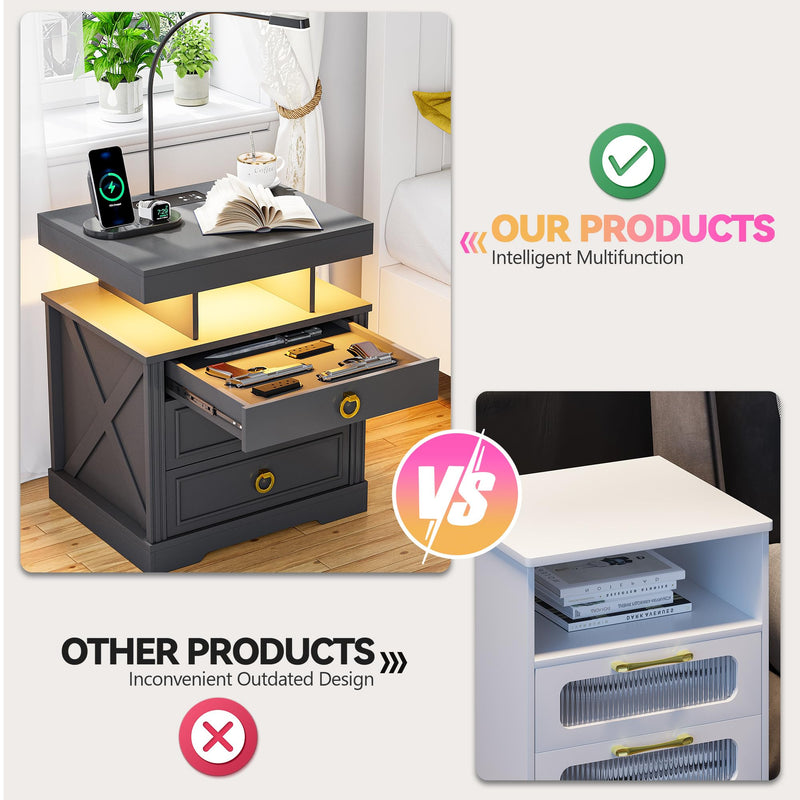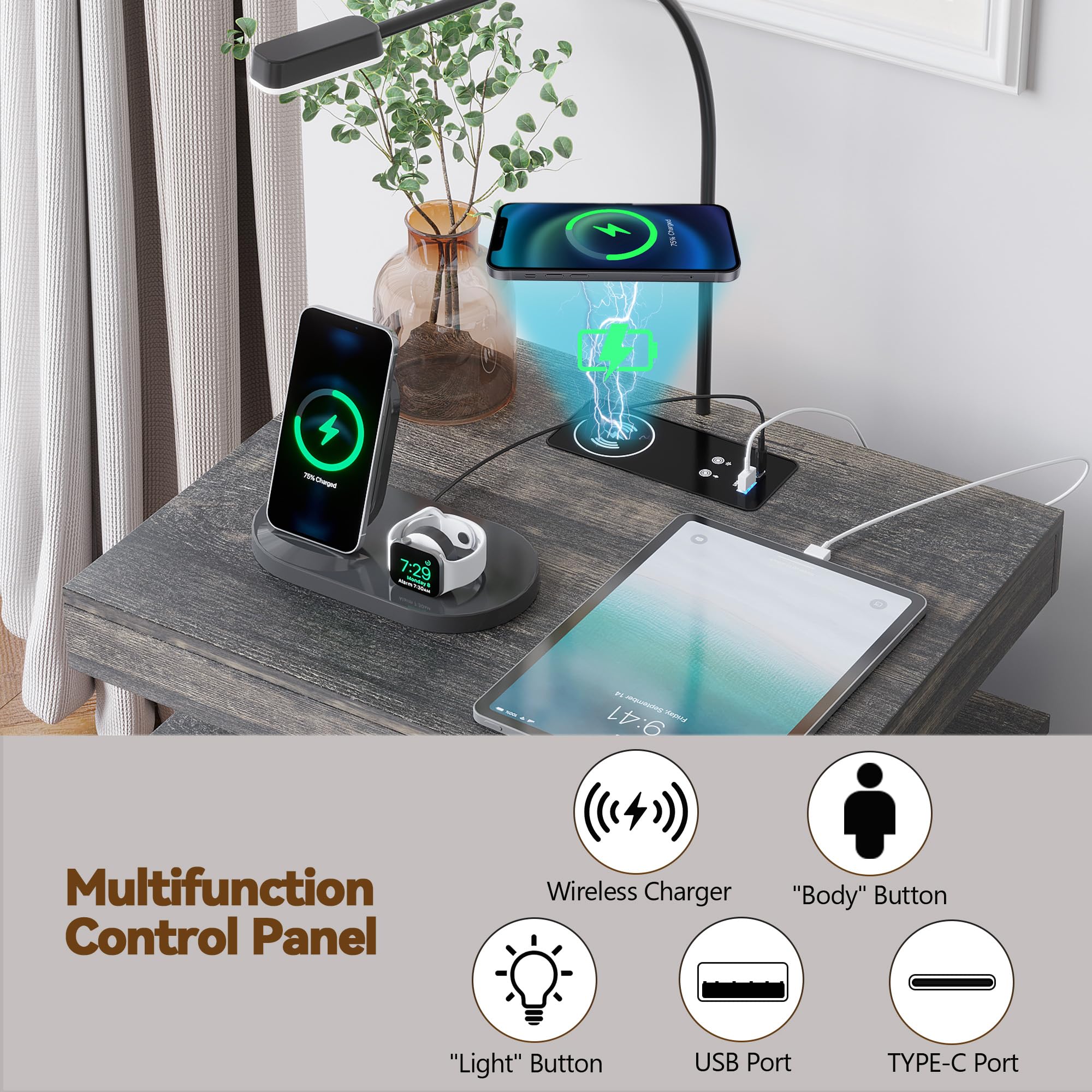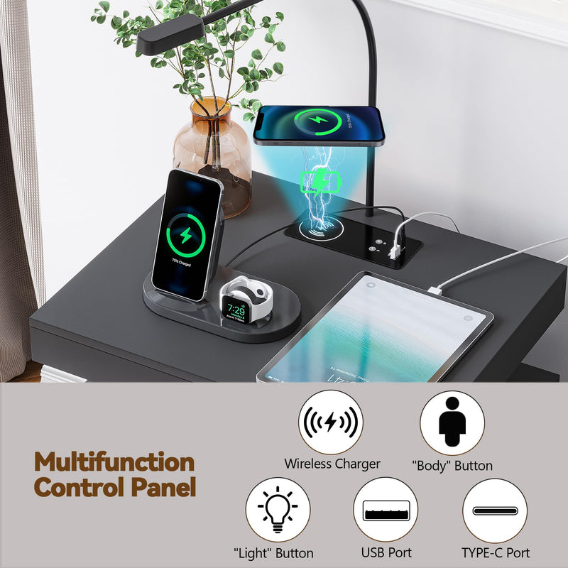 - 【Station de charge pratique】 Cette table de chevet intelligente est livrée avec une station de charge sans fil pour charger facilement votre téléphone sans câbles, en plus des ports USB et