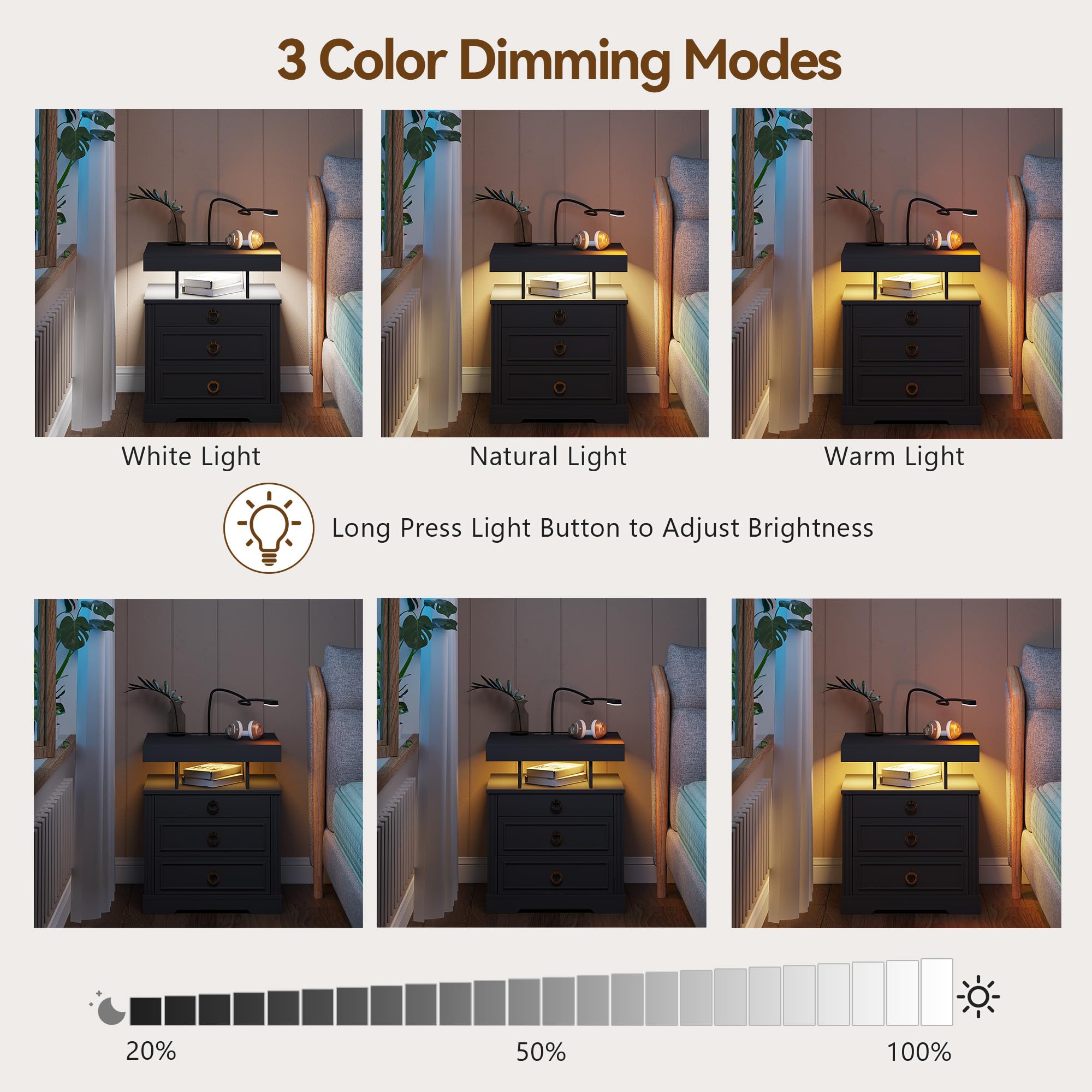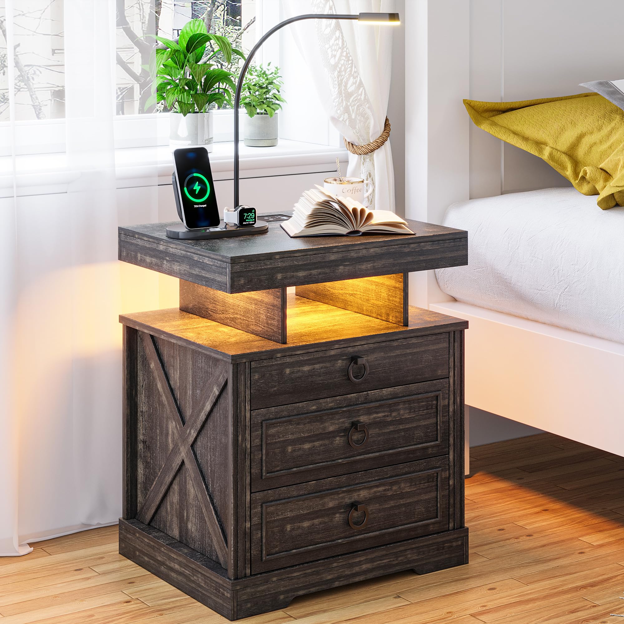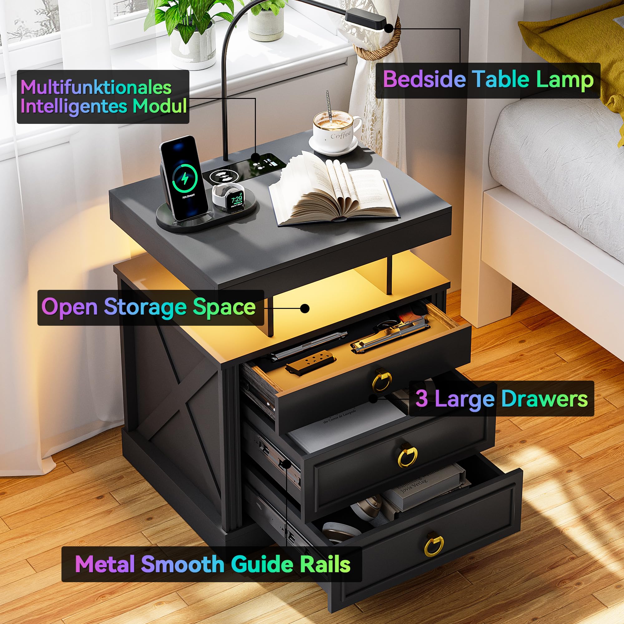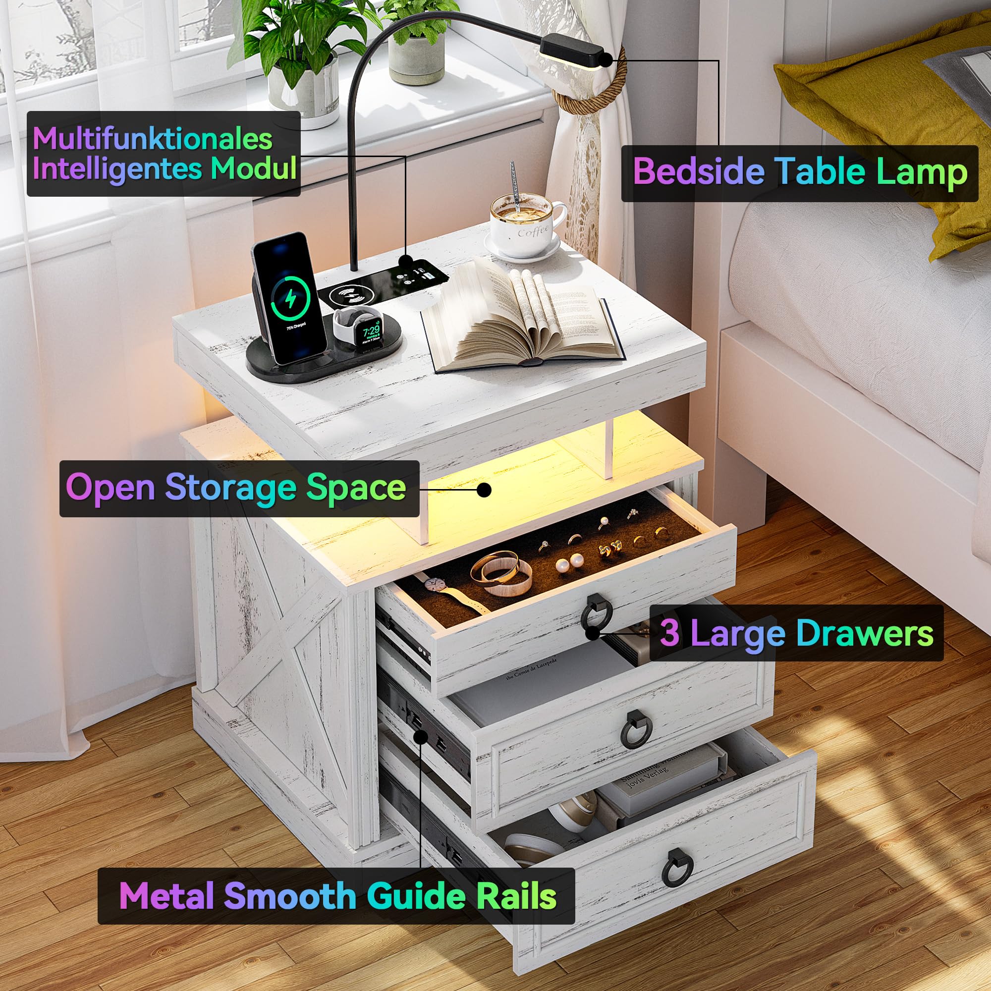 - 【Station de charge pratique】 Cette table de chevet intelligente est livrée avec une station de charge sans fil pour charger facilement votre téléphone sans câbles, en plus des ports USB et