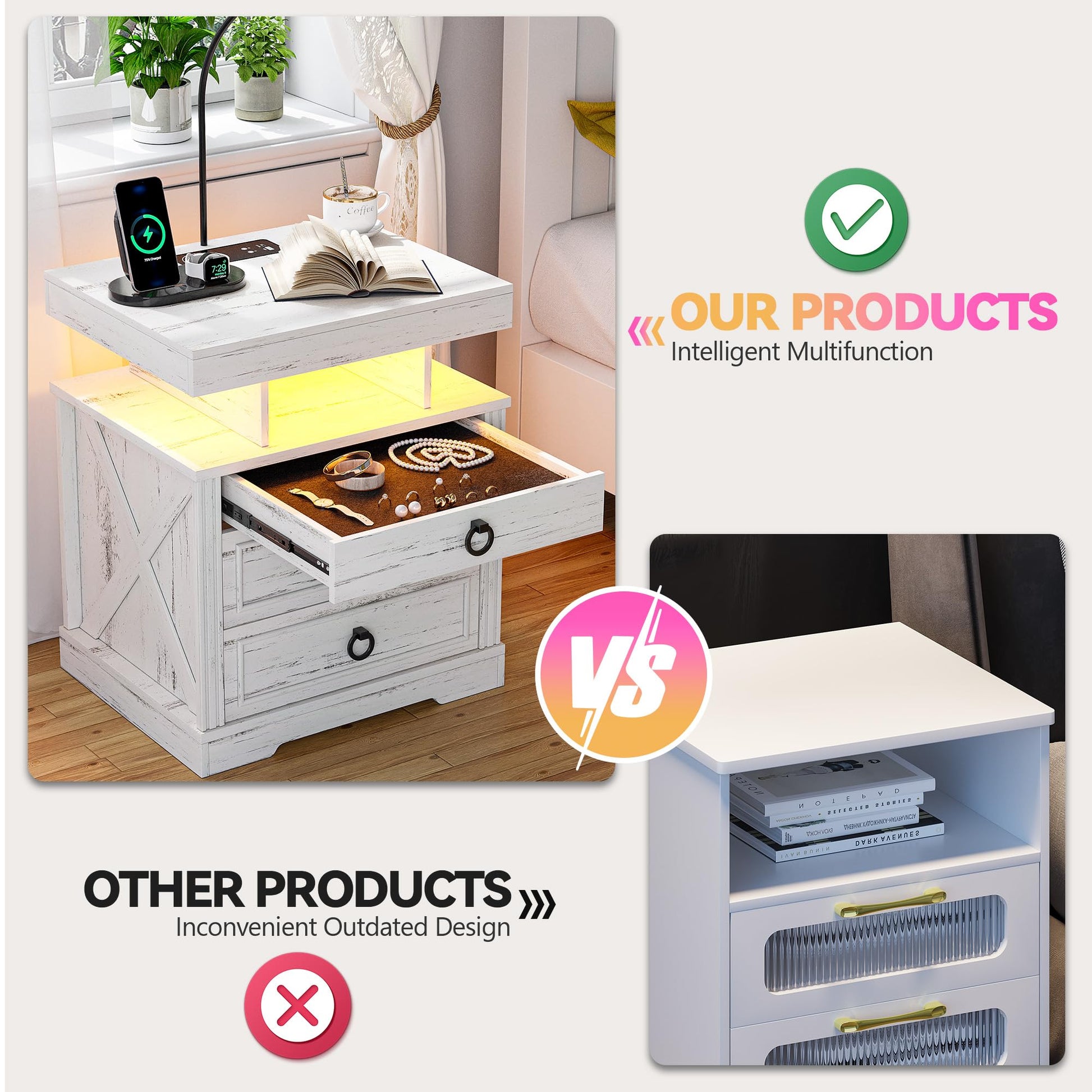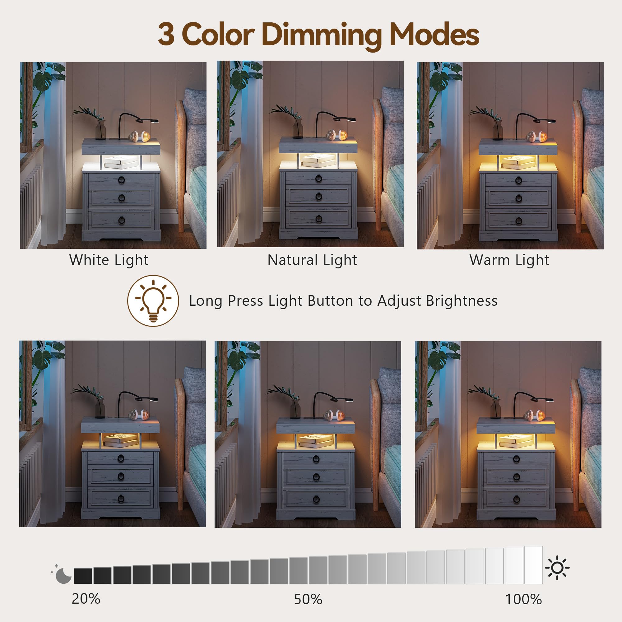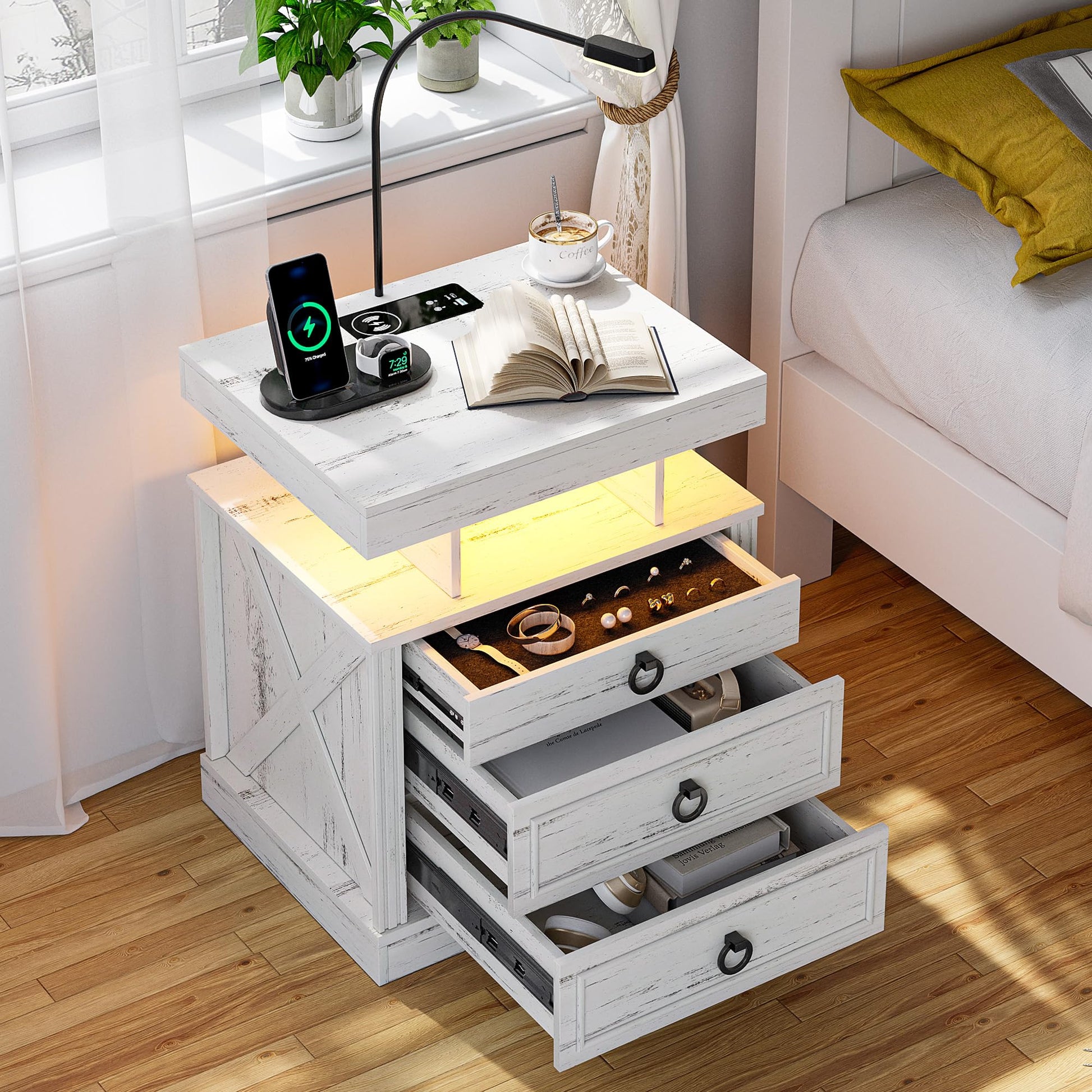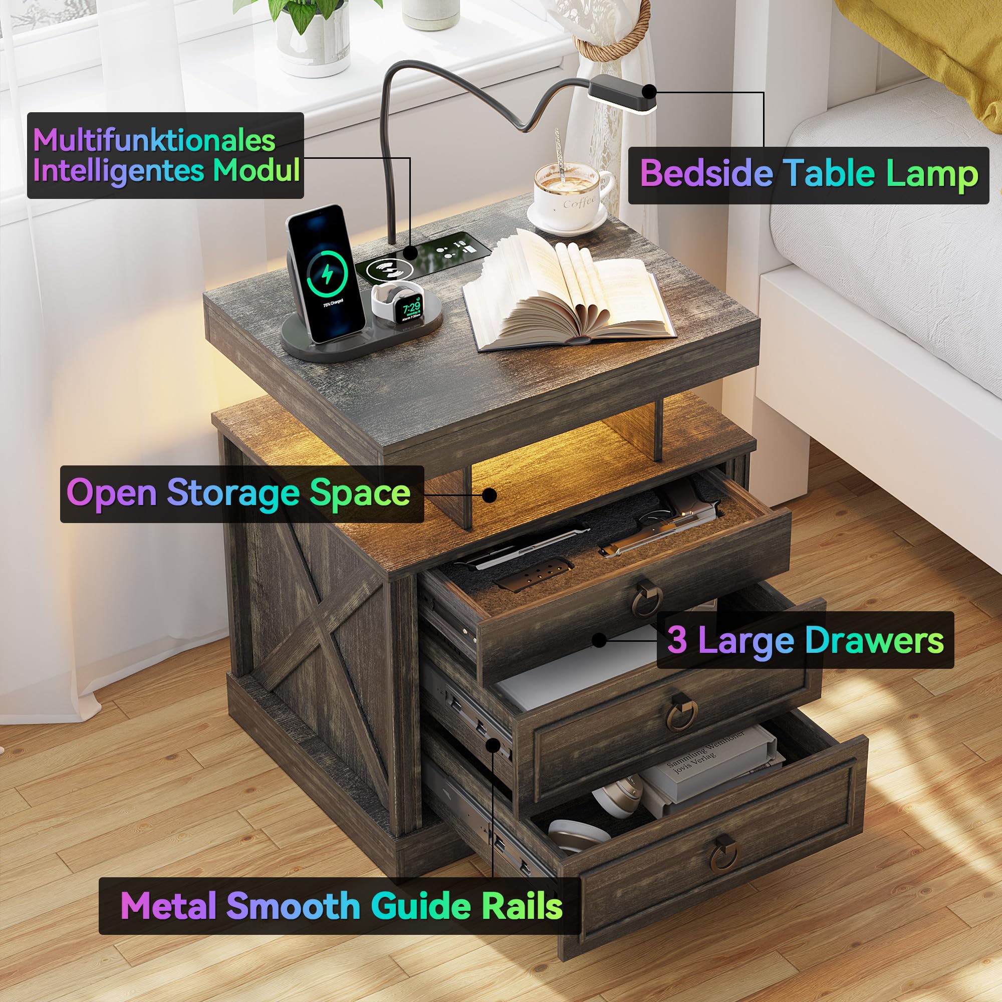 - 【Station de charge pratique】 Cette table de chevet intelligente est livrée avec une station de charge sans fil pour charger facilement votre téléphone sans câbles, en plus des ports USB et