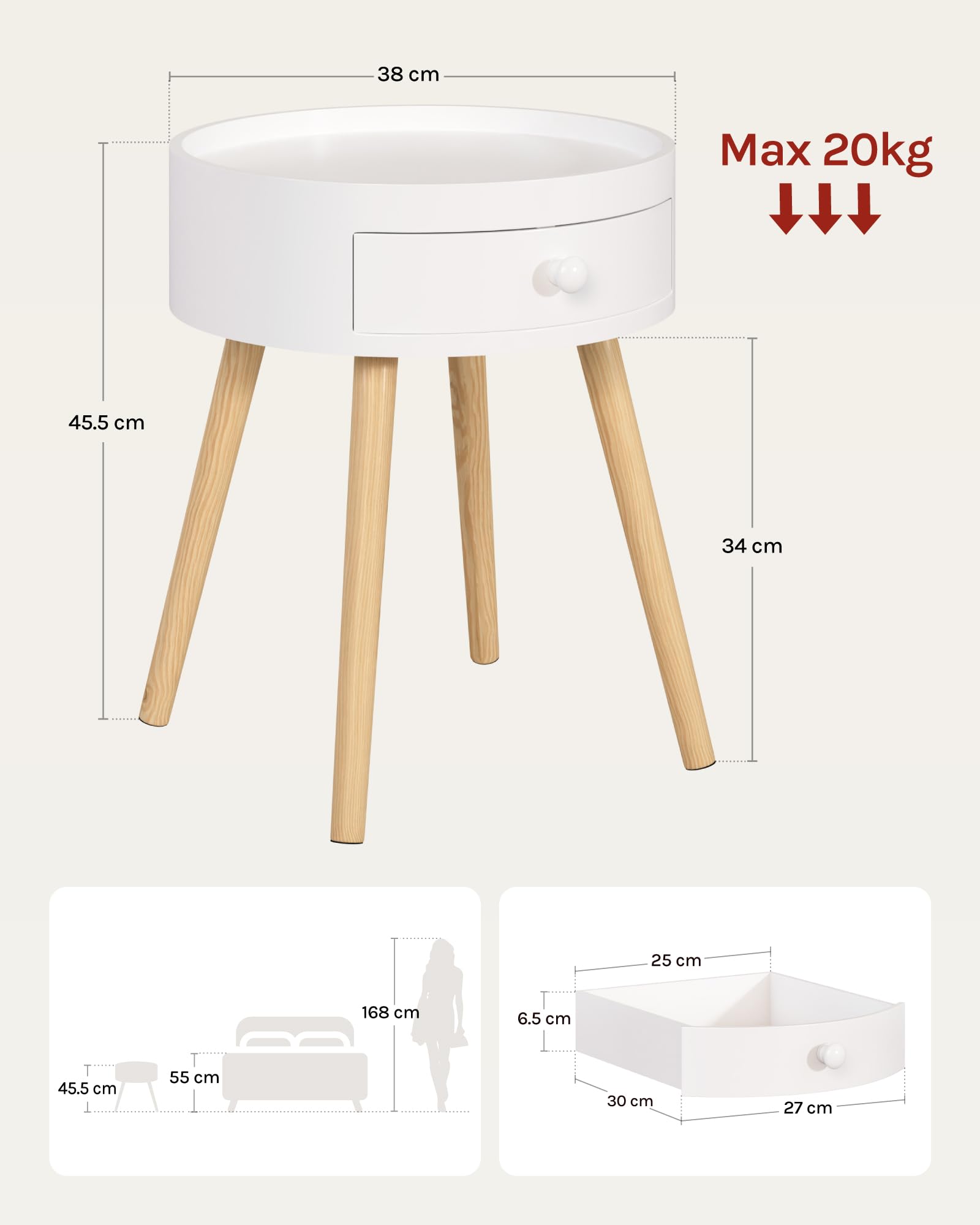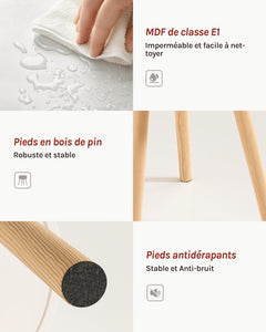 - ROBUSTE & DURABLE : Le corps du produit est fabriqué à partir de matériaux à base de bois certifié FSC. Fabriqué en MDF de norme E1 avec une finition laquée, le corps de la table de nuit adulte est robuste, hydrofuge et facile à nettoyer. Les pieds en bois de pin de 3,5 cm de diamètre à une structure évasée augmente la stabilité de la table. Le tiroir est équipé de butoirs pour éviter la chute au tirage