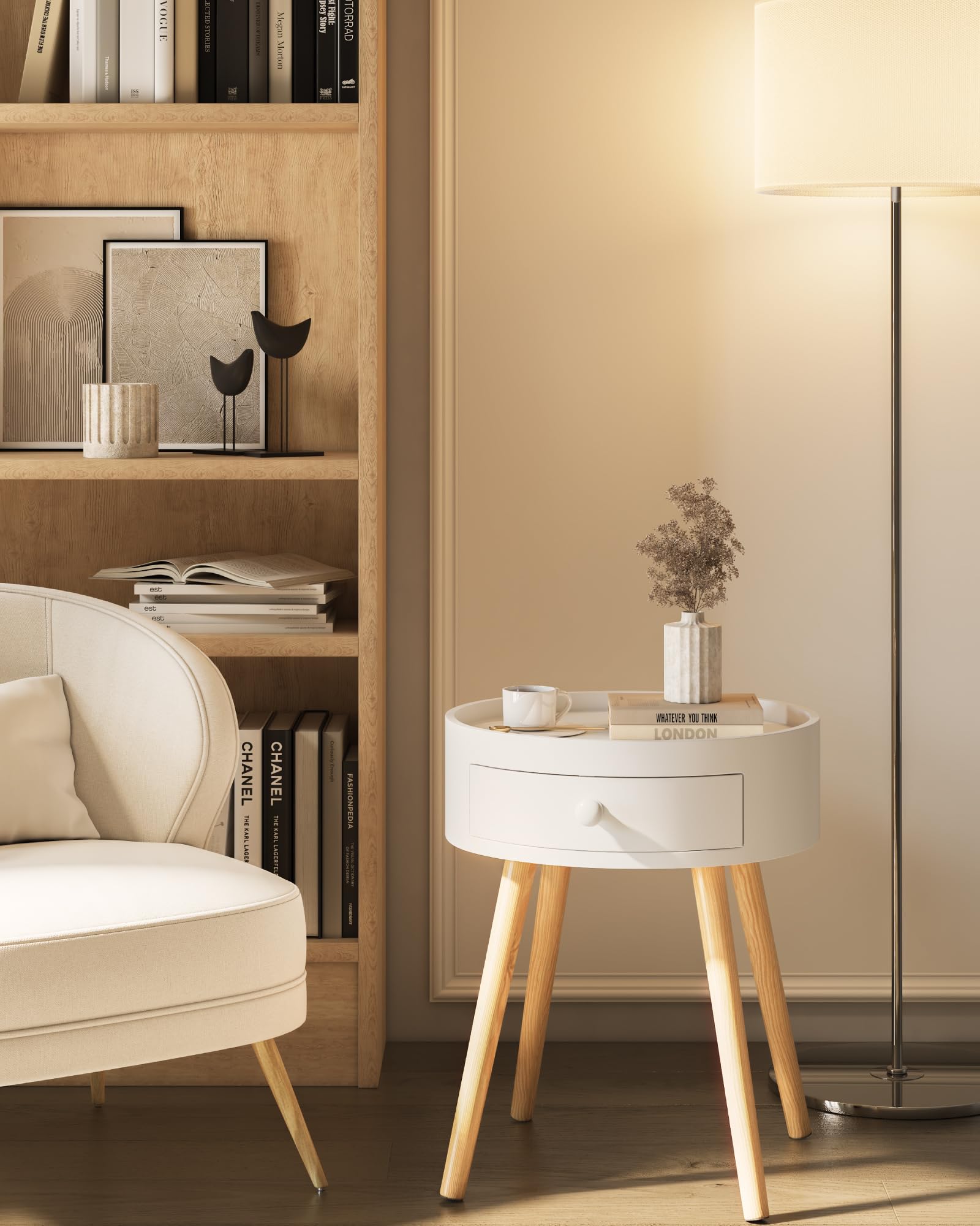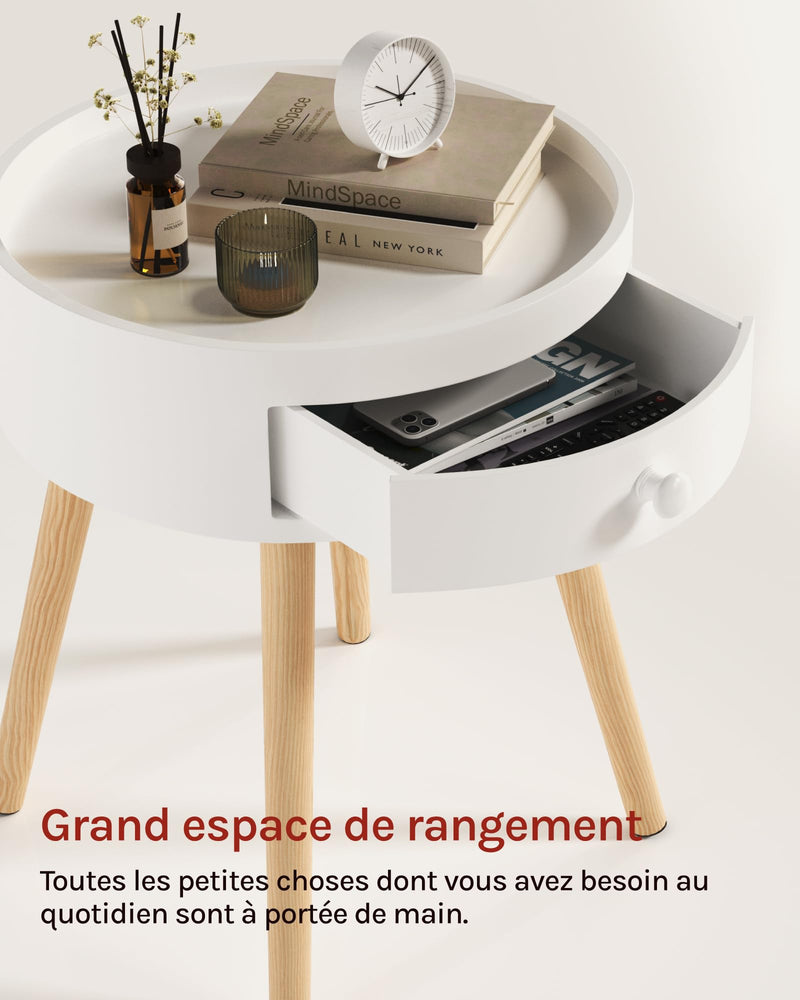 - ESPACE DE RANGEMENT : La lampe, le réveil, la tasse et d'autres objets peuvent être placés sur le plateau de la petite table ronde. Les petits objets tels que les clés, les télécommandes, les chargeurs peuvent être soigneusement rangés dans le tiroir et faciles à trouver tout en gardant la pièce propre et organisée