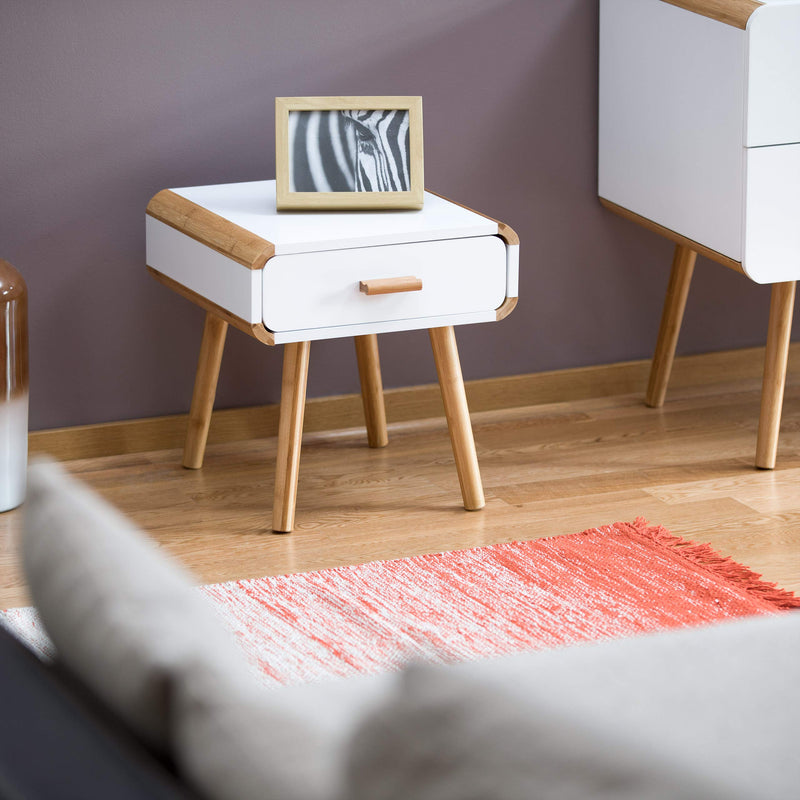 Cette table de chevet blanche avec tiroir est tout simplement belle. Le mélange entre le blanc brillant du plateau et le reste en couleur bois donne un air de design nordique. Le tiroir vous permet de ranger un livre, magazine et d’autres objets. Déposez une lampe de chevet ou votre réveil sur la surface. Utilisez la table comme table de chevet dans votre couloir ou votre salon. Cette petite table design convient très bien pour un intérieur lumineux.