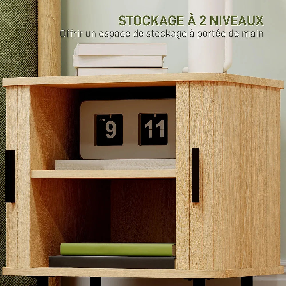 - PORTES COULISSANTES : Doté de portes coulissantes, ce chevet de lit offre un accès facilité à vos affaires tout en conservant une esthétique ordonnée.