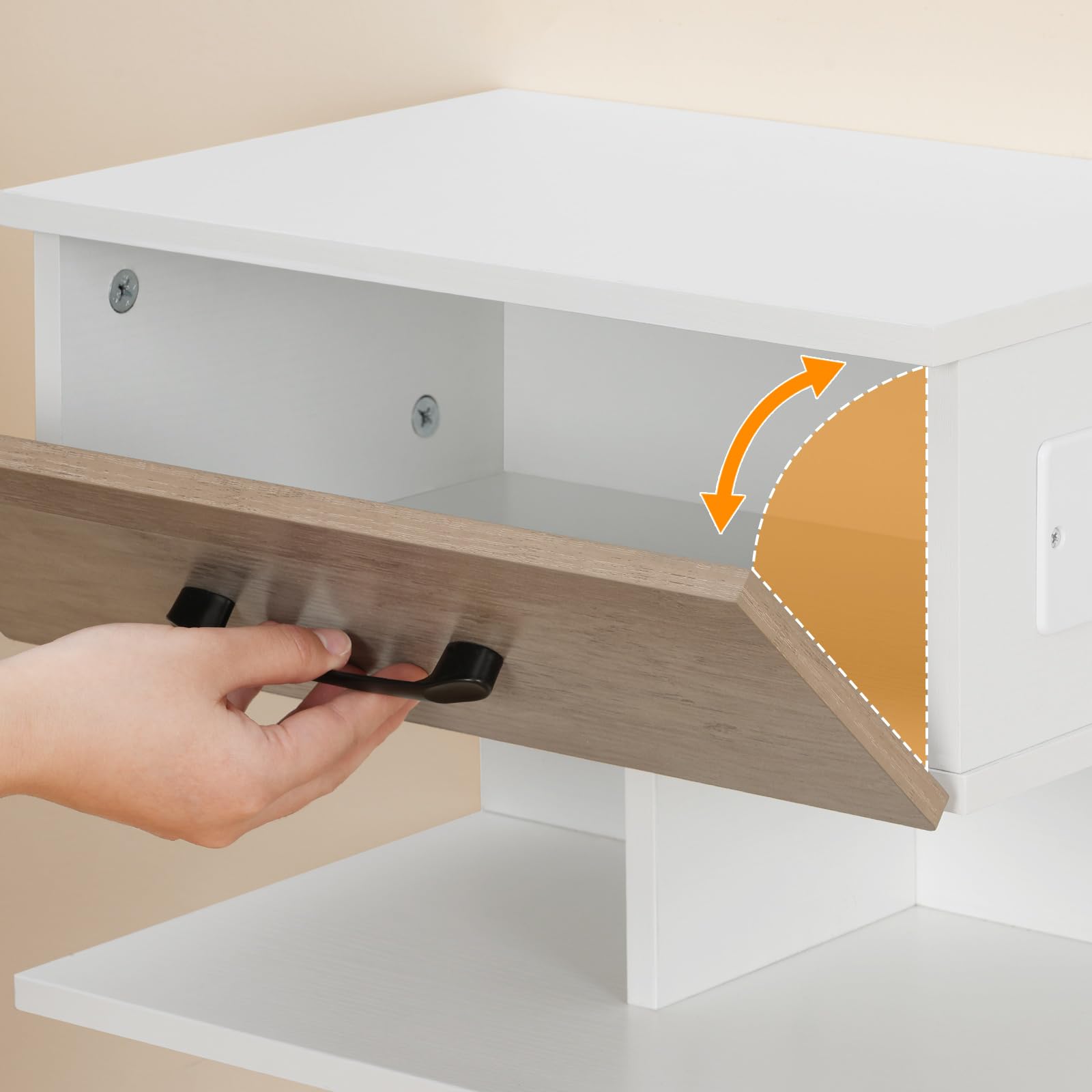 - Montage à deux sens : Cette table de nuit peut être installée à deux sens, permettant l’ouverture du tiroir rabattable de manière adaptable, soit vers le haut, soit vers le bas. Vous pouvez l’installer de façon flexible selon vos préférences