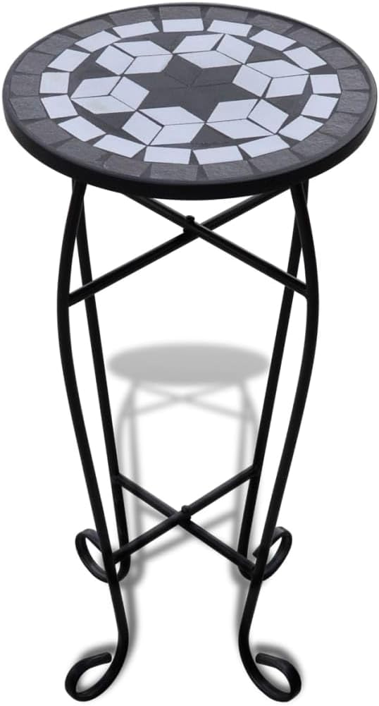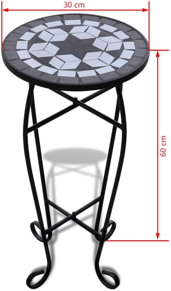 Cette table pour plantes a un dessus de table en mosaque résistant aux intempéries et des pieds courbes élégants. Elle deviendra sûrement un accroche-regard dans votre jardin, sur votre balcon, terrasse, etc. Avec un diamètre de 30 cm, la table peut également être utilisée comme table d'appoint pour reposer vos boissons. Son cadre en fer contribue à la robustesse, tandis que le dessus de table en céramique est également facile à nettoyer. Elle est très durable pour une durée d'utilisation à long terme. Veuillez noter que ce produit ne convient pas pour être laissé à l'extérieur dans des conditions froides. Couleur : noir et blancMatériau : tube de fer + carreau de céramiqueDiamètre du dessus de table : 30 cm Hauteur de la table : 60 cmRemarque : il ne convient pas de le laisser au froid