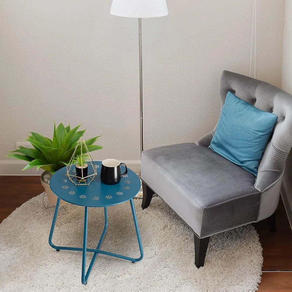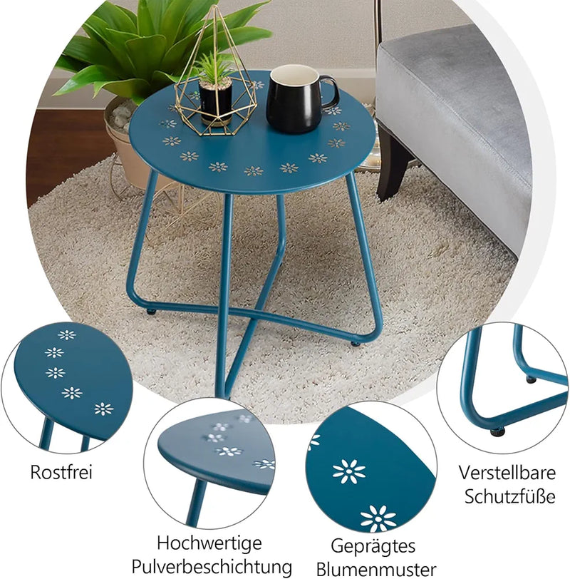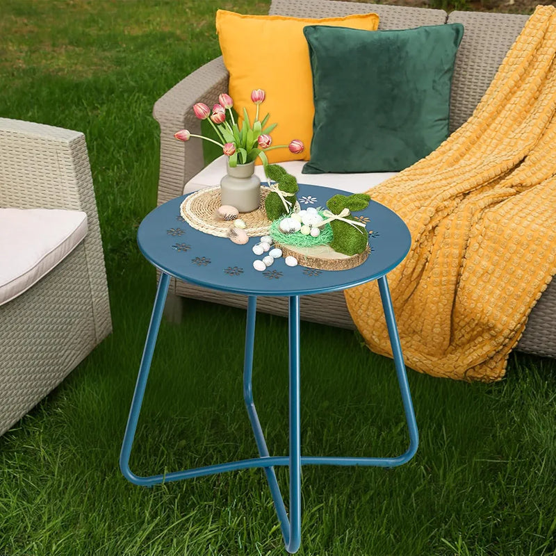 danpinera Table d'appoint d'extérieur avec découpes de fleurs, table d'appoint de patio en acier résistant aux intempéries, petite table d'appoint ronde en métal pour terrasse, cour, balcon, jardin, bleu marine