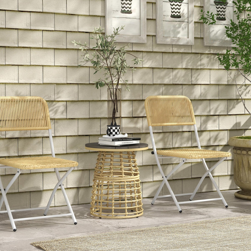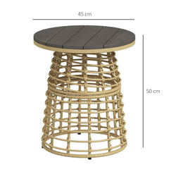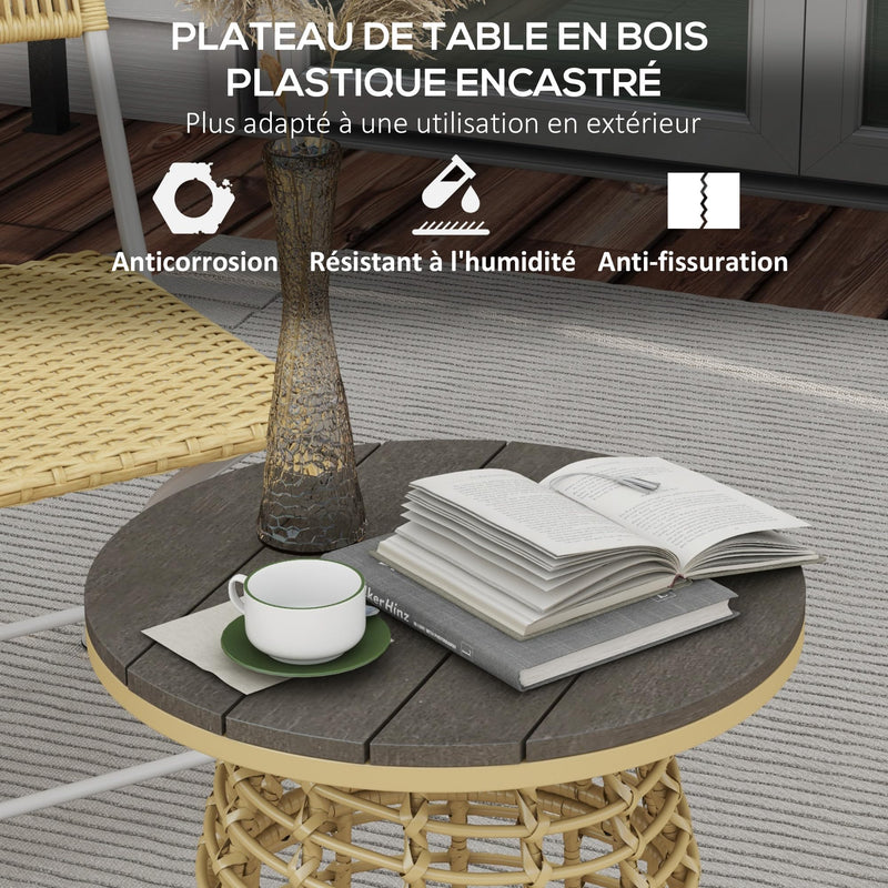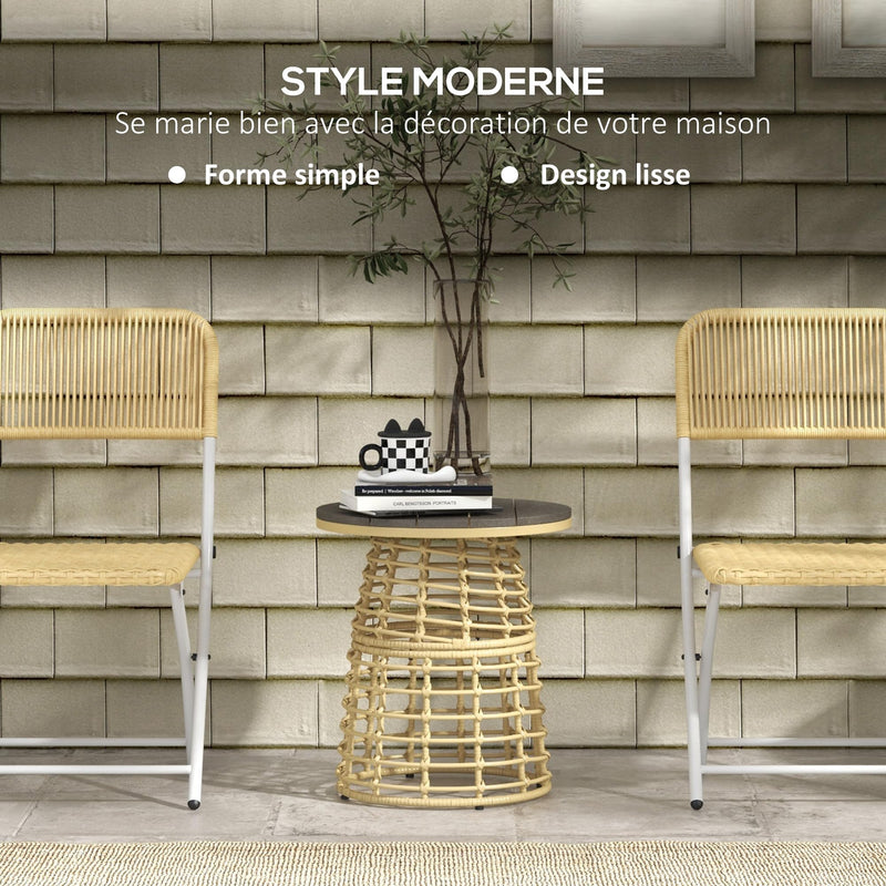 - DESIGN : Un table ronde pratique qui s'inscrit dans la tendance. Composée d'un pied en résine aspect rotin, la jolie table basse est parfaite pour compléter tout mobilier extérieur et créer un espace cosy
