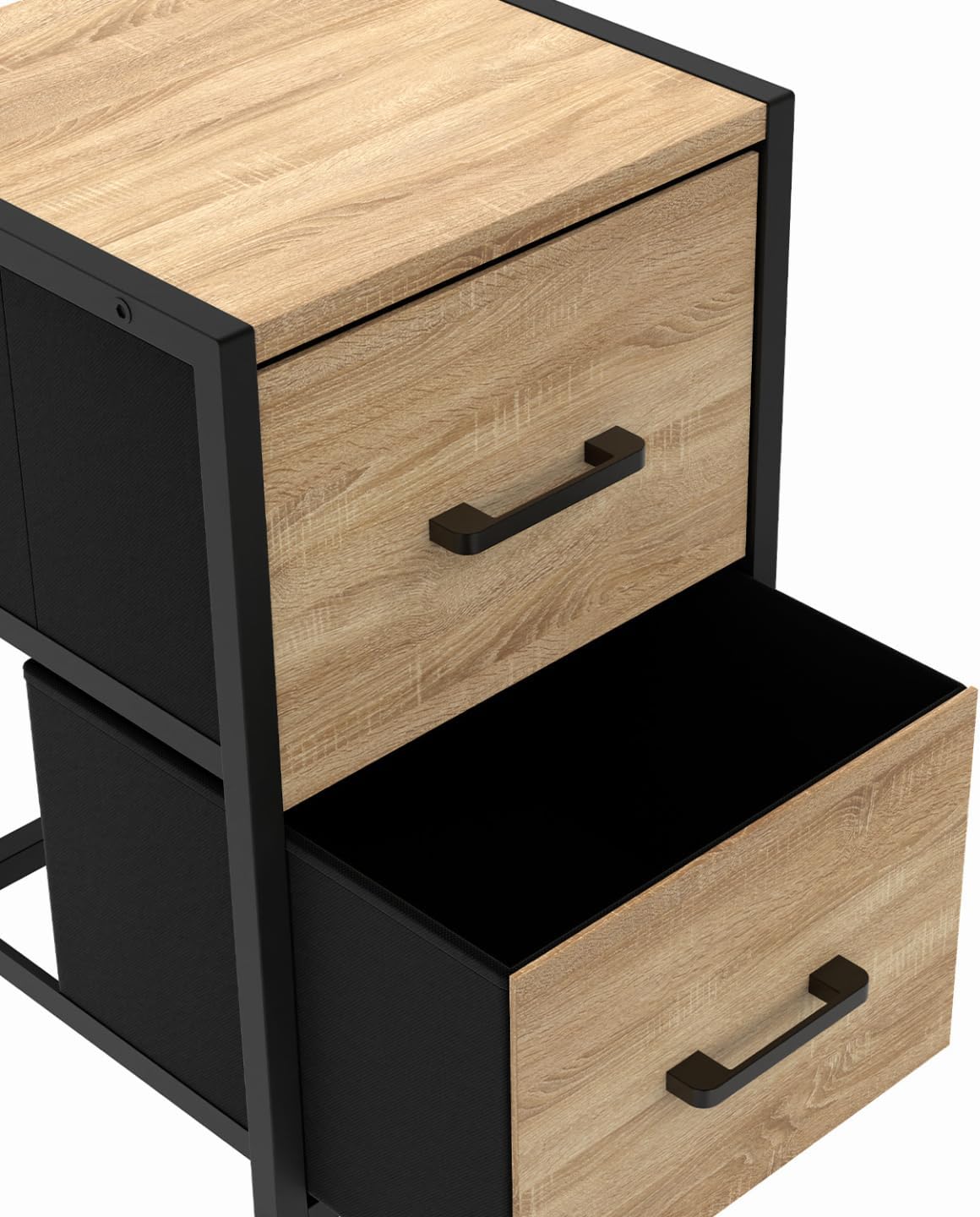 - 2 larges tiroirs de 26 x 29 x 18.5 cm en tissu avec une façade en PB effet bois pour un rendu design